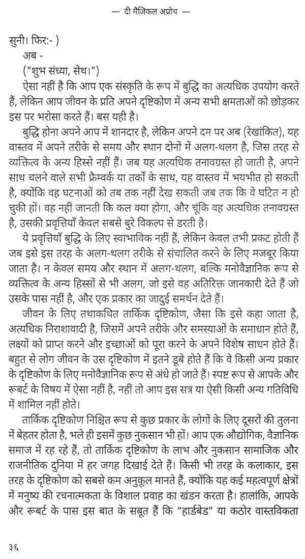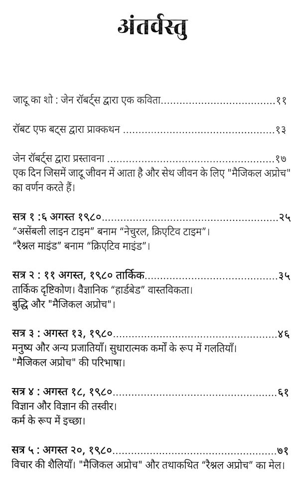 सेथ पुस्तकें वास्तविकता की प्रकृति पर लिखी गई अब तक की सबसे गहन रचनाओं में से एक हैं। विश्व प्रसिद्ध मूल सामग्री की इस नई किताब में, सेथ हमें दुनिया को एक और दृष्टिकोण से देखने के लिए आमंत्रित करते हैं - एक "मैजिकल अप्रोच"। सेथ हमारी वास्तविकता के गहरे स्तरों की जादुई प्रकृति को प्रकट करते हैं, और बताते हैं कि कैसे हमने इसे अपने स्वयं के विश्वासों और पारंपरिक सोच से बाधित होने देते हैं। "दि मैजिकल अप्रोच" हमें एक जादुई दृष्टिकोण सिखाती है, कि कैसे अपने जीवन को सहज, रचनात्मक और अपनी प्राकृतिक लय के अनुसार जीना है।