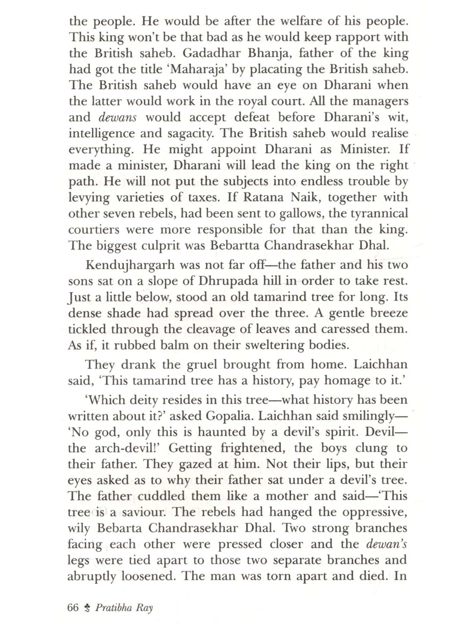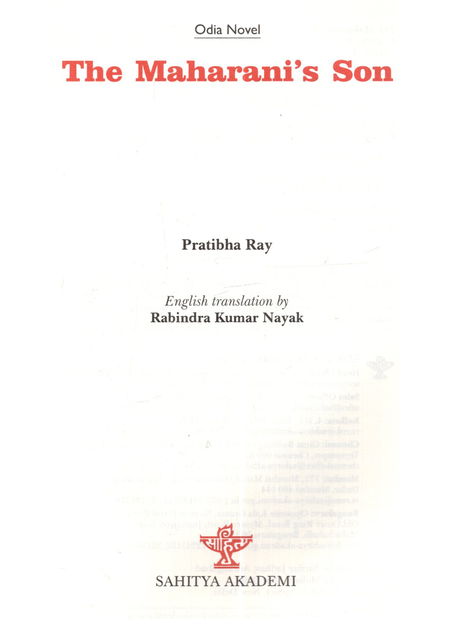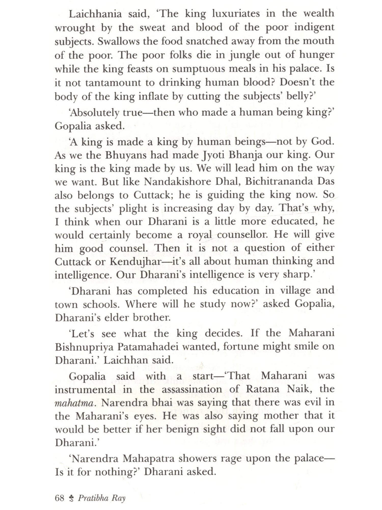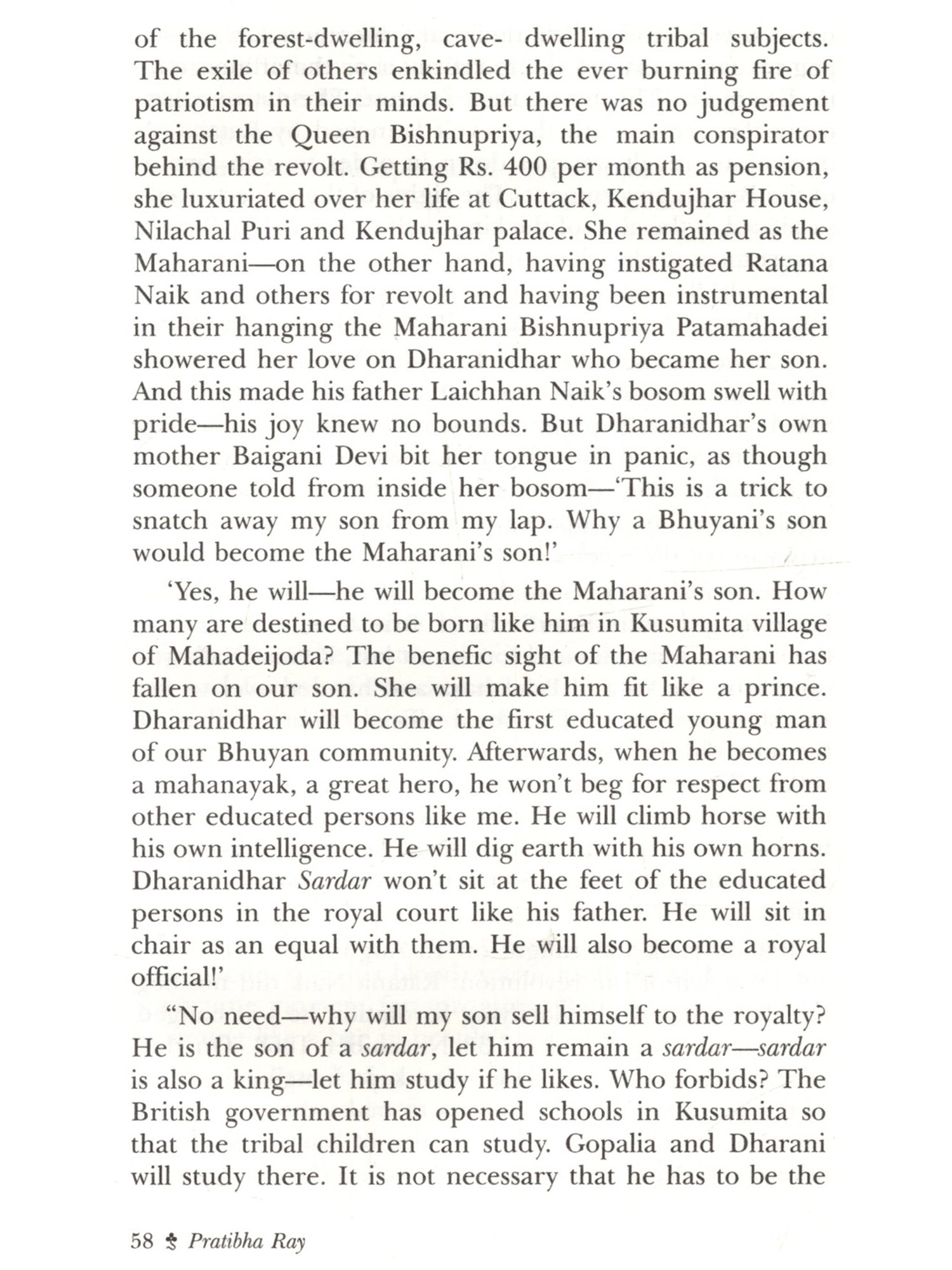 This novel The Maharani's Son (Maharani Putra) by Pratibha Ray is based on the historical agitation by the marginalised Dalits, spearheaded by Dharanidhar Naik, himself a tribal, against the tyrannical monarchy of Kendujhar, a feudatory state in Odisha in the last part of the nineteenth century. The post-colonial fictionalisation of this rebel hero's life and achievement gives an eloquent tongue to the feeble. smothered voice of dissent against exploitation. This novel, based on such a rebellion, is expected to contribute to Dalit literature in the Indian context today. The novelist has employed the omniscient method to narrate the evolution of Dharanidhar as son of Nature, as leader of the tribals, as the Maharani's son and the ill-fated leader betrayed by Phakirmohan Senapati, Dewan of the king of Kendujhar, a prisoner incarcerated in Katak jail, a devotee singing devotional songs in front of the temple of Lord Jagannath at Puri and a sannyasi spending his last days at Aali and finally breathing his last there on 16 May 1914. Thus, a hero disappears not in the limbo of oblivion, but remains redolent in the Hall of Fame of History. This novel is a rare creation of Odia literature in which the two charismatic leaders, Phakirmohan Senapati and Dharanidhar Naik shine with their illuminating vision and magnificence.