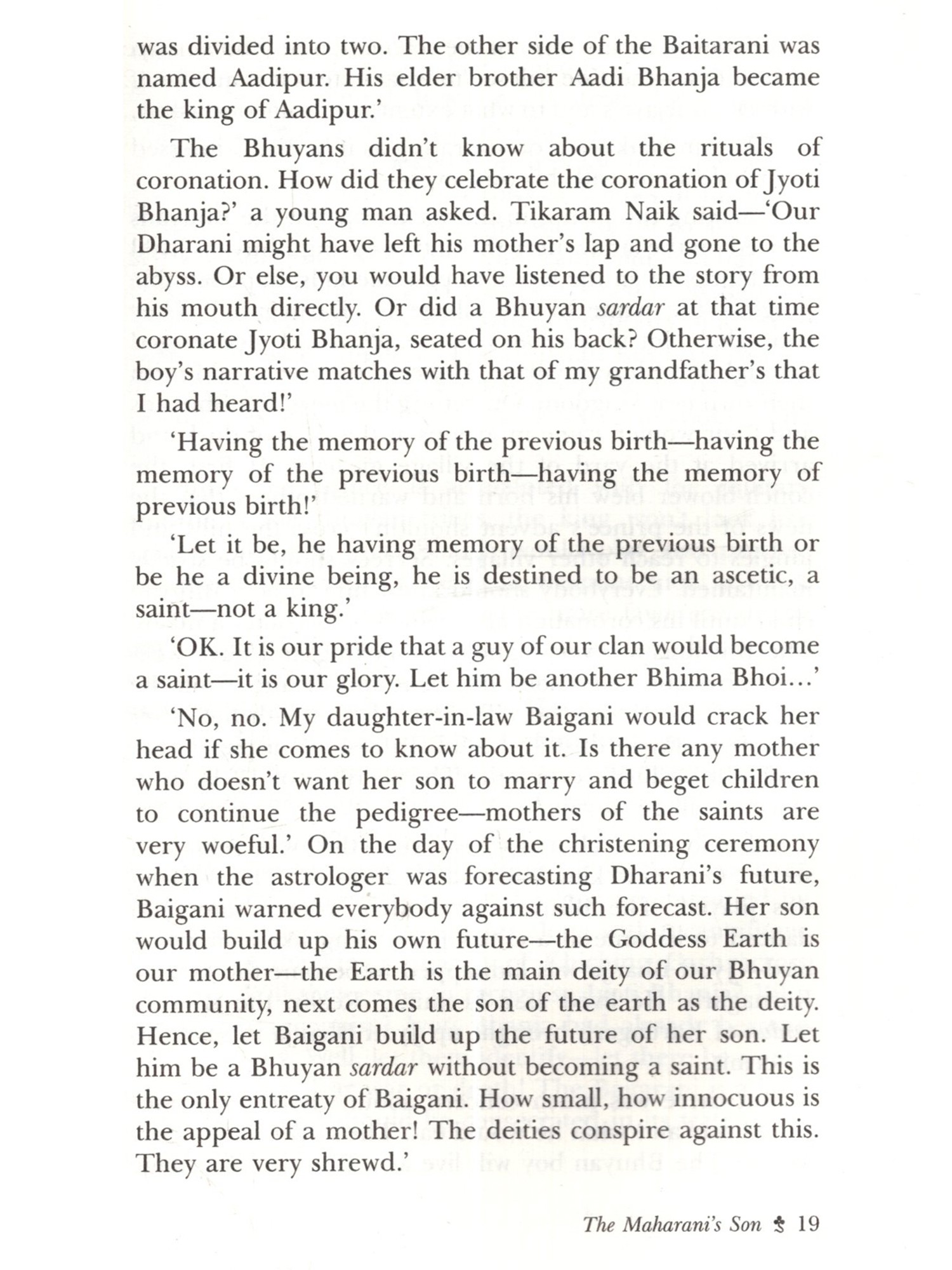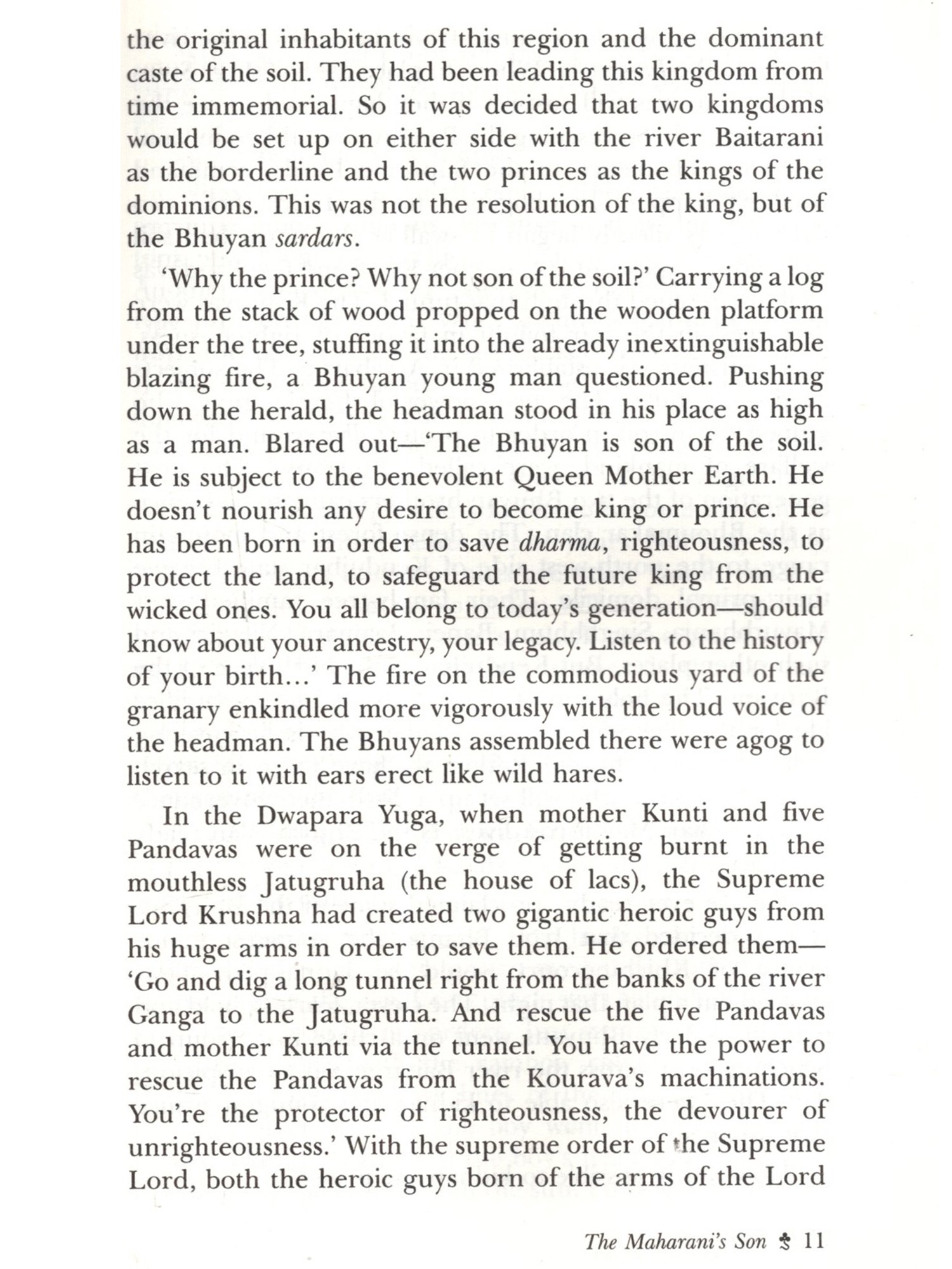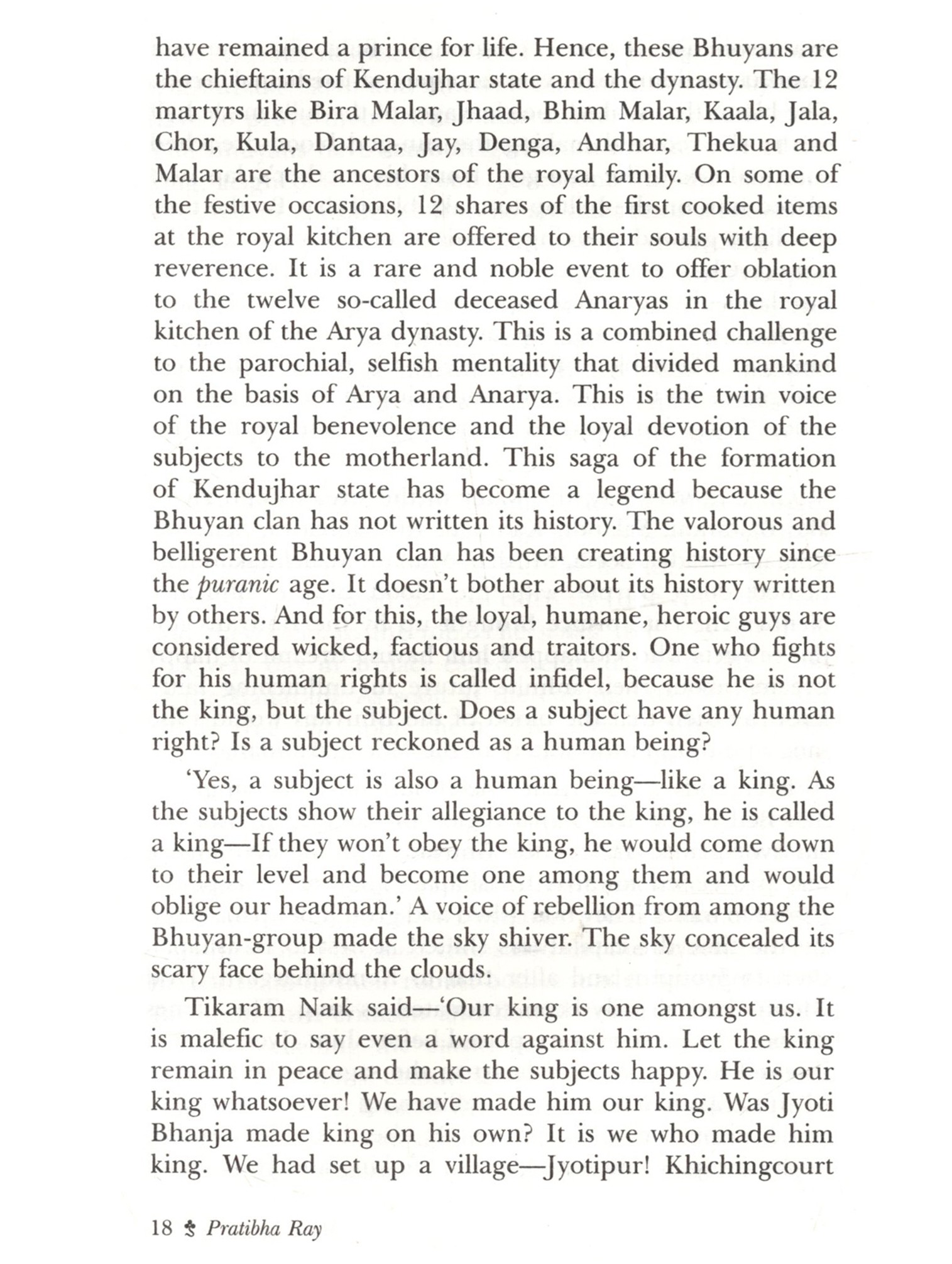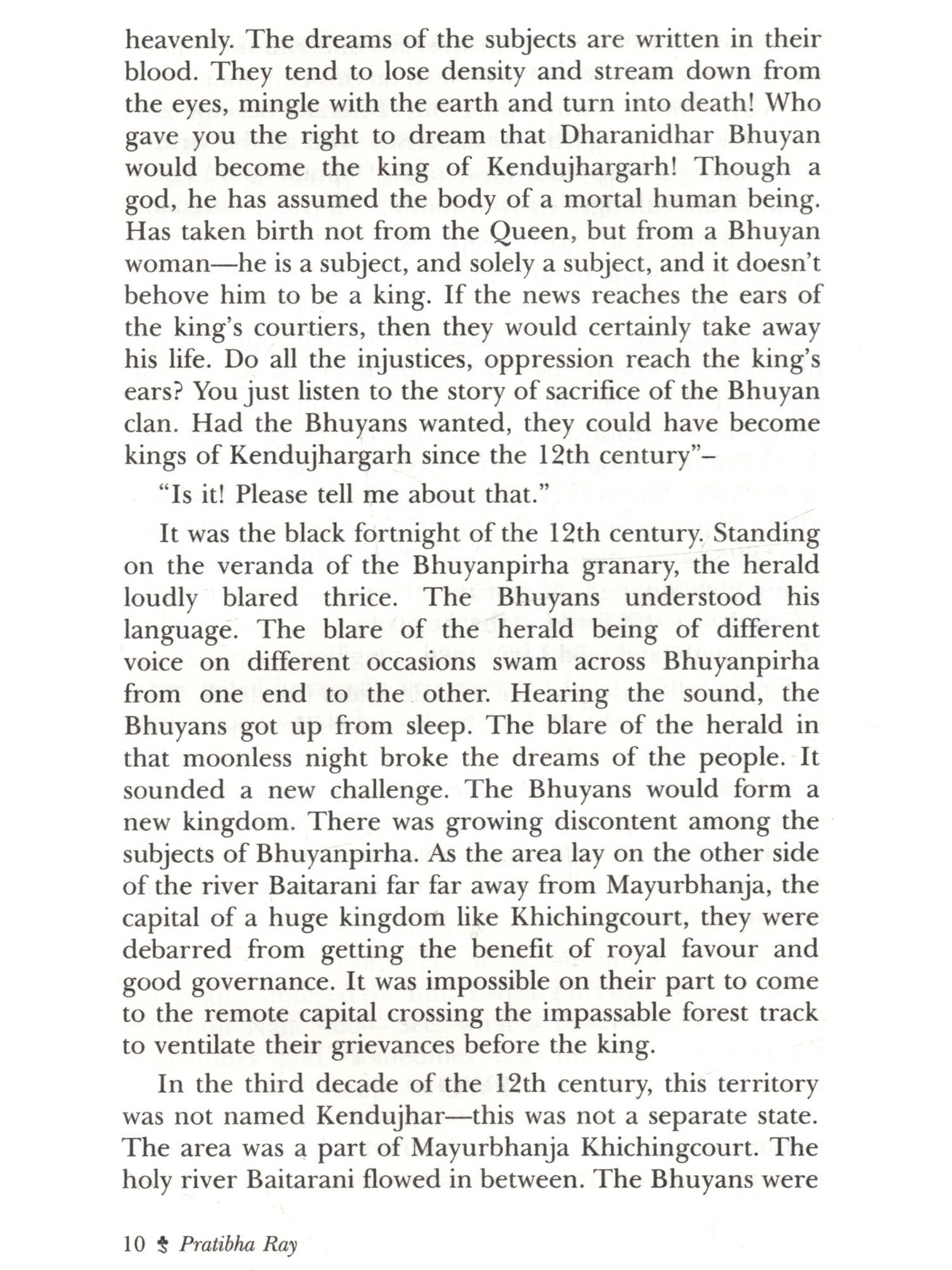 This novel The Maharani's Son (Maharani Putra) by Pratibha Ray is based on the historical agitation by the marginalised Dalits, spearheaded by Dharanidhar Naik, himself a tribal, against the tyrannical monarchy of Kendujhar, a feudatory state in Odisha in the last part of the nineteenth century. The post-colonial fictionalisation of this rebel hero's life and achievement gives an eloquent tongue to the feeble. smothered voice of dissent against exploitation. This novel, based on such a rebellion, is expected to contribute to Dalit literature in the Indian context today. The novelist has employed the omniscient method to narrate the evolution of Dharanidhar as son of Nature, as leader of the tribals, as the Maharani's son and the ill-fated leader betrayed by Phakirmohan Senapati, Dewan of the king of Kendujhar, a prisoner incarcerated in Katak jail, a devotee singing devotional songs in front of the temple of Lord Jagannath at Puri and a sannyasi spending his last days at Aali and finally breathing his last there on 16 May 1914. Thus, a hero disappears not in the limbo of oblivion, but remains redolent in the Hall of Fame of History. This novel is a rare creation of Odia literature in which the two charismatic leaders, Phakirmohan Senapati and Dharanidhar Naik shine with their illuminating vision and magnificence.