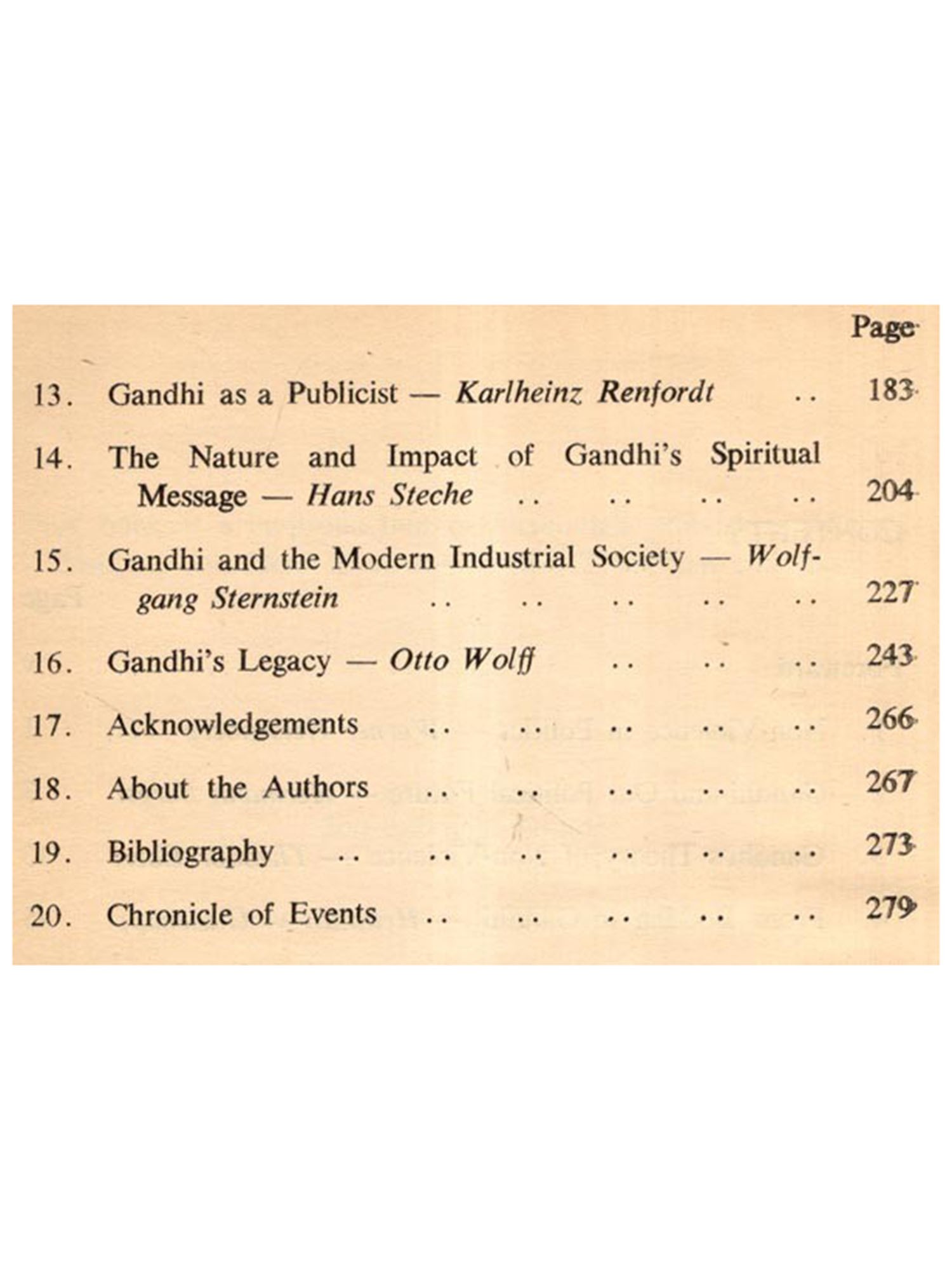 All who have written on Gandhi in this volume approach the phenomenon as sober people of the twentieth century which is fast approaching its end and which does not leave many illusions on the course of this world. They are not prejudiced by ideological ideas; on the contrary, they try to let facts speak for themselves. They balance the light and dark side; they judge successes and failures. They do not paint the Mahatma with the halo of an idealised hero or saint, but understand him as a practical idealist, in the manner in which he wanted himself to be under-stood. The picture, which is created by such unprejudiced elucidation from many sides, is transparent. It points to quite a number of realistic individual features and captivates us by its empathetical genuineness increasing the intensity of its radiating power.