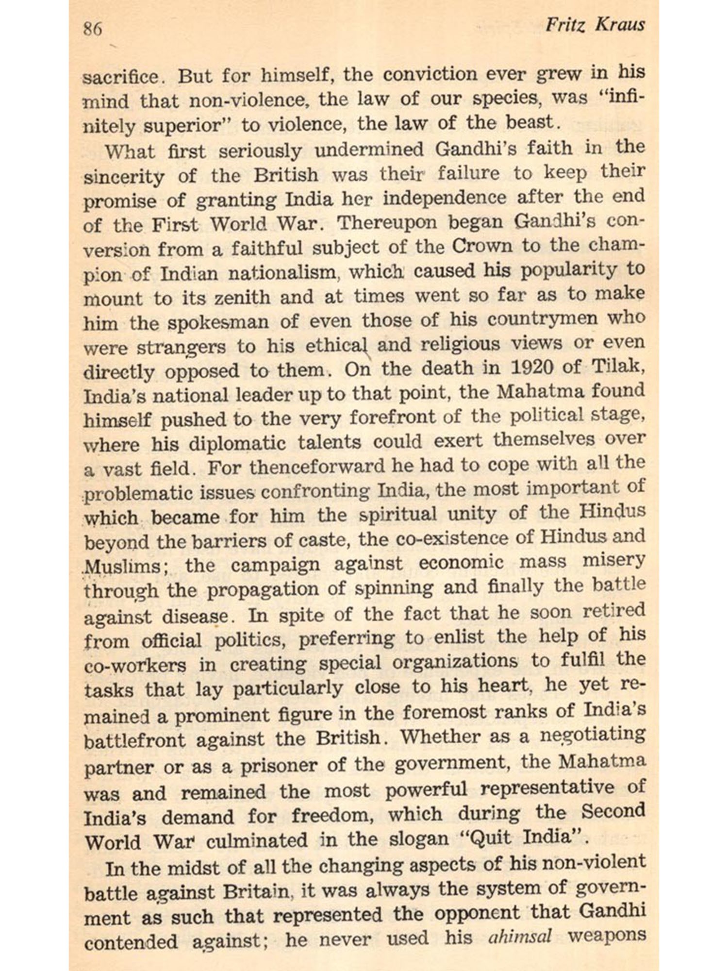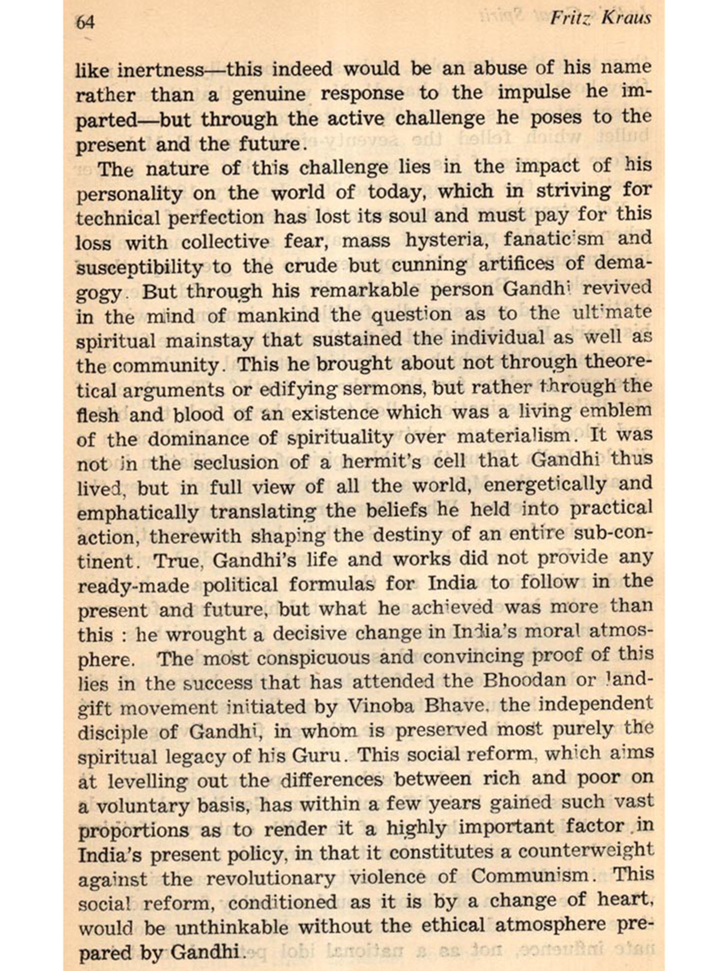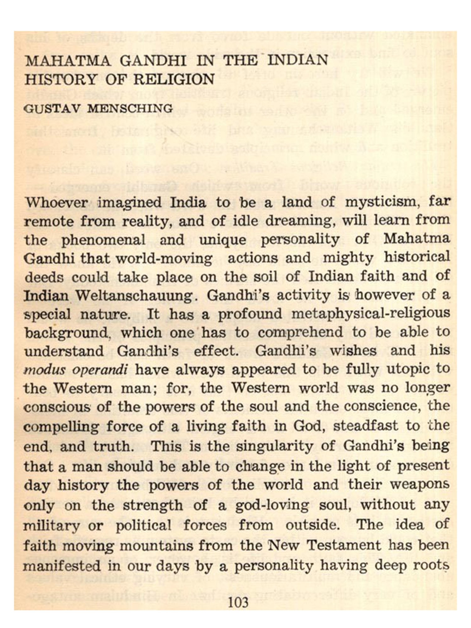 The European, however, thinks of the overpowering figure of Gandhi in other dimensions. Gandhi has not affected European history by storm with a roll of thunder or with a stroke of lightning. It is rather, if we wish to continue in figure of speech, a sheet-lightning the distance of the long duration which has not been extinguished till today, a light in the East, which lures you into its spell again and again.