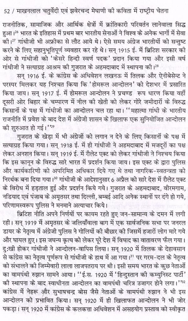 दूसरे अध्याय में आलोच्य दोंनों कवियों माखनलाल चतुर्वेदी एवं झवेरचन्द मेघाणी के कविता की पृष्ठभूमि को विस्तार के साथ प्रस्तुत किया है। जिस युग में दोनों कवियों ने लेखनी ऊठाई, वह युग स्वतन्त्रता के लिए लड़े जा रहे संग्राम का युग था। हमने यहाँ पर राष्ट्रीय आन्दोलन के इतिहास को विस्तार से राजनीतिक, सामाजिक, धार्मिक, आर्थिक, सांस्कृतिक तथा साहित्यिक आदि शीर्षकों के साथ प्रस्तुत किया है।