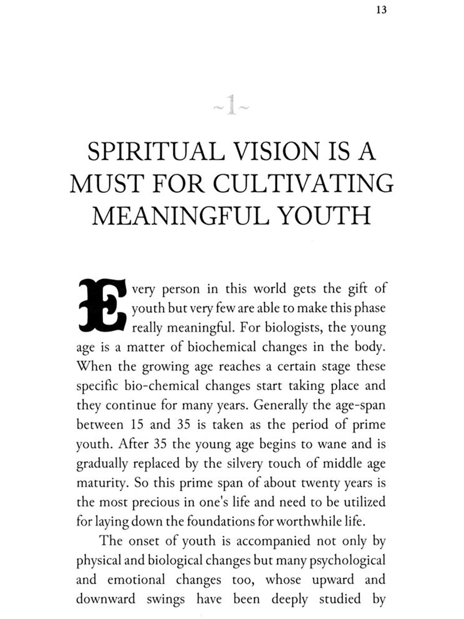 A s spring is the most vibrant and verdant amongst the seasons, so is youth in the changing phases of life a fountainhead of joy, enthusiasm, valor and courage. Self-disciplined youth committed to noble ideals are a source of inexhaustible energy leading to ever higher progress and prosperity. History bears testimony to the fact that youth have always established new benchmarks with their wisdom, courage, indomitable energy and strong willpower be it the domain of materialism or spirituality. Indeed, whatever bright chapters are found in the history of the world, they have been written by the youth.