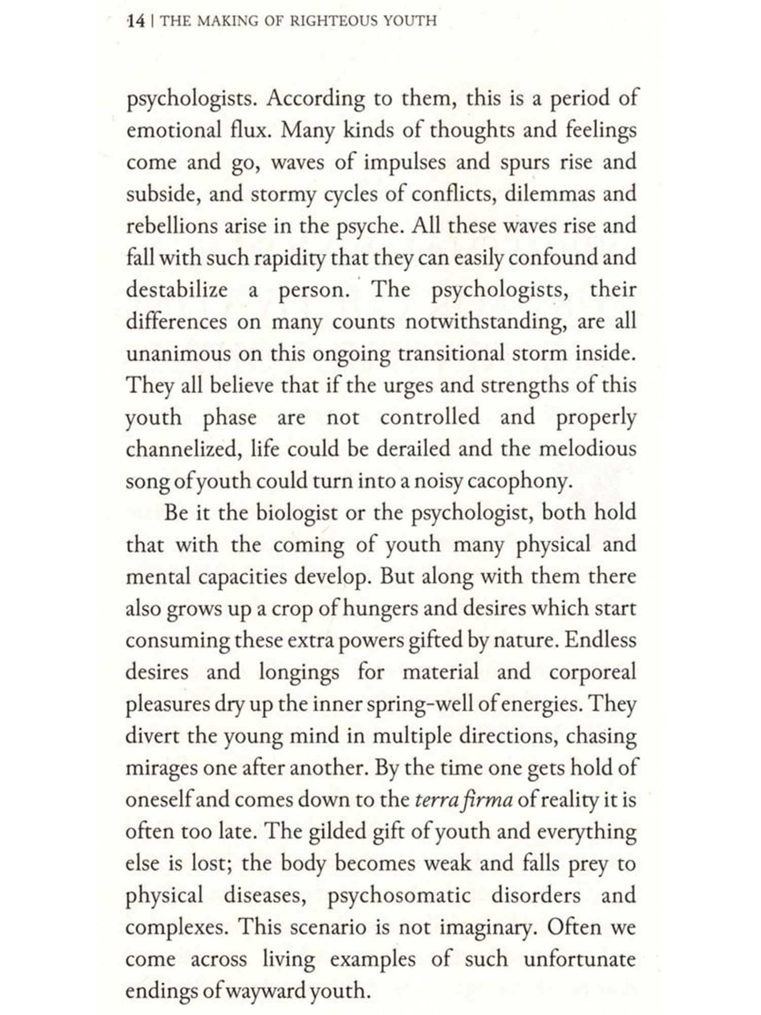 Unfortunately, at present we are passing through a dark period of cultural debauchery. Materialistic consumerism and self-indulgence are on their climax; and directionlessness, evil tendencies and lack of creativity are making our young generation hollow from within. Over and above that unemployment, drug abuse, and western style of living are draining off their energies. In such a dismal situation, it becomes essential to acquaint the youth of our nation with our cultural heritage and make them realize the true purpose of their lives. What is needed for a bright future in the twenty-first century is the total transformation of the present way of life - from crass materialism to life-affirming spirituality.