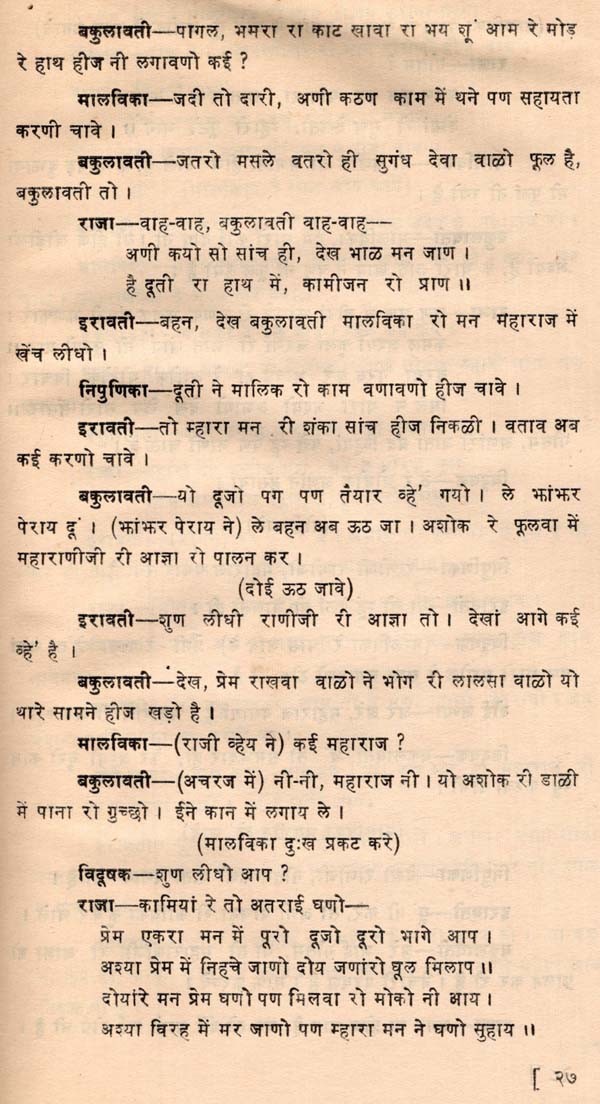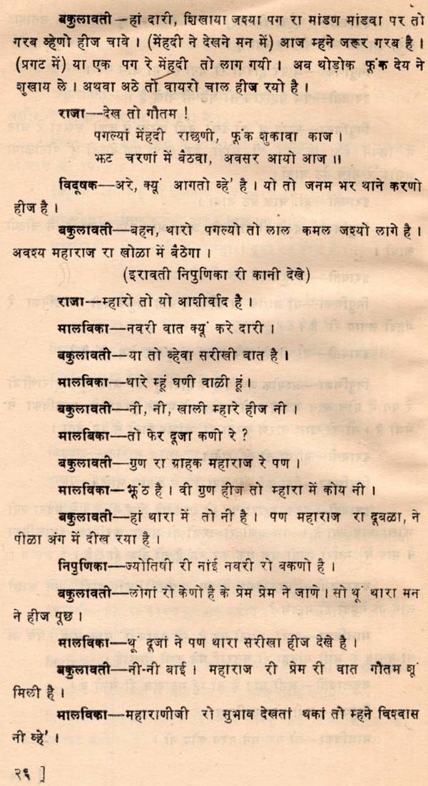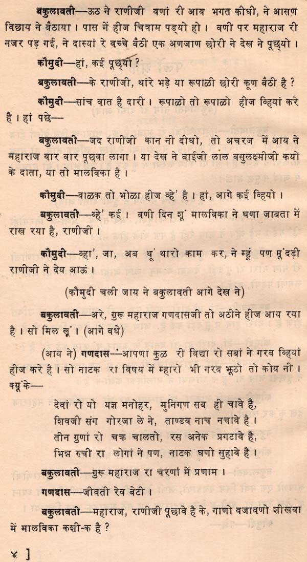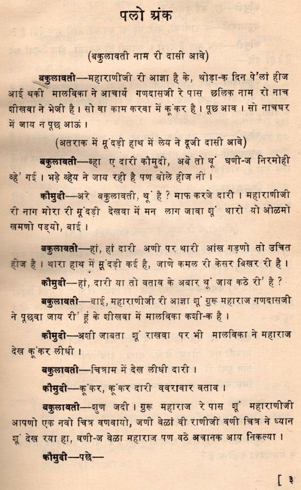 राजा अग्निमित्र है एक धारिणी पटराणी ही, ने दूजी इरावती ही। माधवसेन आपरी बहन रो विवाह अग्निमित्र रे साथ करणो चावतो हो । माधवसेन रे काकारो बेटो यज्ञसेन अग्निमित्र सू' वैर राखतो हो, नै माधवसेन नै हटाय ने खुद राजा वण बेठो हो। माधवसेन रे मंत्री सुमति आपणे मालिक री इच्छा र अनुसार मालविका नै आपणी बहन कौशिकी रै साथ अग्निमित्र र पास पहुंचाय देणो चावतो हो, सो दोयां ने लेय नै विदिशा जावा वाला संघ में मिल गयो। भाग्य री बात। मार्ग में डाकुवां डाको न्हायो, नै संघ रा लोग तितर बितर व्हे गया। बठे डाकुबां सू' जूझतो थको सुमति मार्यो गयो, नै कौशिकी मूच्छित व्हे गई। जदी वीने चेत आयो, तो पास में मालविका ने नी देखी। भाई सुमति ने जलाय ने कौशिकी मालविका ने ढूंढती ढूंढती विदिशा में पहुंची, नै निराश व्हेय ने बठे हीज साधपणो लेय लीधो । संयोगवश वा अग्निमित्र रा जनाना में पहुंच गई, नै महाराणी धारिणी री विश्वास पात्र वण गई ।