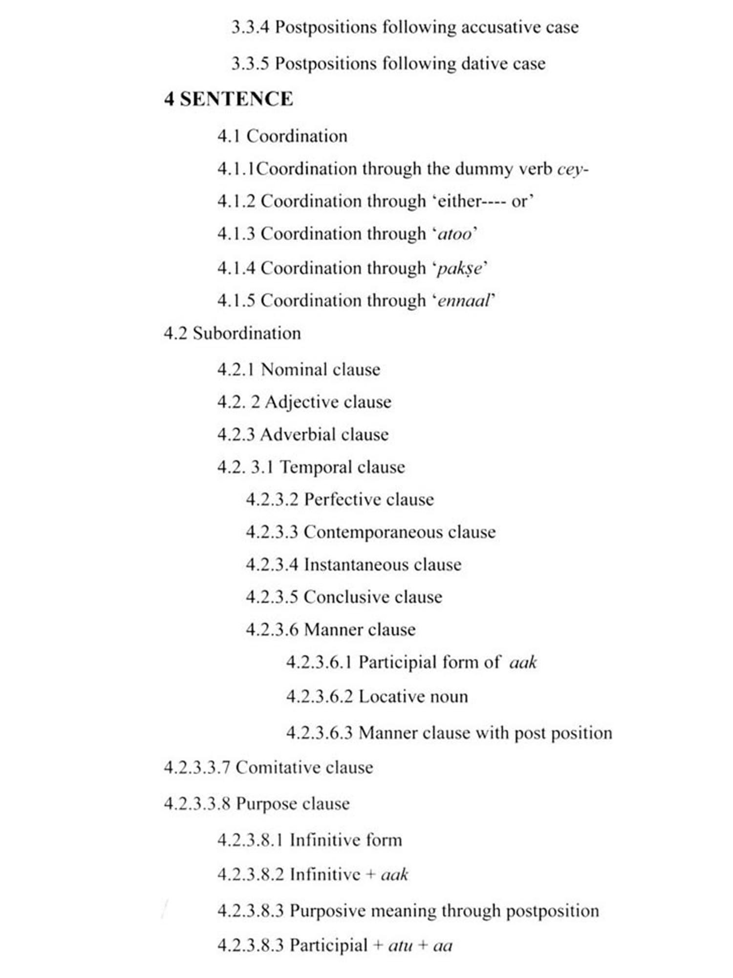 The author places on record his gratitude to the Council of Direction of the International School of Dravidian Linguistics, Thiruvananthapuram for taking up this work for publication. The author is also thankful to Prof. G.K Panikkar, Hon. Director of ISDL for reviewing the manuscript and offering his comments and suggestions.
