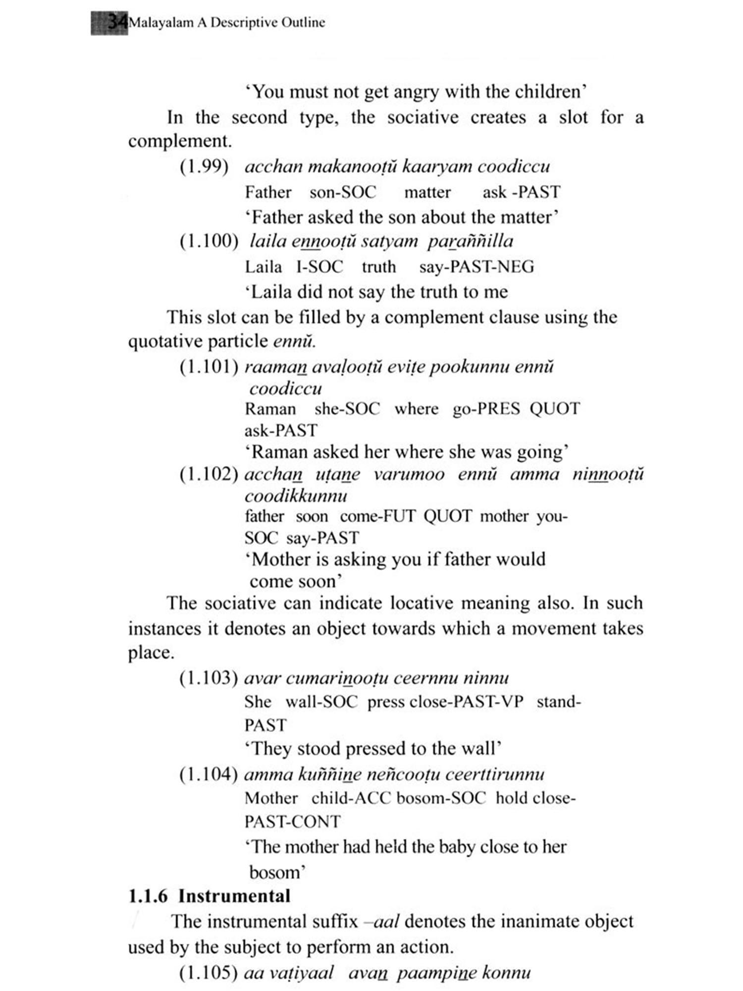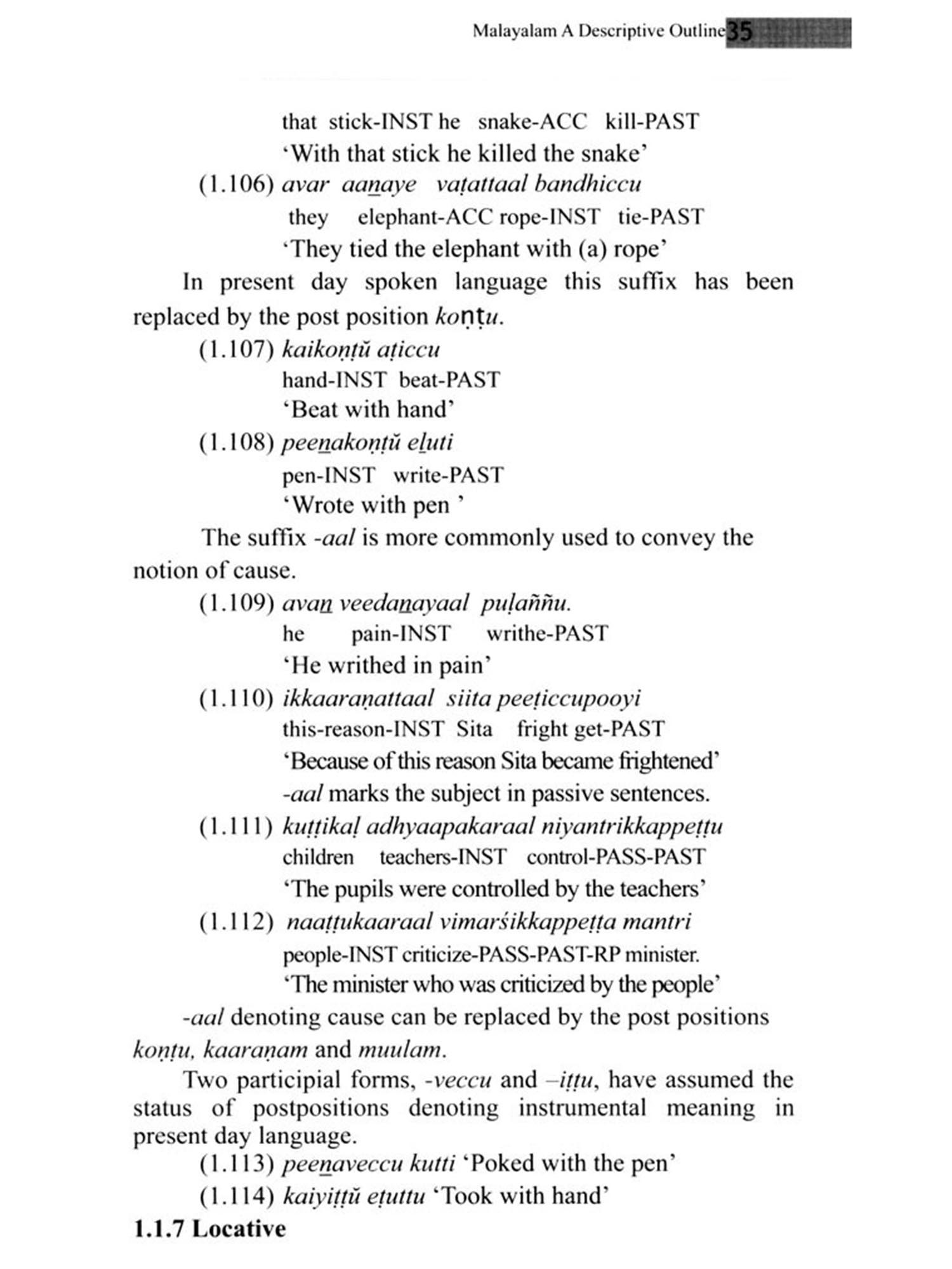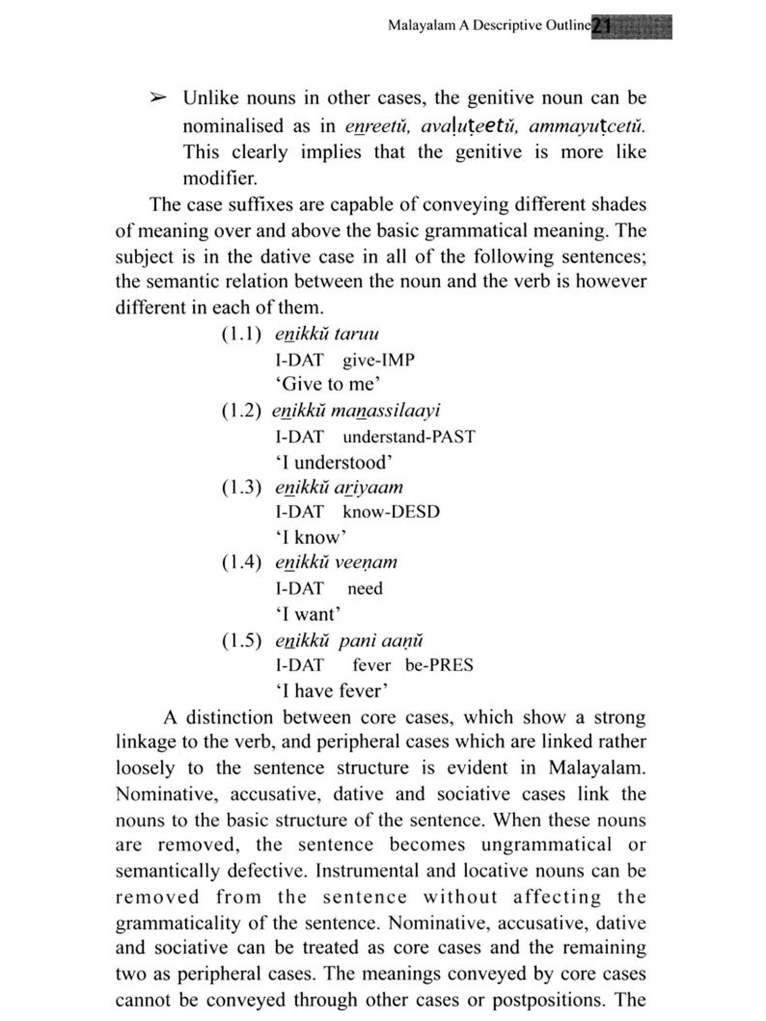 The grammatical tradition in Malayalam, compared to the three other major Dravidian languages, is neither extensive nor ancient. Liilaatilakam dated to the closing years of 14th century is generally considered as the earliest treatise referring to grammatical structures of Malayalam. This however is not a work of grammar as such, but is more concerned with elucidation of the features of Maniprvaalam, a literary language that was an admixture of Malayalam and Sanskrit. Except some brief treatises in Portuguese, Latin and English authored by missionaries, up to 19th century Malayalam did not have a proper grammar. Hermann Gundert's Malayala bhaşaa vyaakaranam first published in 1851 and the revised and enlarged version coming out in 1868 was the first proper grammatical treatise of Malayalam. Rev. George Mathen's Malayaalmayuțe vyaakaranam (1863), Pachu Mootthatu's Keeralabhaasaa vyaakaranam, A.R Rajaraaja Varma's Keerala paaniniiyam (originally published in 1896; revised and enlarged edition in 1917) and M. Seshagiri Prabhu's Vyaakaranamitram (1904) followed. Grammatical literature from this point of time was essentially focused on Keerala paaniniiyam, which came to enjoy almost the status of an 'authorised grammar of Malayalam. While Rajaraja Varma's work stands out by its breadth of coverage and rigorous analysis, it cannot be denied that grammatical tradition in Malayalam has remained too long within the ambit of a grammar written nearly a century back. A common grammatical tradition drawing on various grammars failed to evolve and consequently the framework of Keerala paaniniiyam continued as the sole grammatical model in Malayalam. The grammars written in the post- Keerala paaniniiyam period are essentially explanatory treatises on Rajaraja Varma's work. While a few grammarians have suggested alternative analyses in some areas, the grammars Varma. For a themselves faithfully follow the basic framework of Rajaraja period of more than 80 years from Keerala paaniniiyam, no grammarian attempted either to extend the Keerala paaniniiyam model to produce a more comprehensive treatment of Malayalam or to analyze the grammatical structure of Malayalam using alternative models of grammatical description. Keerala paaniniiyam and other traditional grammars have extensively covered the morphology of the language. However, there is precious little in them about syntax and semantics. Having to deal with the structure of a modern language like Malayalam using a restricted grammatical model has had serious repercussions in many fields. Researchers in the fields of Computational Linguistics, speech pathology and language teaching very often lament the absence of a more modern and comprehensive grammar of Malayalam, especially one that adequately covers syntactic and semantic aspects. From the 60's researchers in modern linguistics have published in many journals pertinent analyses on various aspects of Malayalam grammar. A modern full-fledged grammar of Malayalam was however, not attempted until 1997 when Asher and Kumari published Malayalam under the Descriptive Grammars series edited by Bernard Comrie. This work represents the most comprehensive and in-depth coverage of Malayalam available. Syntax, morphology and phonology of Malayalam are extensively covered drawing on the traditional views as well as modern linguistic analyses. Though not of the same scale, M.S Andrononv's Malayalam Grammar in Historical Treatment (1996) was also a siginificant attempt. In spite of these major works, various syntactic and semantic features associated with categories and structures of Malayalam remained to be analyzed. Vaakyadarśanam of Ravi Sankar S. Nair (Kerala Bhasha Institute 2011) was an attempt in this direction. The basic categories and structures of Malayalam are defined in this work followed by analyses of the syntactic and semantic features of each. Sentence structures and word formation mechanisms are also analyzed. The present work draws on Vaakyadarsanam. The first three chapters on Noun, Verb and Modifiers describe the semantic and syntactic features of each of these word classes. The sub-categories are extensively classified. The last chapter provides a description of the different sentence types in Malayalam. It is hoped that the present work will serve as foundation for more comprehensive and in-depth studies of various aspects of the grammar of Malayalam.