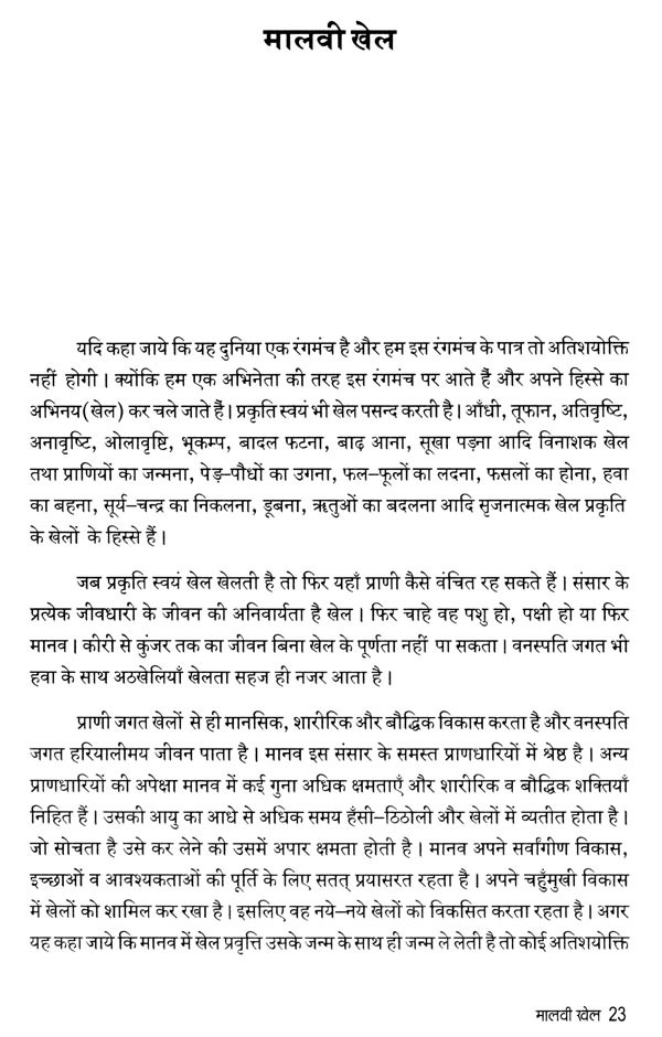 जहाँ-जहाँ इस धरती पर प्राणधारी है वहाँ-वहाँ संस्कृतियाँ विद्यमान हैं। फिर चाहे थलचर, नभचर हो या जलचर, इनमें मानवी संस्कृति सर्वोपरि हैं। मानवों में अनेकानेक संस्कृतियाँ फली-फूली हैं। यदि समझा और जाना जाये तो मानव की इन अनेक संस्कृतियों में से एक है-क्रीड़ा (खेल) परम्परा। जिसे जन्म से लेकर वृद्धावस्था तक वह अपनाता रहता है। संसार में यूँ तो असंख्य खेल है। परन्तु इस पुस्तक को एक विशेष भूखण्ड 'मालवांचल' की खेल परम्परा पर केन्द्रित किया गया है। मालवा भारत भूमि के मध्य में बसे मध्य प्रदेश के पश्चिमी भाग का भूखण्ड है, जहाँ अनेक जातिधर्म के लोग निवास करते हैं।