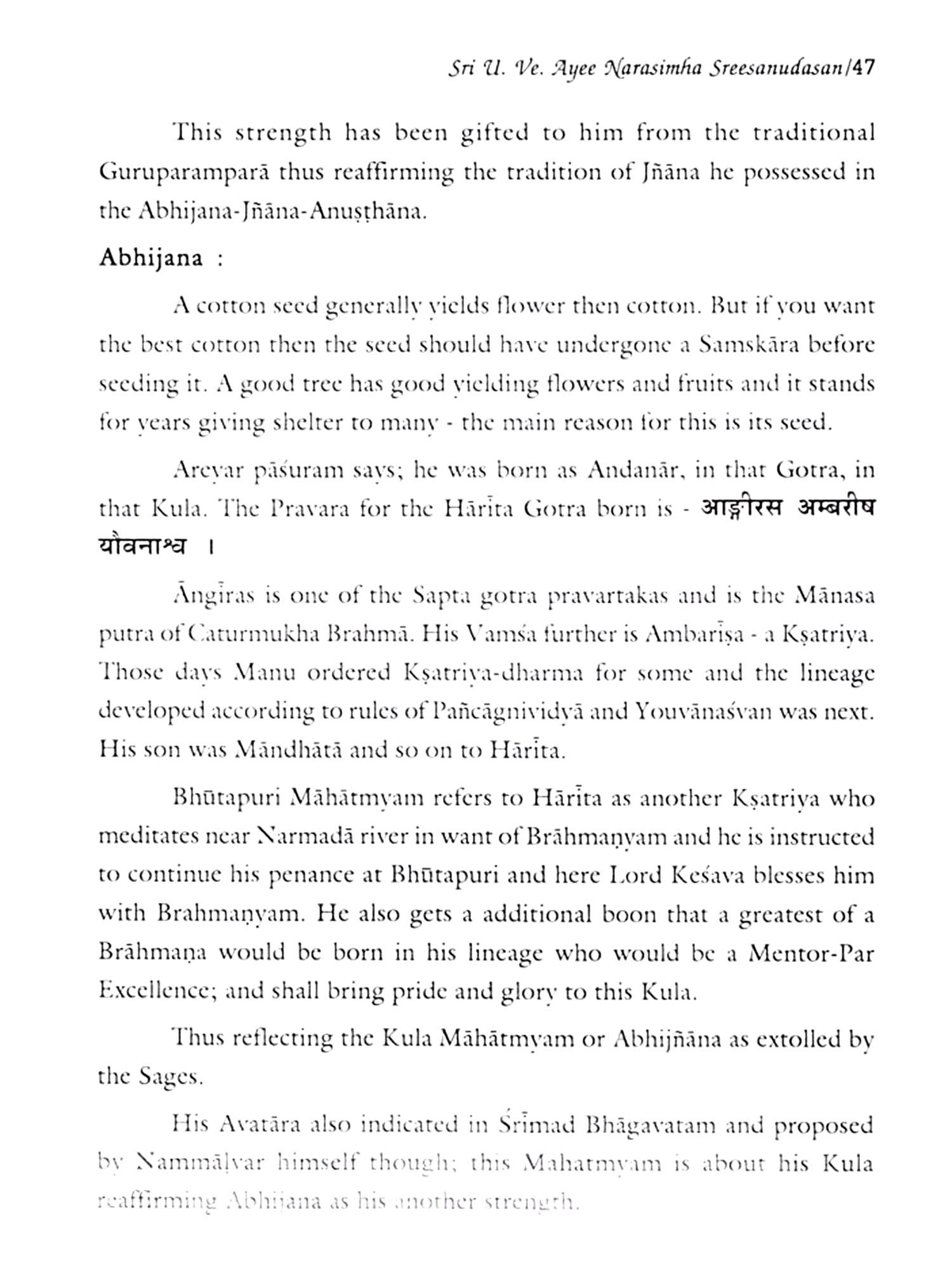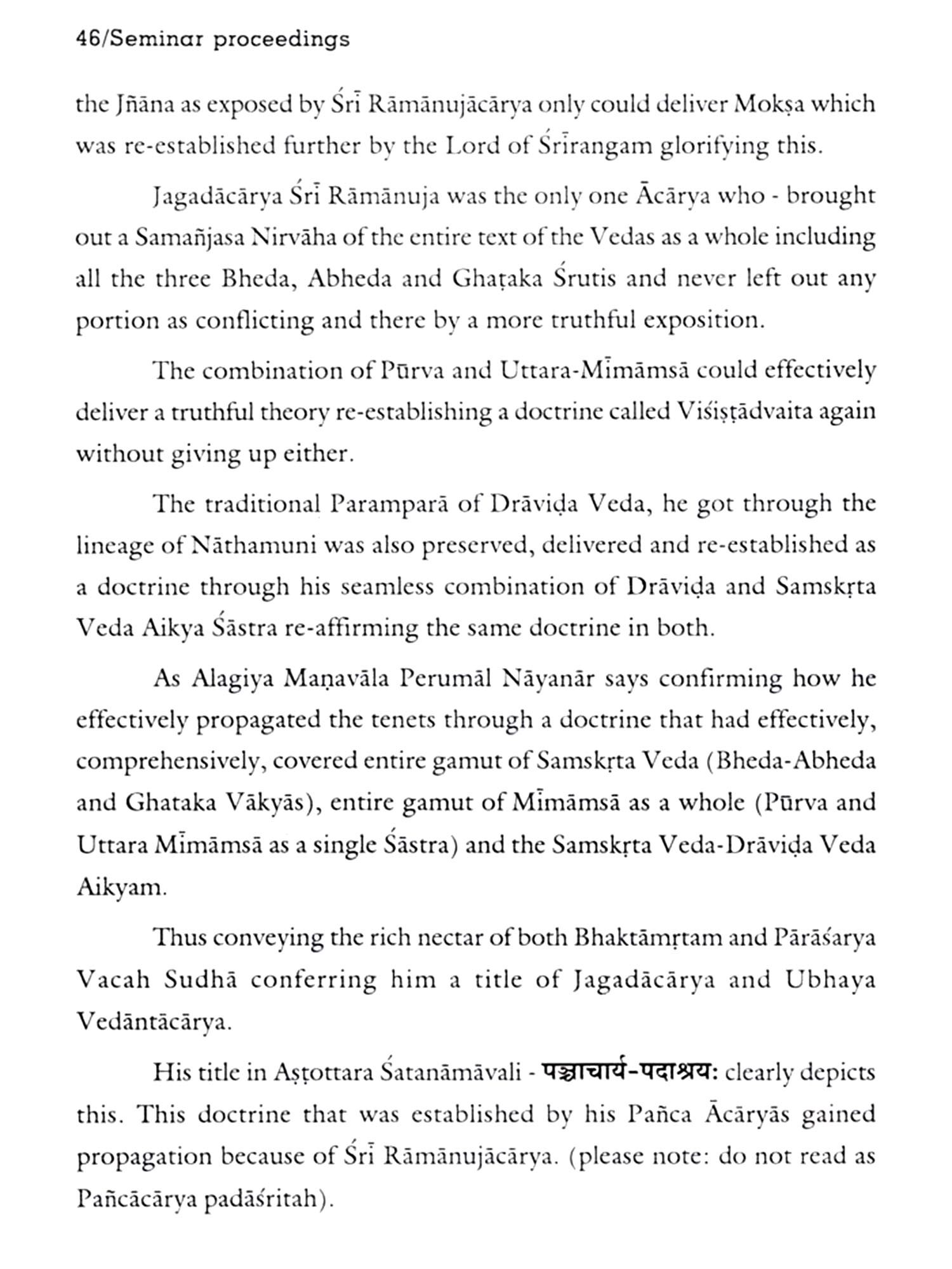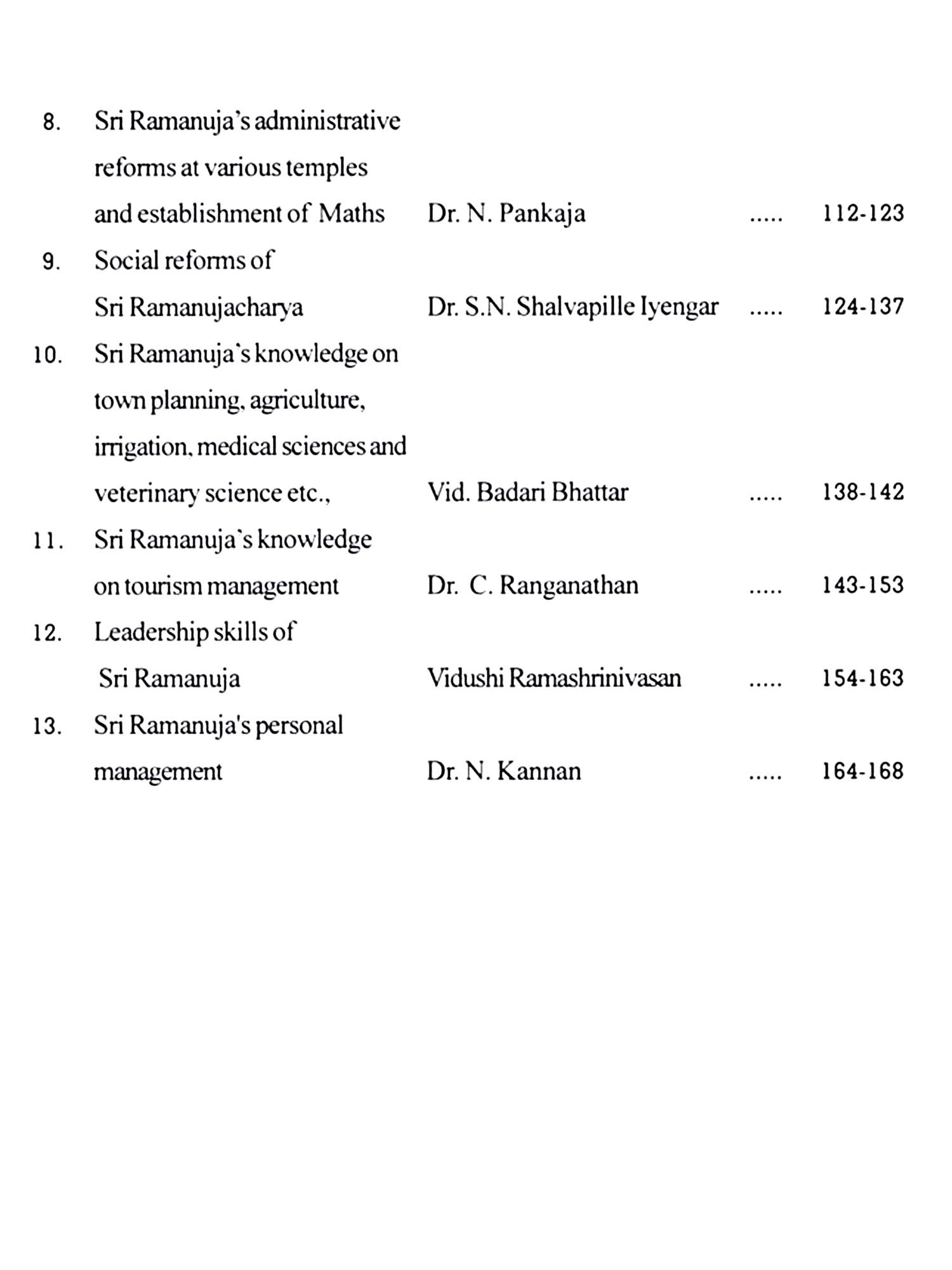 This book titled 'Managerial ability of Śri Rămănuja' is based on papers presented in a seminar held earlier on the same theme. I am happy to extend my heartfelt thanks to Vid. S. Kumara, Registrar, ASR Melkote, for his splendid efforts in organizing the seminar and also in publishing the book. I also wish to congratulate one and all for their part in making this endeavor a success.