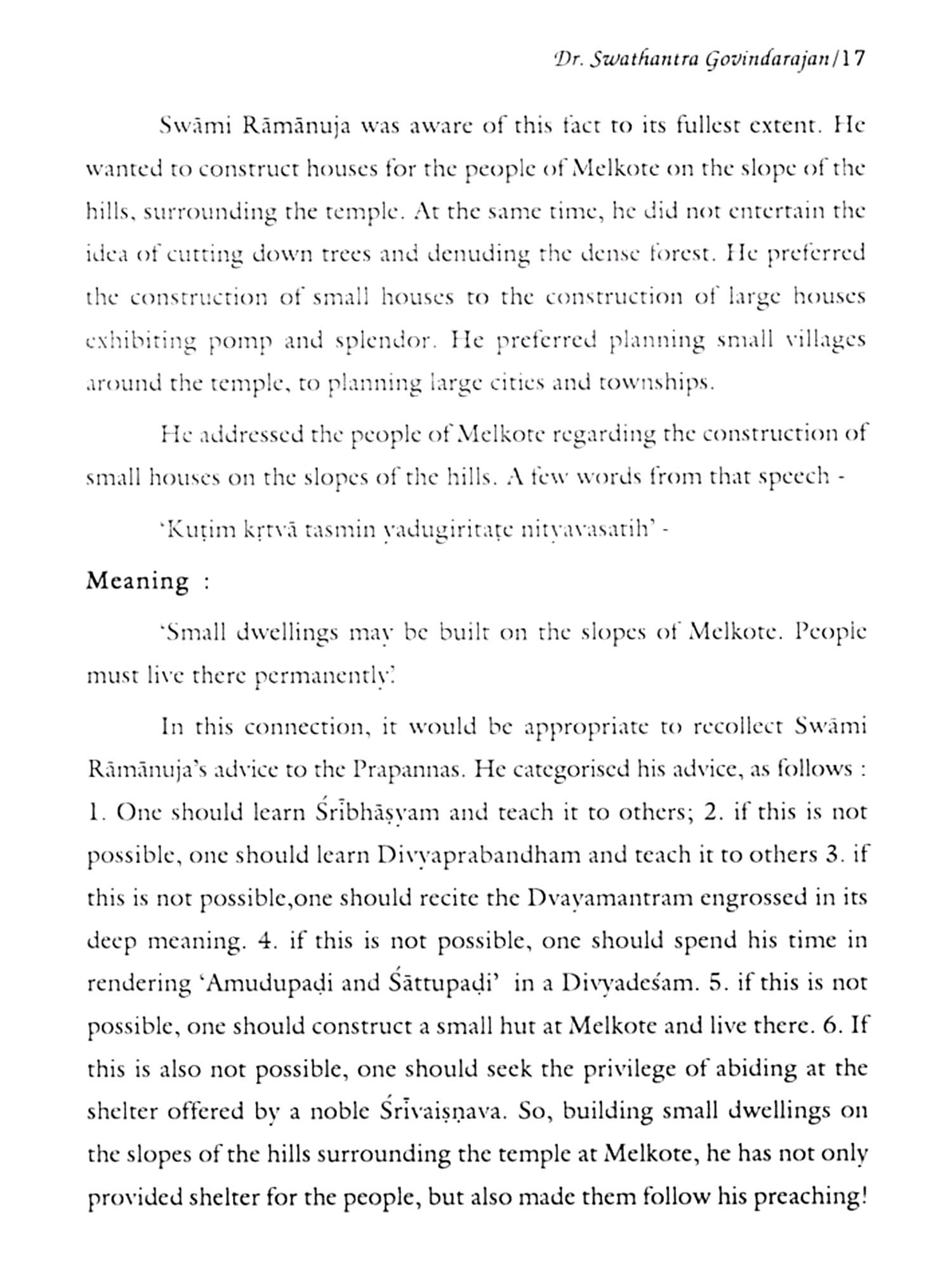 Bhagavad Ramanujacharya is a good example of such brilliant manager of Dharmic Instructions. Hence a national level seminar was organised to showcase the managerial ability of Ramanujacharya by ASR in Melkote in October 2015. Eminenr scholars had presented their papers on different aspects or Ramanujacharya's management theory. It is getting published as book at this juncture. I also thank Vid. R. Narayana Iyengar for his editorial efforts. I thank Smt. M.B. Bharati for her DTP work.