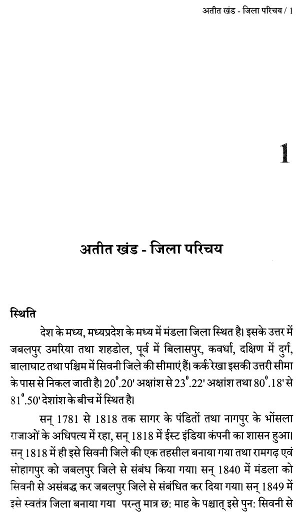 विंध्याचल पर्वत की उपत्यका में मेकल श्रेणी पर बसा यह जिला साल, सागौन, सरई, महुआ तथा आम्र वृक्षों के वनों से आच्छादित है। मंडला जिले की जीवन रेखा पश्चिमर्मोदधिगामिनी प्रातः दर्शनीया पतित पावनी नर्मदा यहाँ की पर्वत श्रेणी अमरकंटक से निकलकर सम्पूर्ण जिले को समद्विभागों में विभाजित करती अरब सागर में संगमित हो जाती है। गौर, छोटी महानदी, बालई, चकरार, मचरार, कुतरार, खरमेर, श्रीवनी, बुढ़नेर तथा बंजर नदियां इस क्षेत्र को जल से आप्लावित करती हैं। महिष, सूमर, सिंह, शार्दूल, गज यहाँ के वनों के पशु हैं। चक्रवाक, सकारण्ड, जलकुक्कुट, सारस, मोर, कीर यहाँ के आकाश में उन्मुक्त विचरण करते हैं। महर्षि अगस्त ने सर्वप्रथम अगमनीय विंध्याचल को पार कर यहाँ की वन्य जातियों से सम्पर्क किया था। गोंड, भील, बैगा, यहाँ की मूल निवासी जनजातियाँ हैं। रामनगर शिलालेख तथा अन्य ऐतिहासिक दस्तावेजों के आधार पर इस जनजाति के द्वारा यहाँ पर राज किये जाने के विवरण प्राप्त होते हैं। सन् 1564 में पहली बार मुगलों के द्वारा पददलित हुआ। सन् 1781 से यह मराठों के अधिपत्य में रहा। उन्नीसवीं सदी के प्रारम्भ सन् 1818 में यह ईस्ट इंडिया कम्पनी के अधिकार में आ गया। सन् 1859 में सम्पूर्ण भारतवर्ष पर इंग्लैंड की सरकार का अधिपत्य हो गया। सन् 1998 में इस जिले को मंडला तथा डिण्डौरी नाम से दो जिलों में विभाजित कर दिया गया।