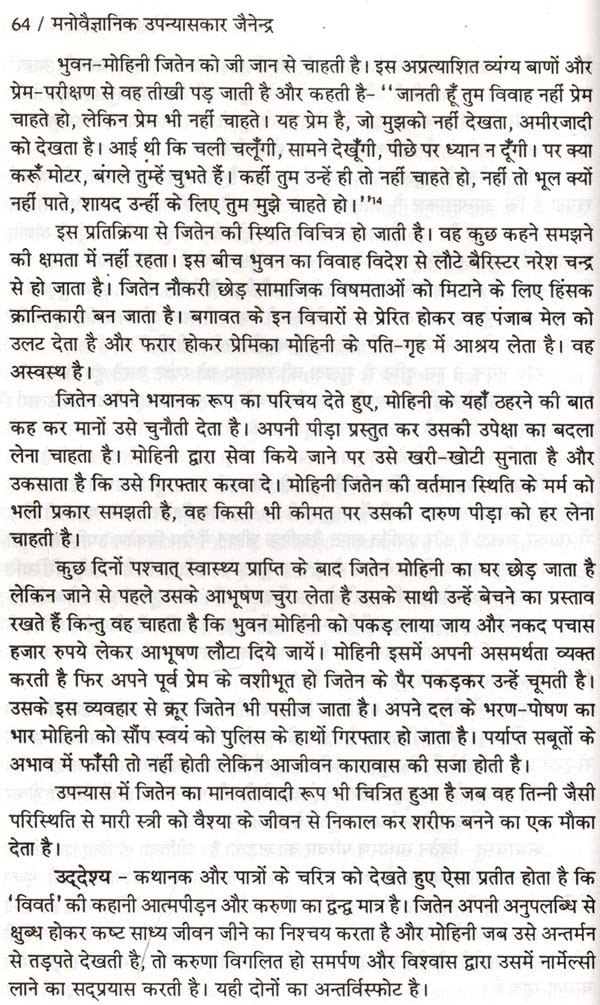 जैनेन्द्र ने अपने काल में परम्परागत मूल्यों से हटकर एक ऐसी पगडंडी अपनाई जो हमारे अन्धकारमय जटिल मनोभावों के बीच से होकर गुजरती है; और मानवीय अन्तः चेतना एवं उसकी पशुवृत्ति को प्रकाशित करती है। उन्होंने अपने ढंग से मनोवैज्ञानिक सिद्धांतों का कलात्मक वहन किया है।