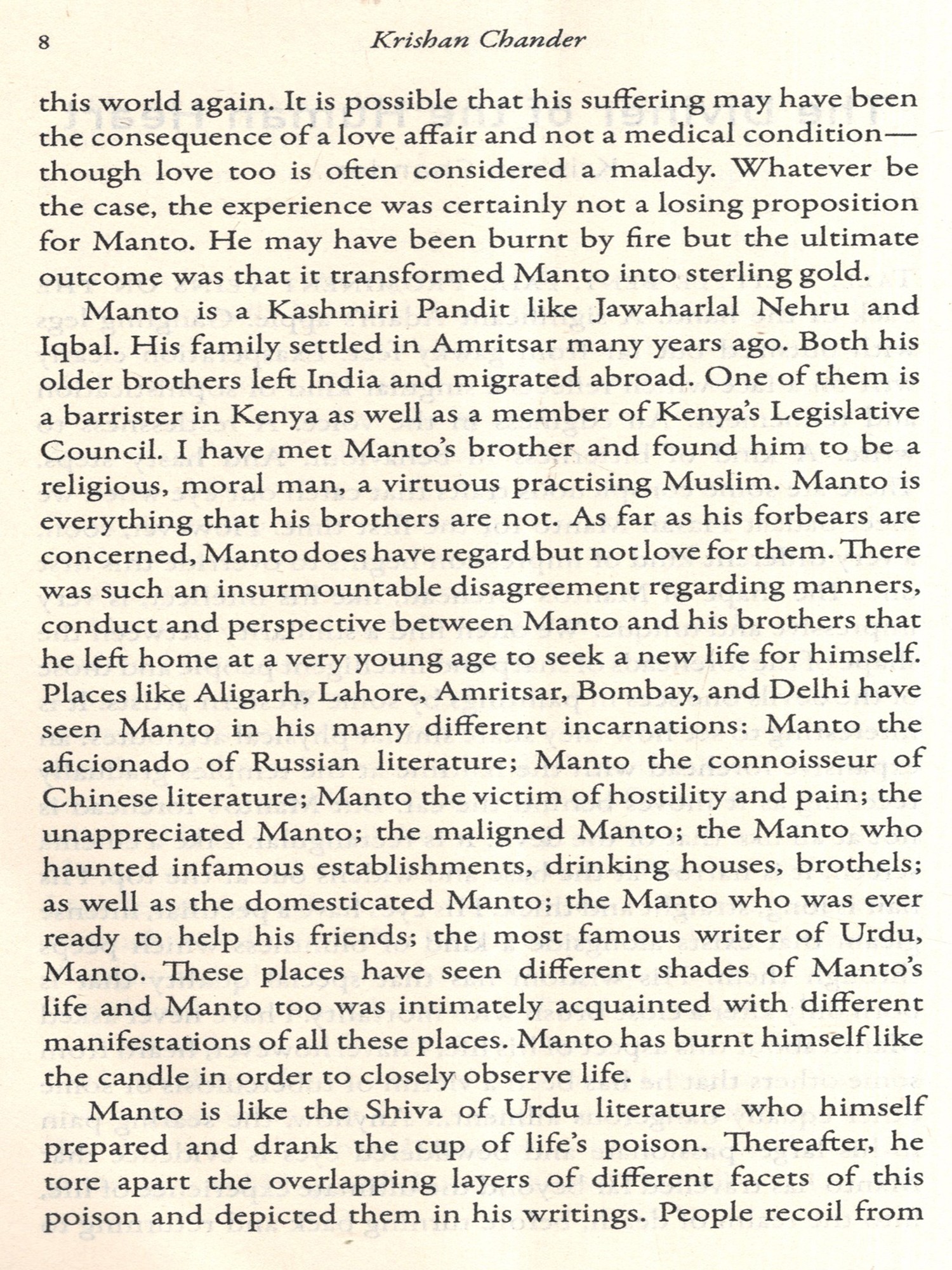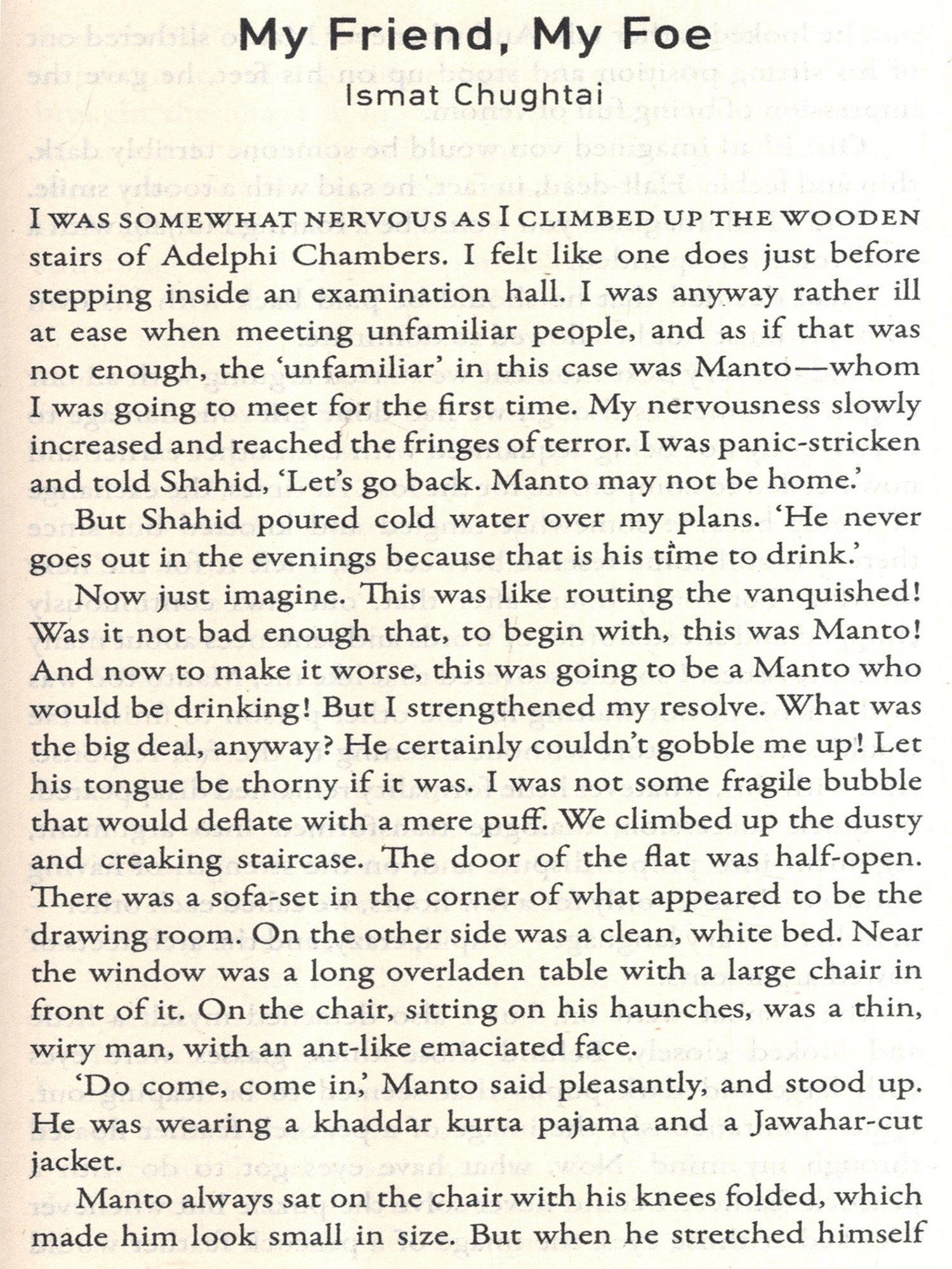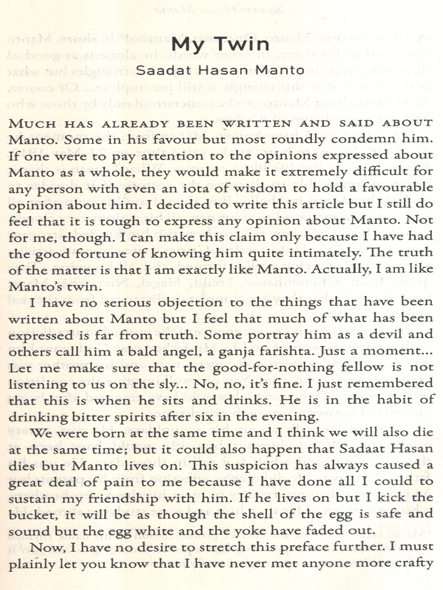 Fiercely competitive and an outspoken critic of others' writing. he brooked no criticism of his own, at times choosing to sever ties rather than have his words tampered with. And, for much of his adult life, right until the end, Manto was an alcoholic who fiercely defended his choice to remain one.