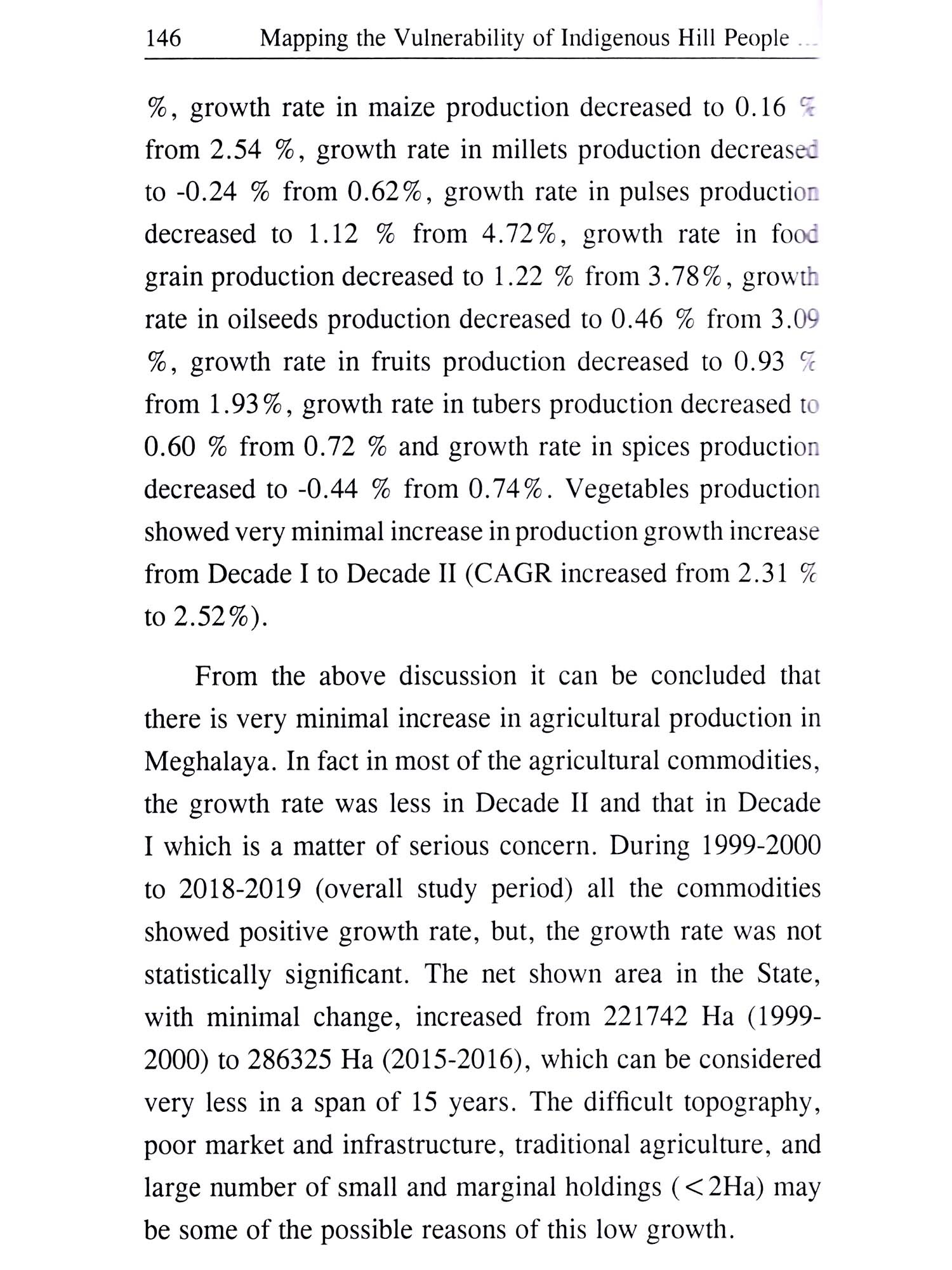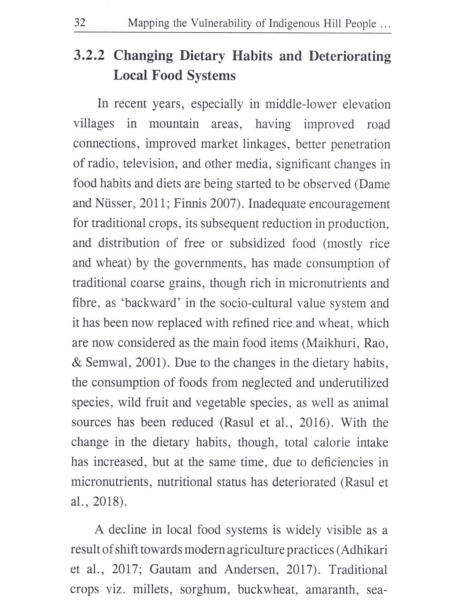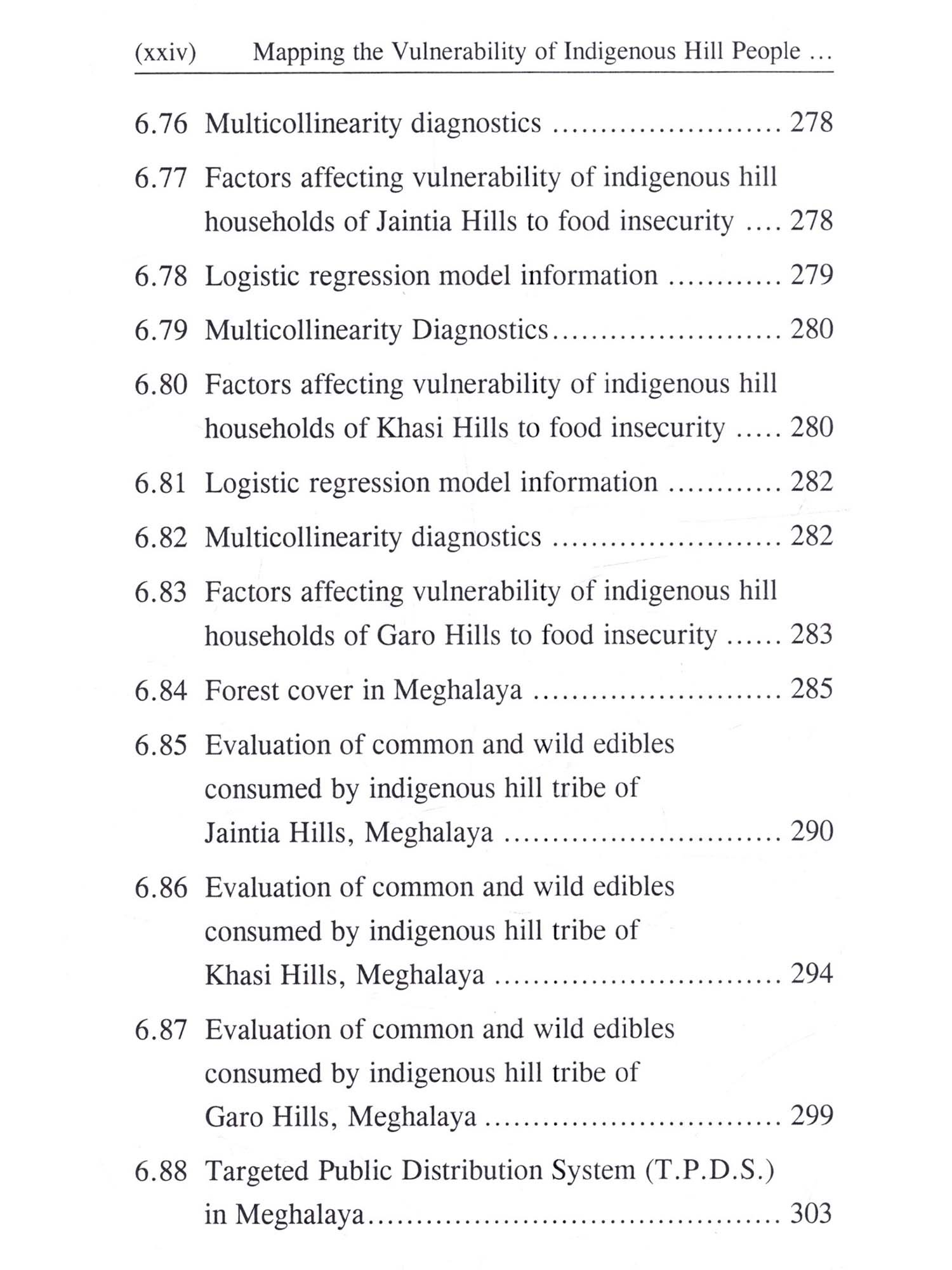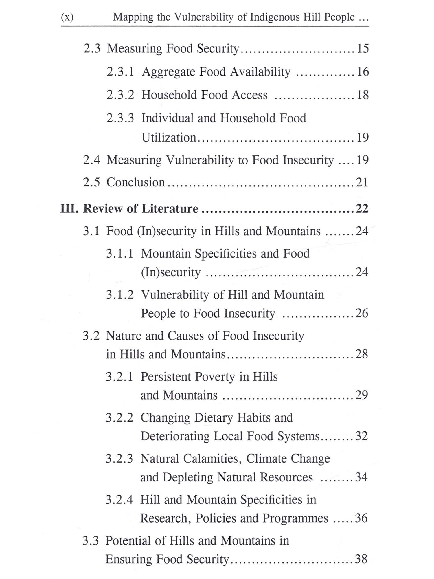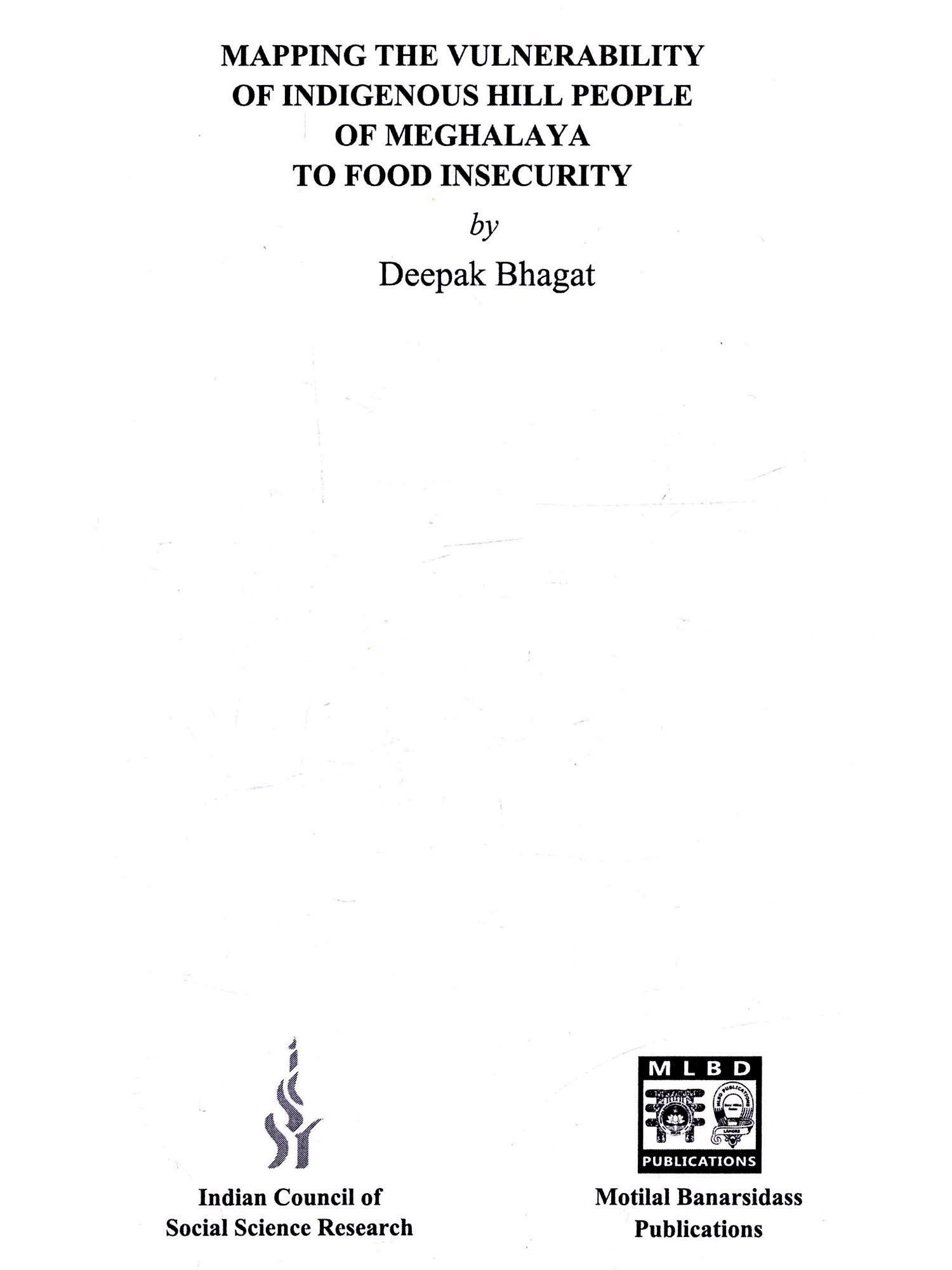 Mountains and hills are often regarded as ecologically more fragile than fertile plains. Its shallow soil, slopes with steep and differing elevations which are also limited and unsuitable for mass agricultural production, poor infrastructure, coupled with occurrence of extreme climatic events make people living in mountain areas particularly vulnerable to food insecurity. While the broad issue of food security has generally received attention of the researchers, the particularities in mountain, hill and similar regions remained neglected. In spite of the relevance and gravity of the issue of vulnerability of hill and mountain people to food insecurity, detailed and concise data on food and nutrition insecurity for specific mountain areas are rare. The available data often refer to the national level or are rather estimates, aggregates or extrapolations for mountain areas. This reflects, to some extent the lack of awareness and attention to mountain nutrition among development professionals, researchers, planners and policymakers. Case studies on complex food systems in these areas are needed to facilitate depiction of current trends and challenges regarding vulnerability of mountain people to food insecurity and thus, provide detailed information to the policymakers for the formulation of effective policies and appropriate interventions. The hills and forested tracts of India are also by and large dwelling places of tribal groups and the tribal inhabiting in these poorly resource- endowed areas are under-nourished or food insecure. The average calorie intake in mountain States of India tends to be slightly lower than the national average, particularly in Manipur, Meghalaya, and Nagaland. In Meghalaya, the average calorie intake is lowest among all the Indian hill and mountain States. Meghalaya is the only mountain State where the prevalence of stunting among children under 5 years of age (45.0%) is significantly higher than the national average of 41.2% (National Family Health Survey, 2015-16). However, there appears to be no information separately for the indigenous hill tribes of Meghalaya. The present study attempted to investigate the food insecurity and the vulnerability to food insecurity of indigenous hill tribes of Meghalaya, so that, effective policies and programmatic activities could be formulated to reduce their vulnerability to food insecurity. Along with documenting the present situation in the terms of food availability, accessibility, and utilization across the hills of Meghalaya, the study also explored the significance of local/ethnic plants in local food system of indigenous hill people so that it can be supplemented with food security schemes to minimize their vulnerability to food insecurity. Preface This study would not have been completed without the support, encouragement, co-operation and assistance of several organizations and persons. I would like to put on record and sincerely thank Indian Council of Social Science Research, New Delhi for considering and providing necessary financial assistance to carry out the Impactful Policy Research in Social Science (IMPRESS) project. It is my proud privilege to express a deep sense of gratitude and sincere appreciation to Dr. Rishiraj Dutta, Head of Capacity Development, Geospatial Information Department, Asian Disaster Preparedness Center, Bangkok, Thailand for his keen interest, ardent guidance and providing all the necessary expertise and help in preparation of various maps used in the study. I would also put on record my deep sense of gratitude to Prof. M. K. Awasthi, Indian Institute of Management, Lucknow, India; Dr. Ajitabh Bora, Defense Research Laboratory, DRDO, Tezpur, Sonitpur, Assam, India; Prof. Ram Singh, Central Agricultural University (Imphal), Umroi Road, Umiam (Barapani) Meghalaya, India; Prof. V. K. Singh, Dean, Faculty of Management Studies, Gurukula Kangri deemed to be University, Haridwar, Uttarakhand, India and Prof (retd.) K. C. Talukdar, Assam Agricultural University, Jorhat, Assam, India, for their experienced and fervent guidance, keen interest, constructive suggestions, valuable criticism and constant encouragement throughout the course of this investigation and in the preparation of the manuscript. I am also grateful to Pro- Vice Chancellor, North Eastern Hill University,
