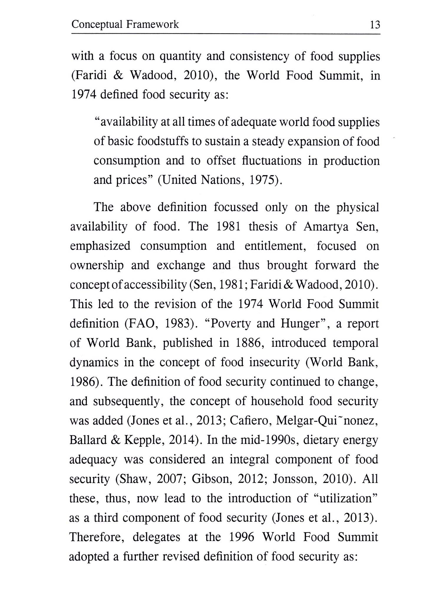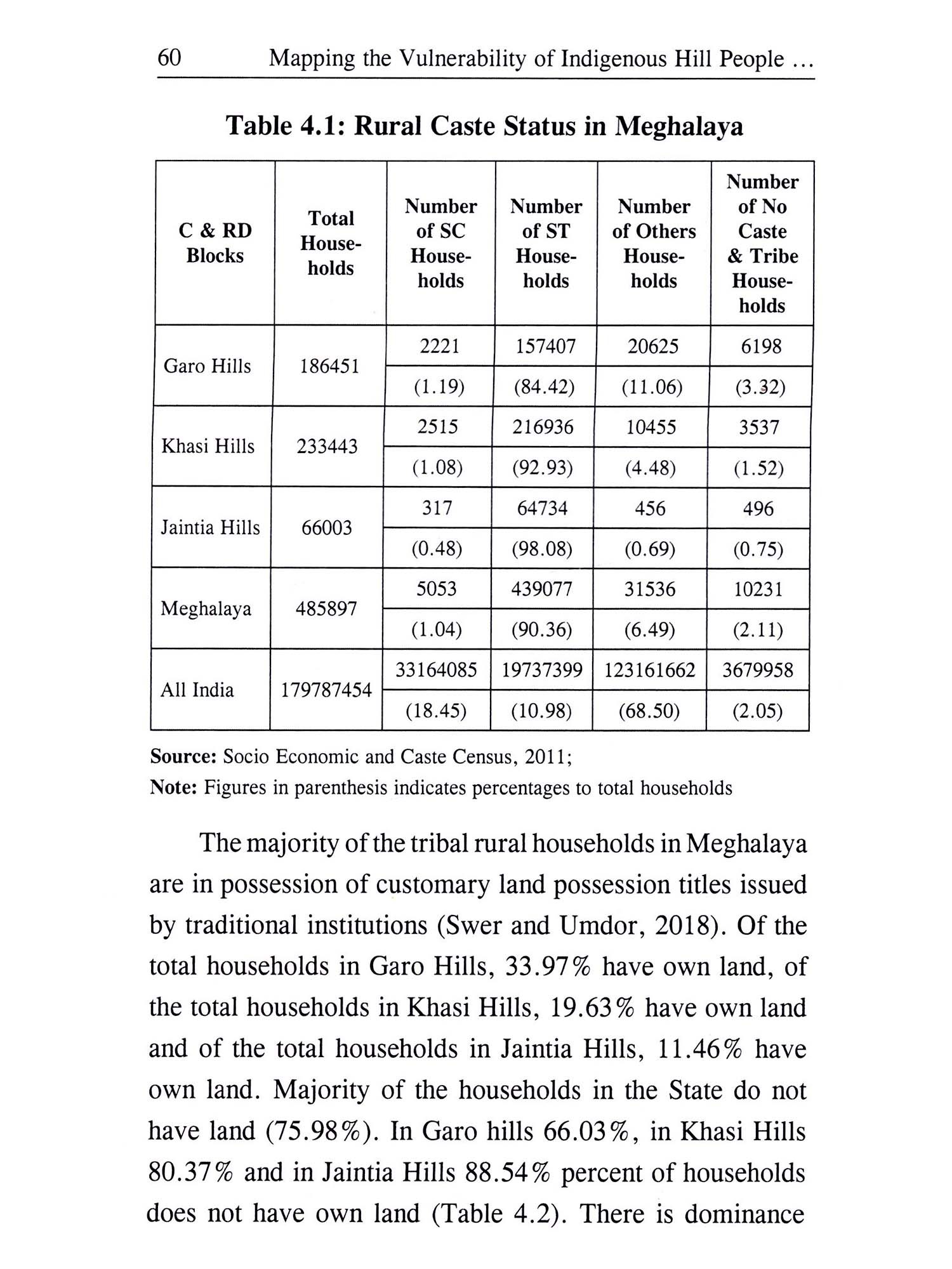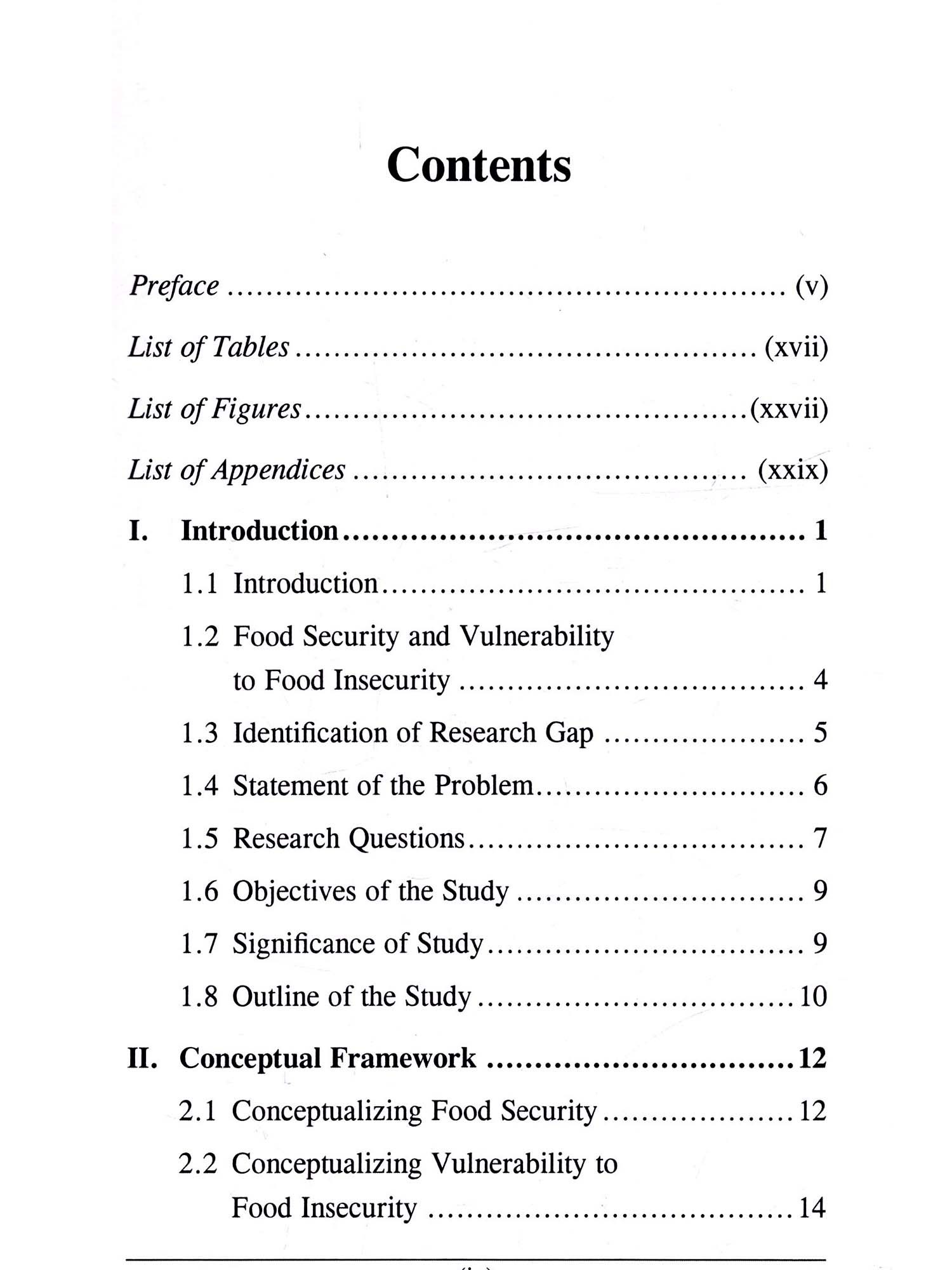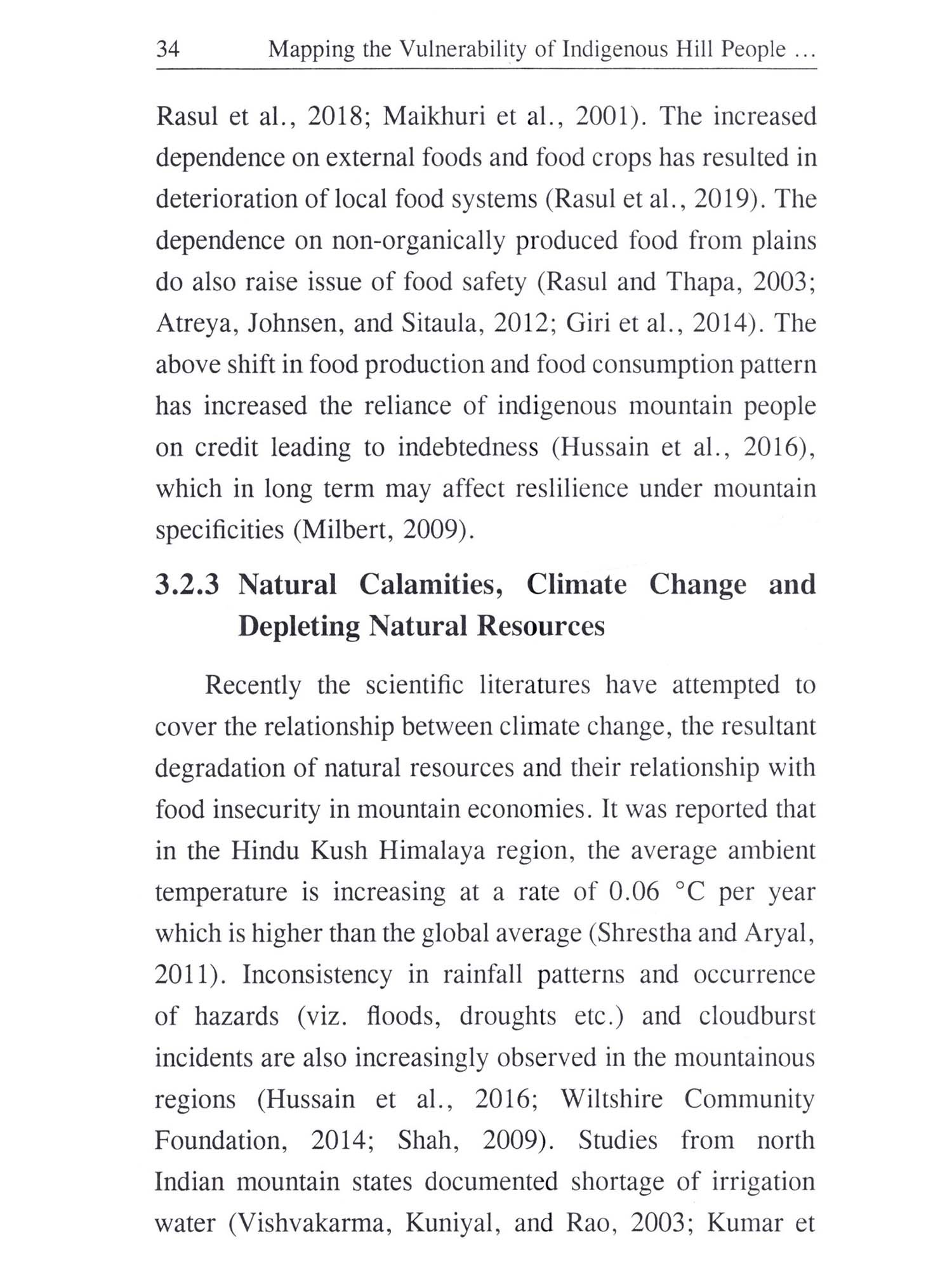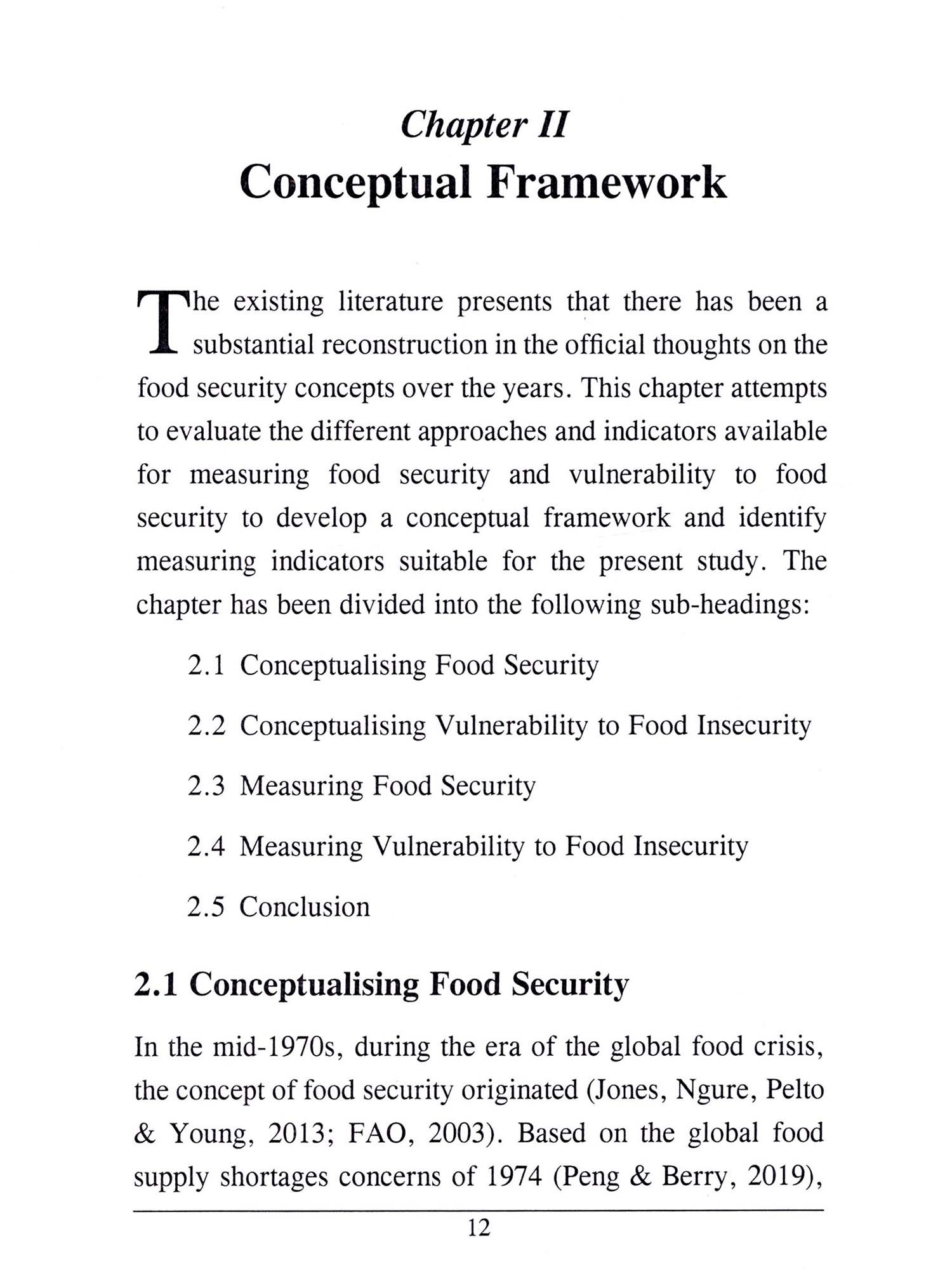 Mountains and hills are often regarded as ecologically more fragile than fertile plains. Its shallow soil, slopes with steep and differing elevations which are also limited and unsuitable for mass agricultural production, poor infrastructure, coupled with occurrence of extreme climatic events make people living in mountain areas particularly vulnerable to food insecurity. While the broad issue of food security has generally received attention of the researchers, the particularities in mountain, hill and similar regions remained neglected. In spite of the relevance and gravity of the issue of vulnerability of hill and mountain people to food insecurity, detailed and concise data on food and nutrition insecurity for specific mountain areas are rare. The available data often refer to the national level or are rather estimates, aggregates or extrapolations for mountain areas. This reflects, to some extent the lack of awareness and attention to mountain nutrition among development professionals, researchers, planners and policymakers. Case studies on complex food systems in these areas are needed to facilitate depiction of current trends and challenges regarding vulnerability of mountain people to food insecurity and thus, provide detailed information to the policymakers for the formulation of effective policies and appropriate interventions. The hills and forested tracts of India are also by and large dwelling places of tribal groups and the tribal inhabiting in these poorly resource- endowed areas are under-nourished or food insecure. The average calorie intake in mountain States of India tends to be slightly lower than the national average, particularly in Manipur, Meghalaya, and Nagaland. In Meghalaya, the average calorie intake is lowest among all the Indian hill and mountain States. Meghalaya is the only mountain State where the prevalence of stunting among children under 5 years of age (45.0%) is significantly higher than the national average of 41.2% (National Family Health Survey, 2015-16). However, there appears to be no information separately for the indigenous hill tribes of Meghalaya. The present study attempted to investigate the food insecurity and the vulnerability to food insecurity of indigenous hill tribes of Meghalaya, so that, effective policies and programmatic activities could be formulated to reduce their vulnerability to food insecurity. Along with documenting the present situation in the terms of food availability, accessibility, and utilization across the hills of Meghalaya, the study also explored the significance of local/ethnic plants in local food system of indigenous hill people so that it can be supplemented with food security schemes to minimize their vulnerability to food insecurity. Preface This study would not have been completed without the support, encouragement, co-operation and assistance of several organizations and persons. I would like to put on record and sincerely thank Indian Council of Social Science Research, New Delhi for considering and providing necessary financial assistance to carry out the Impactful Policy Research in Social Science (IMPRESS) project. It is my proud privilege to express a deep sense of gratitude and sincere appreciation to Dr. Rishiraj Dutta, Head of Capacity Development, Geospatial Information Department, Asian Disaster Preparedness Center, Bangkok, Thailand for his keen interest, ardent guidance and providing all the necessary expertise and help in preparation of various maps used in the study. I would also put on record my deep sense of gratitude to Prof. M. K. Awasthi, Indian Institute of Management, Lucknow, India; Dr. Ajitabh Bora, Defense Research Laboratory, DRDO, Tezpur, Sonitpur, Assam, India; Prof. Ram Singh, Central Agricultural University (Imphal), Umroi Road, Umiam (Barapani) Meghalaya, India; Prof. V. K. Singh, Dean, Faculty of Management Studies, Gurukula Kangri deemed to be University, Haridwar, Uttarakhand, India and Prof (retd.) K. C. Talukdar, Assam Agricultural University, Jorhat, Assam, India, for their experienced and fervent guidance, keen interest, constructive suggestions, valuable criticism and constant encouragement throughout the course of this investigation and in the preparation of the manuscript. I am also grateful to Pro- Vice Chancellor, North Eastern Hill University,