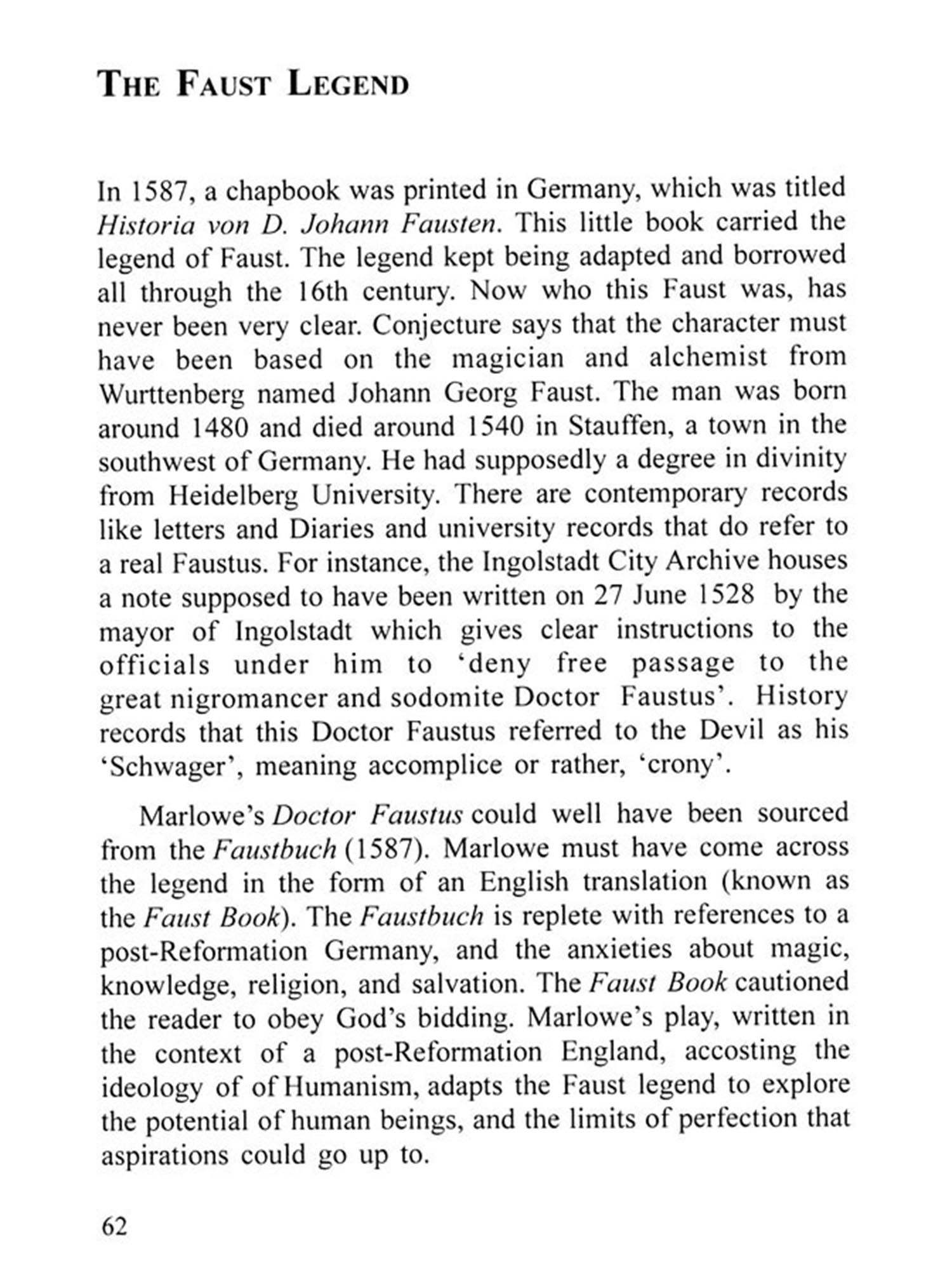 When one tries to study a text, the first introduction to it as a reader is through the title. In Marlowe's play, in fact in most of Marlowe's plays, the title is fashioned after the name of the central protagonist. Doctor Faustus is no exception either. But unlike the other plays like Tamburlaine or Edward II or Dido, Queen of Carthage, Marlowe's Doctor Faustus is named after a man who is not a king or a prince or an aristocrat for that matter, but a down-to-earth Doctor of Divinity. The title is quite intriguing as it stokes the curiosity of the reader/audience as to how the life of a common man could be uncommon enough to weave a play around it.