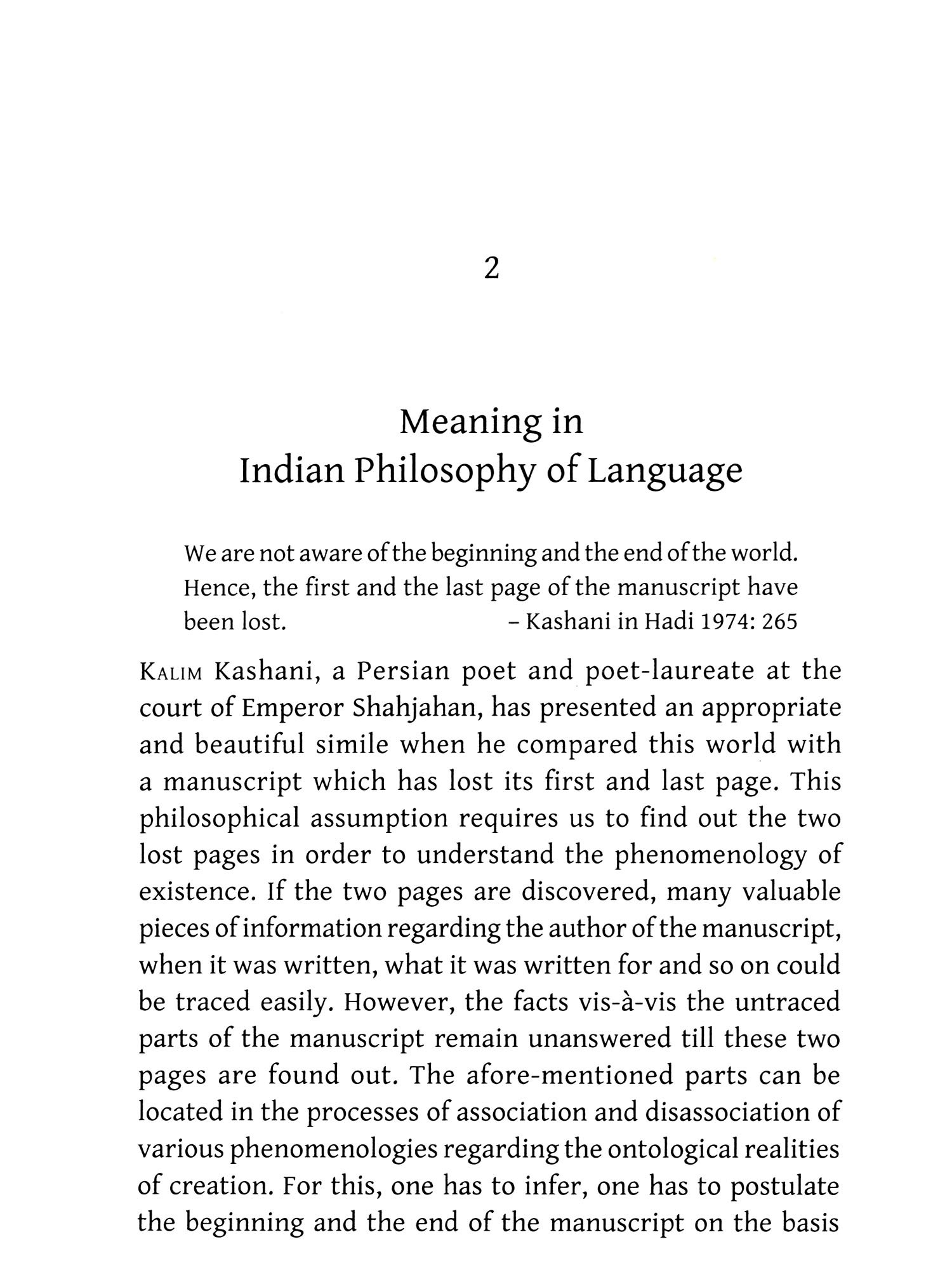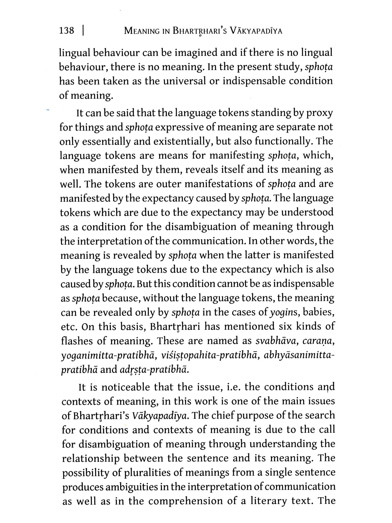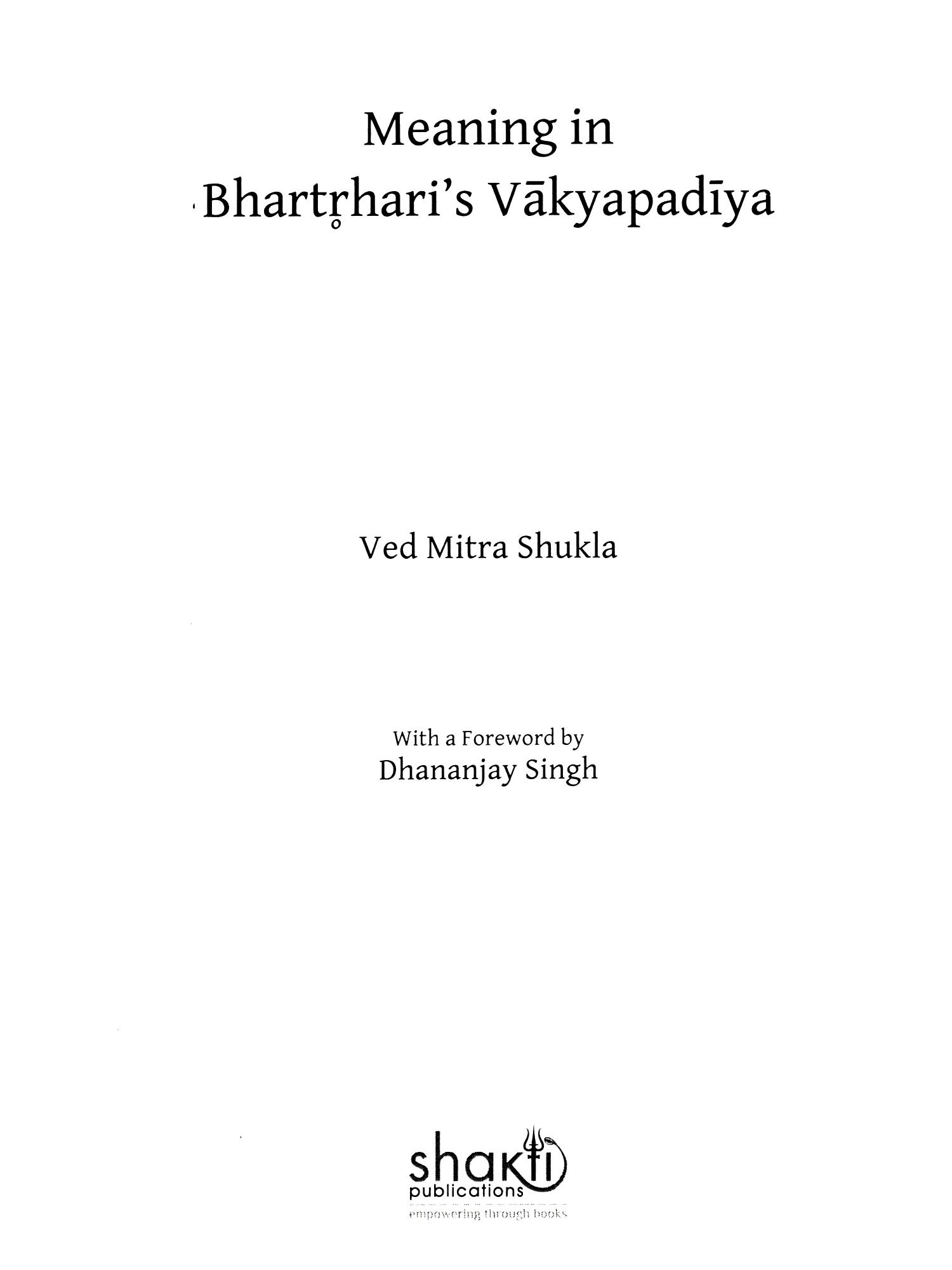 KEEPING in view the valuable riches of Indian knowledge, the book makes an attempt to explore some issues related to meaning in Bhartṛhari's Vākyapadīya. In the process of reading the text, there is no purpose to bring out overwhelming new theories. The present work simply takes meaning discussed in the Vakyapadiya as its subject. Positively being a student of English language and literature, my reading of the Vākyapadīya might be proved a transformational encounter to some extent. Such readings cannot be possible without the guidance of our teachers. I am grateful to Professor Kapil Kapoor, Professor Ashok Aklujkar and Professor Dhananjay Singh whose insipirations, teachings and guidance enabled me to go through the Vākyapadīya. I must be thankful to my MA students too who made me ready to publish this work into the form of a book. I would like to acknowledge the help I received from various quarters during the planning, preparation, writing and finalization of this book. First of all, I must thank Professor Dhananjay Singh, who guided me to go through Bhartṛhari's Vākyapadīya first time. Throughout my research work, he encouraged me to form new thoughts through critical comments and effective guidance.