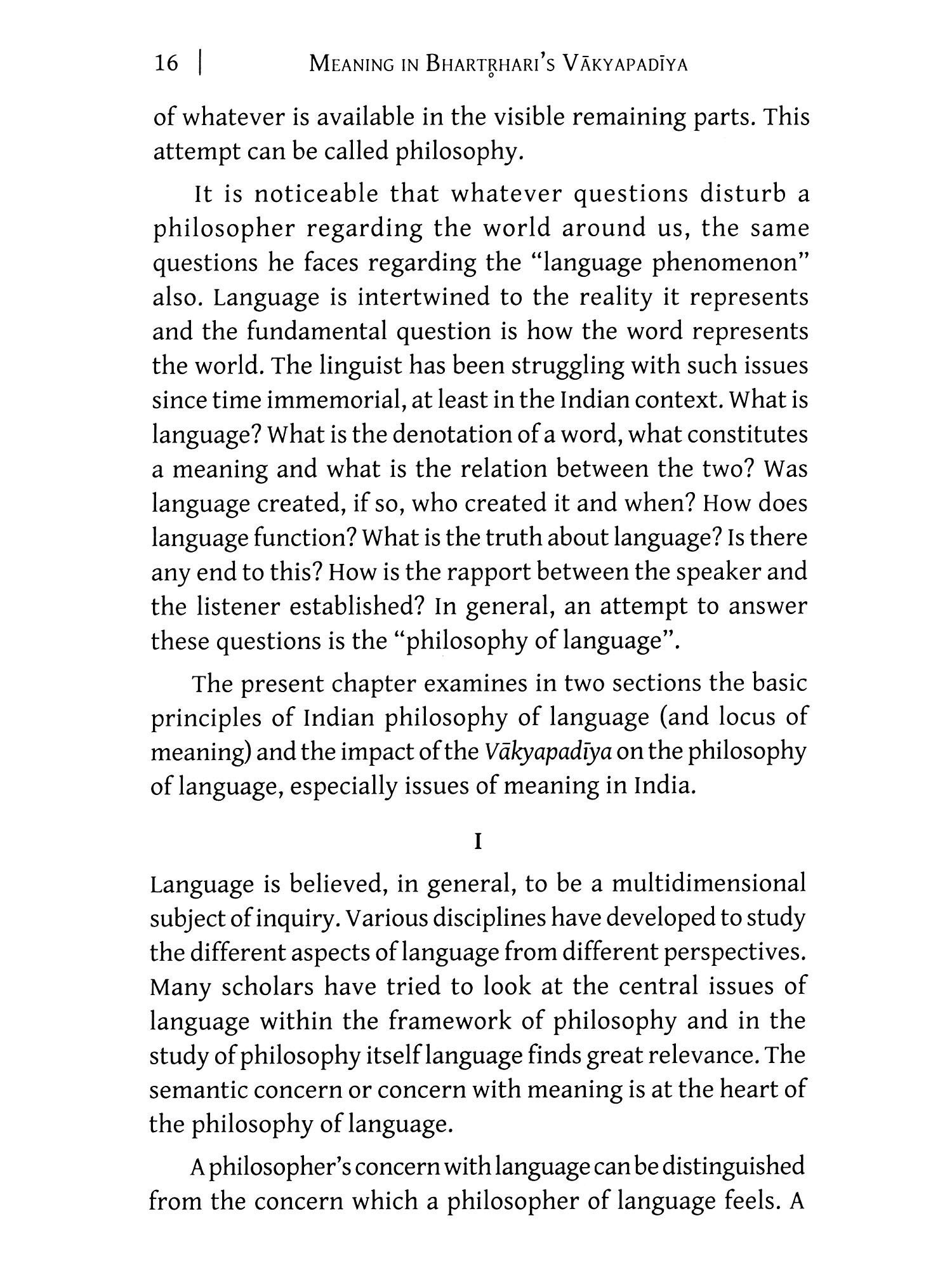 GRAMMAR, in the West, aims to systematize the rules of a language, analyse its structure from various viewpoints of phoneme, word, phrase and sentence, and discriminate the correct from the incorrect usage. However, in the Indian tradition, grammar, apart from doing these also deals with issues that go beyond the study of any particular language. The Indian grammatical texts constitute a philosophical discipline as well. The analysis of language in India triggers a number of queries: What is language? What is the linguistic denotation? How could an association be established between word and meaning? Do the words refer to a universal or a particular, a class or an individual, forms or substances, etc.? How far meaning is a competent means? What is the relationship between (a) meaning and thought, and (b) meaning and reality? And to what extent verbal cognition is reliable? Such questions taken up by linguistic philosophers like Panini (fourth century BCE), Patañjali (second century scr) and Bhartṛhari (fifth century cz) form the crux of the Indian philosophy of language.