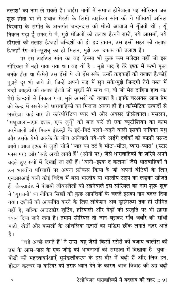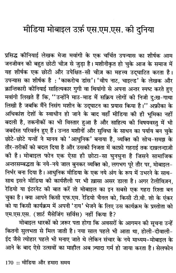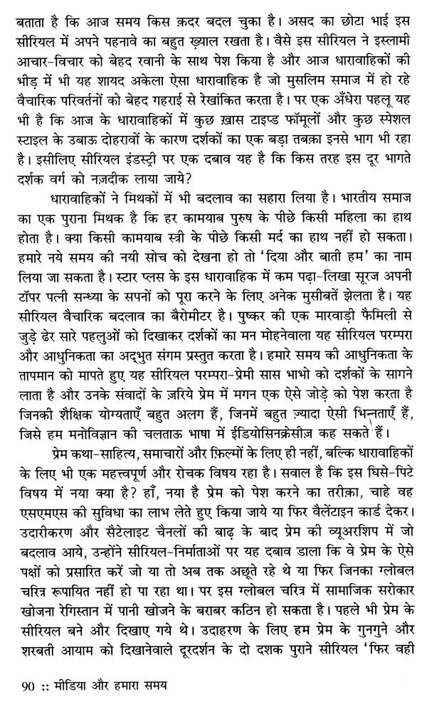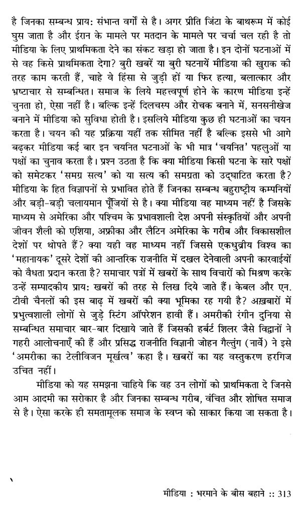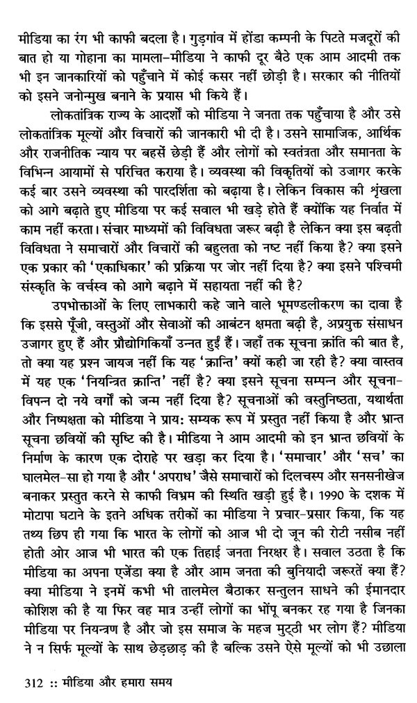 बदलते परिवेश की थाह लेता मीडिया विमर्श बहुत पहले की बात नहीं है जब मीडिया सूचना, सन्देशों और शिक्षा का माध्यम हुआ करता था और बहुजन हिताय, बहुजन सुखाय उसका उद्देश्य वाक्य होता था, लेकिन भूमंडलीकरण के दौरान जितनी तेज़ी से मीडिया से जुड़ी विभिन्न प्रौद्योगिकियाँ विकसित हुई, उससे कहीं तेज़ी से एक ओर तो समाज में जानकारियों और सूचनाओं का विस्फोट हुआ, दूसरी ओर बाज़ार ने अपने स्वार्थ के लिए उपभोक्ता समाज का निर्माण किया, उसको लगातार पोषित करने का काम भी मीडिया के हिस्से में आया। सूचना, कुसूचना तथा दुराग्रही और भ्रामक सूचनाओं का विवाद भी इसी दौर में तेज़ हुआ और समाज को नियन्त्रण में रखने के औजार के रूप में चोम्सकी ने भी मीडिया की खासी आलोचना की। इसी परिदृश्य से जुड़ी है मीडिया के भीतर की उसकी आलोचना, उसका विश्लेषण और उसका आत्मालोचन भी। प्रांजल धर की यह पुस्तक भी उसी आंतरिक आलोचना और विश्लेषण की एक कड़ी है जो पिछले दिनों नया ज्ञानोदय के लिए लेख लिख-लिख कर सृजित की गयी है। हिन्दी और अंग्रेज़ी के अनेक पत्र-पत्रिकाओं में इन दिनों मीडिया पर बहुत कुछ छप रहा है। इसकी एक वजह यह भी है कि मीडिया में आजकल परिवर्तन भी पहले की अपेक्षा अधिक हो रहे हैं। इस नयी शताब्दी की पहली सदी के आरम्भकी बात ही करें तो हम देखते हैं कि हिन्दी पत्रकारिता का इतना अधिक विकास हुआ जितना देश की किसी अन्य भाषा और यहाँ तक कि अंग्रेजी में भी नहीं हुआ। चार-पाँच अख़बार तो आज किसी एक राज्य के एक-दो शहरों से नहीं बल्कि कई राज्यों के कई शहरों से निकल रहे है।