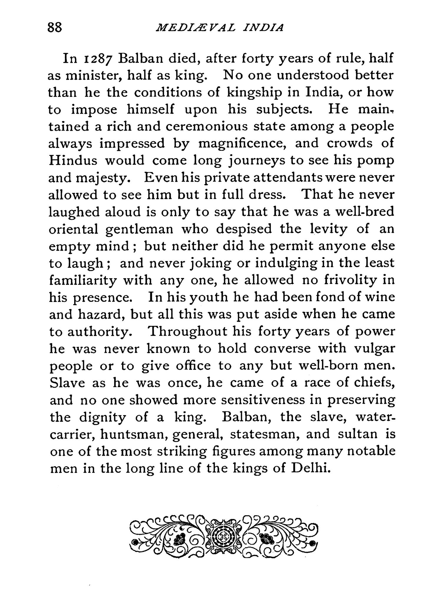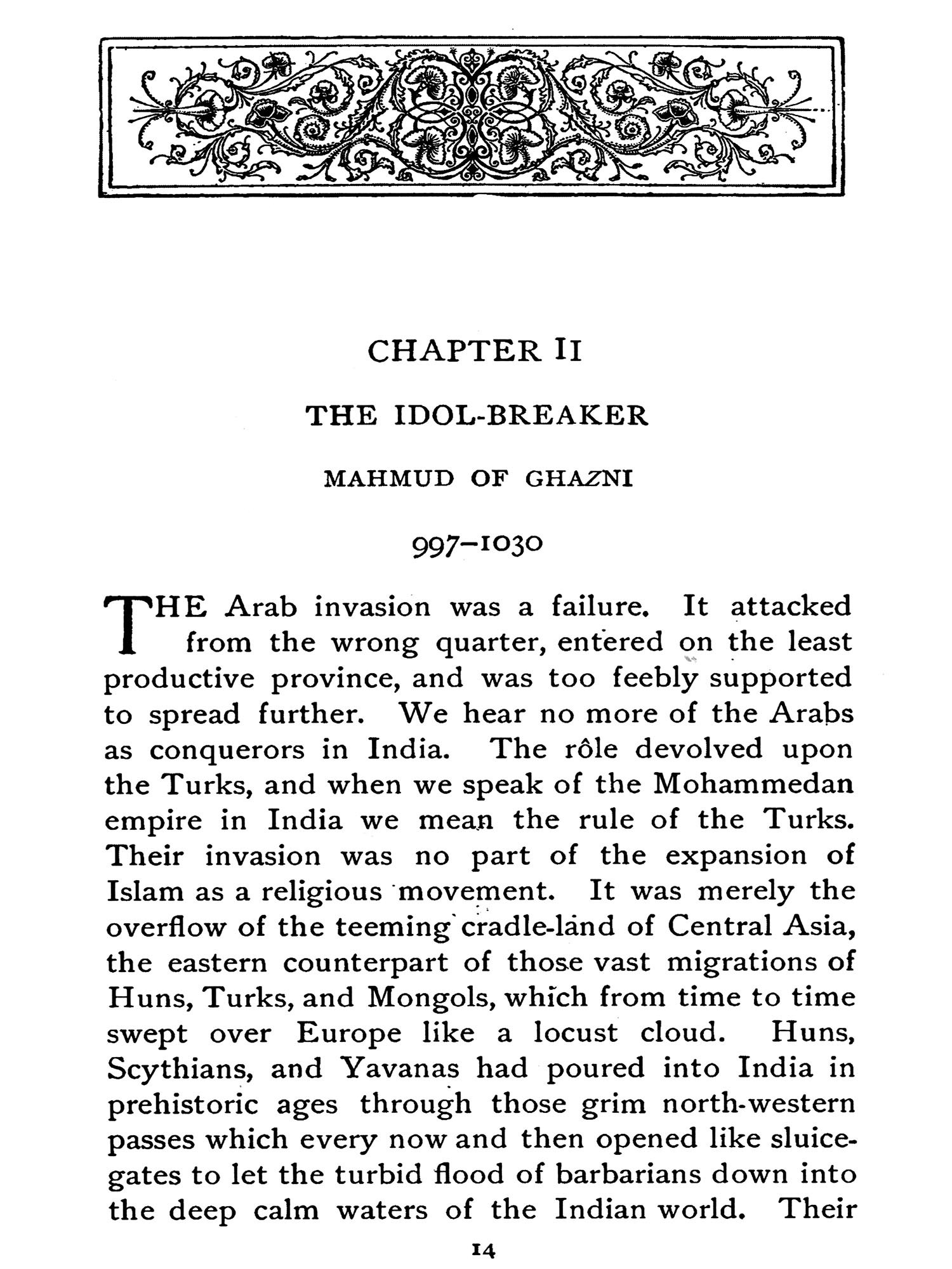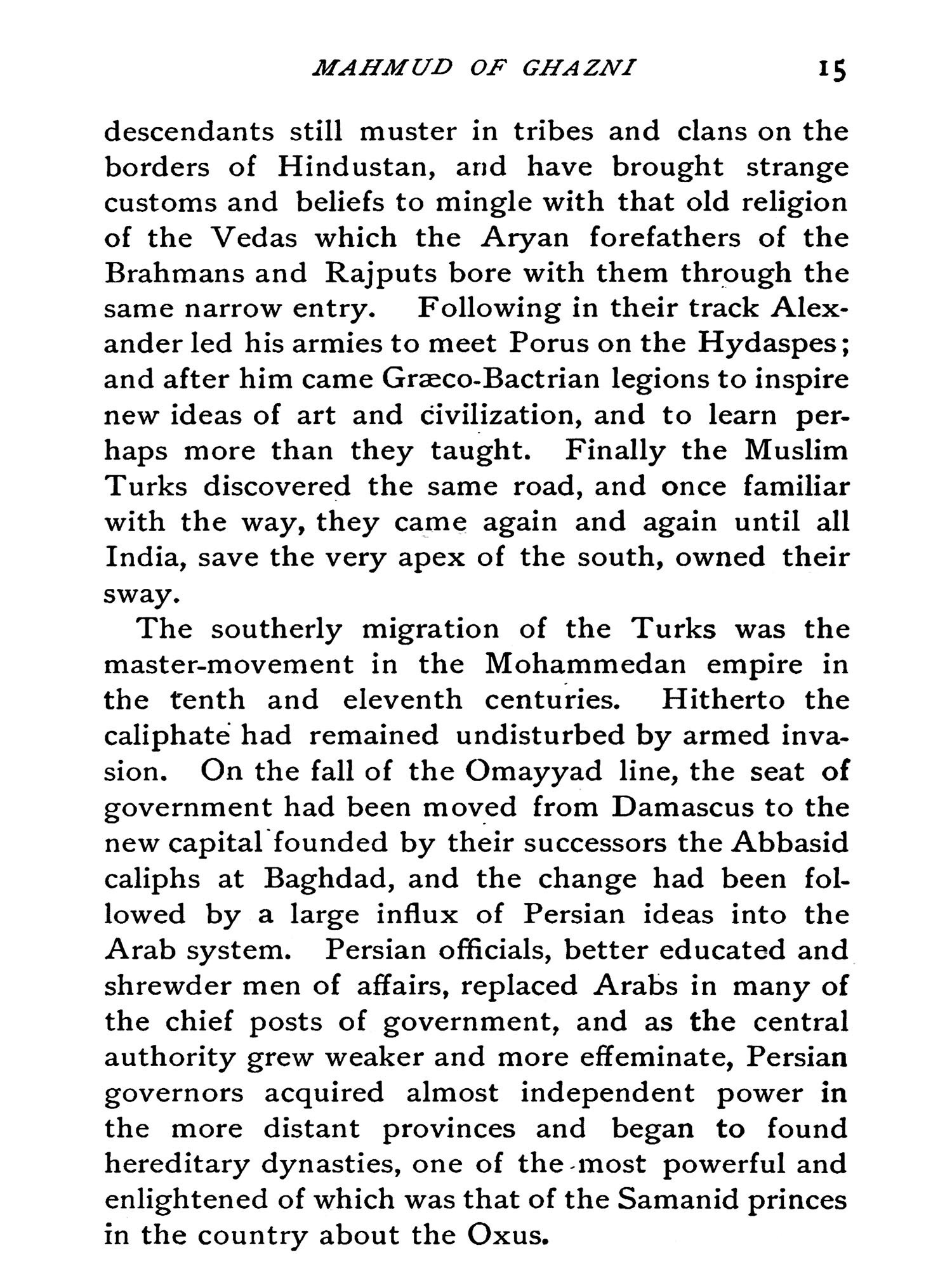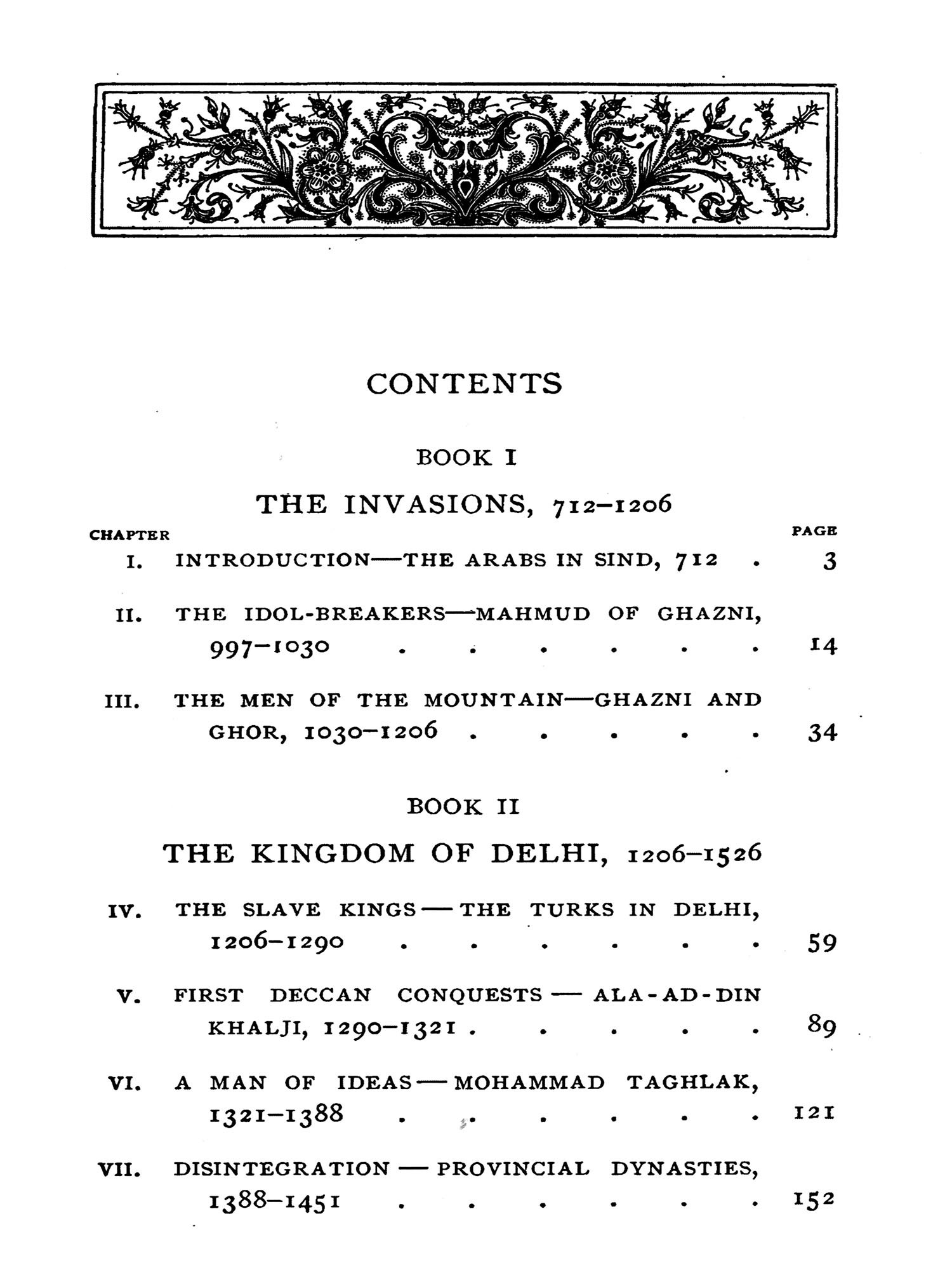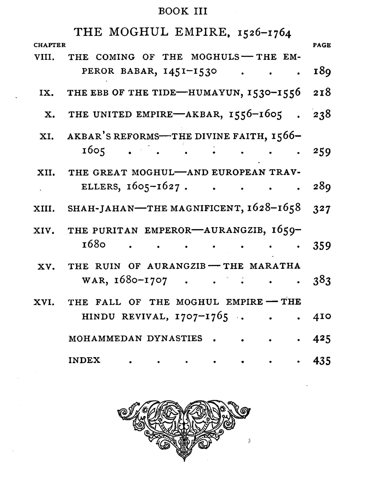 THE Mediaeval Period of Indian history, though it does not exactly correspond with the Middle Age of Europe, is not less clearly defined. It begins when the immemorial systems, rule, and customs of Ancient India were invaded, subdued, and modified by a succession of foreign conquerors who imposed a new rule and introduced an exotic creed, strange languages and a foreign art. These conquerors were Muslims, and with the arrival of the Turks under Mahmud the Iconoclast at the beginning of the eleventh century, India entered upon her Middle Age. From that epoch for nearly eight hundred years her history is grouped round the Mohammedan rulers who gradually brought under their control nearly the whole country from the Himalayas to the Krishna river. The Period ends when one of the last of these rulers, oppressed by the revival of Hindu ascendency, placed himself under English protection, and Modern India came into being. Distinct and clearly marked as the Mediaeval or Mohammedan Period is, the transition implies no violent change. History is always continuous; there can be no 'fresh start'; and each new period carries on much of what preceded it. In India, as ever in the East, change is so gradual as to be almost im-perceptible. Ancient India was too deeply rooted in its traditions to wither even under the storm of Muslim conquest. The old Indian life survived the shock of the new ideas, which it modified at least as much as it was modified; it outlived the Muslim Period, and still endures, but little altered, in the Modern Age of English domination. It never really assimilated the foreigners or their ideas. Despite the efforts of a few wide-seeing men like Akbar, no true or permanent union, except occasionally among the official and ruling classes, ever took place between the Muslims and the Hindus; and the ascendant races, whether Turks, Persians, Afghans, or Moghuls, remained essentially an army of occupation among a hostile or at least repellent population.