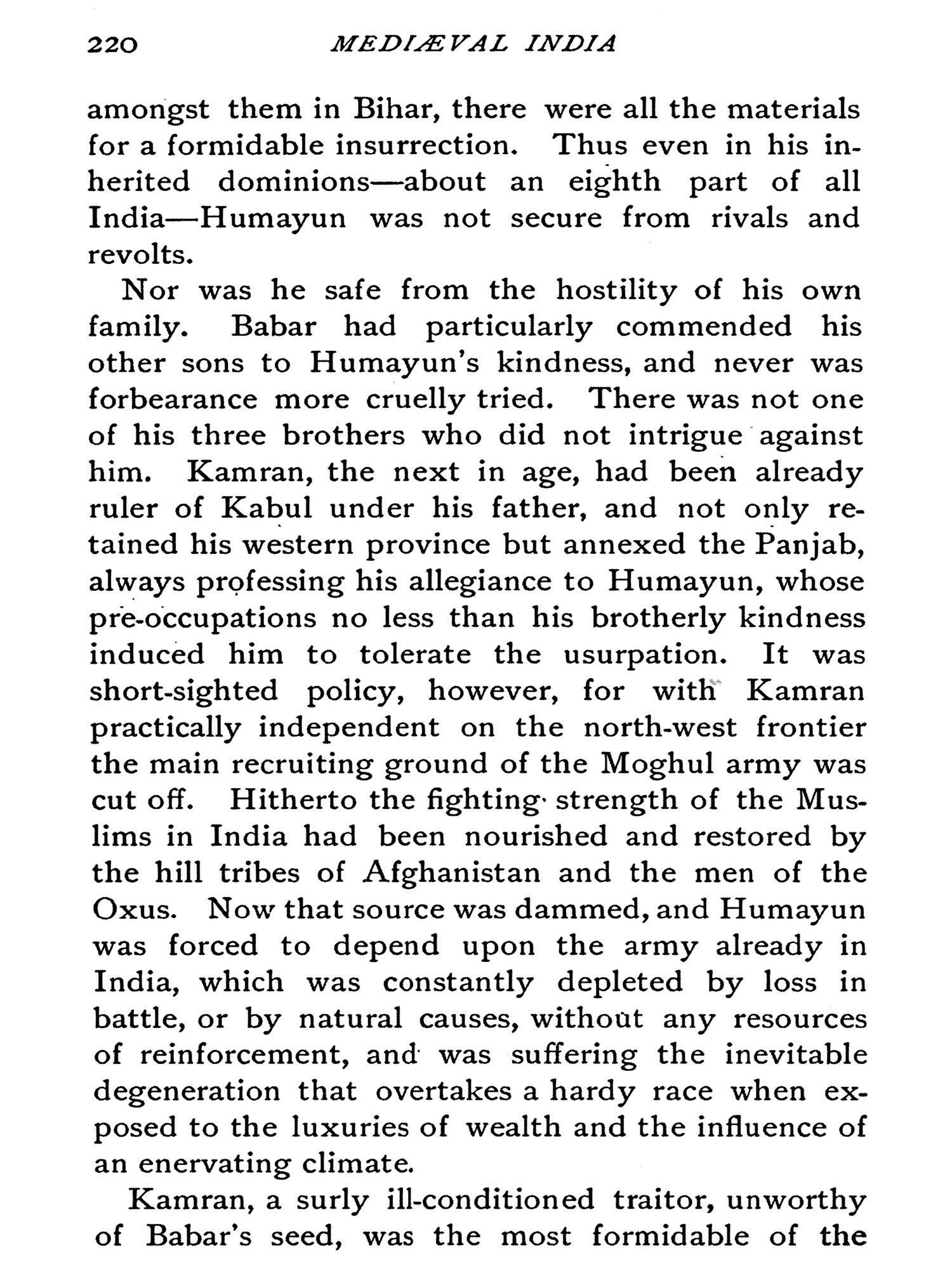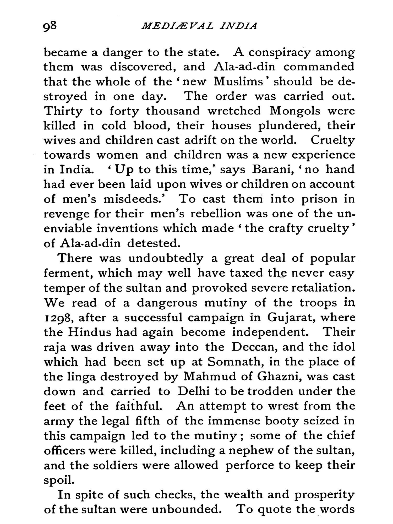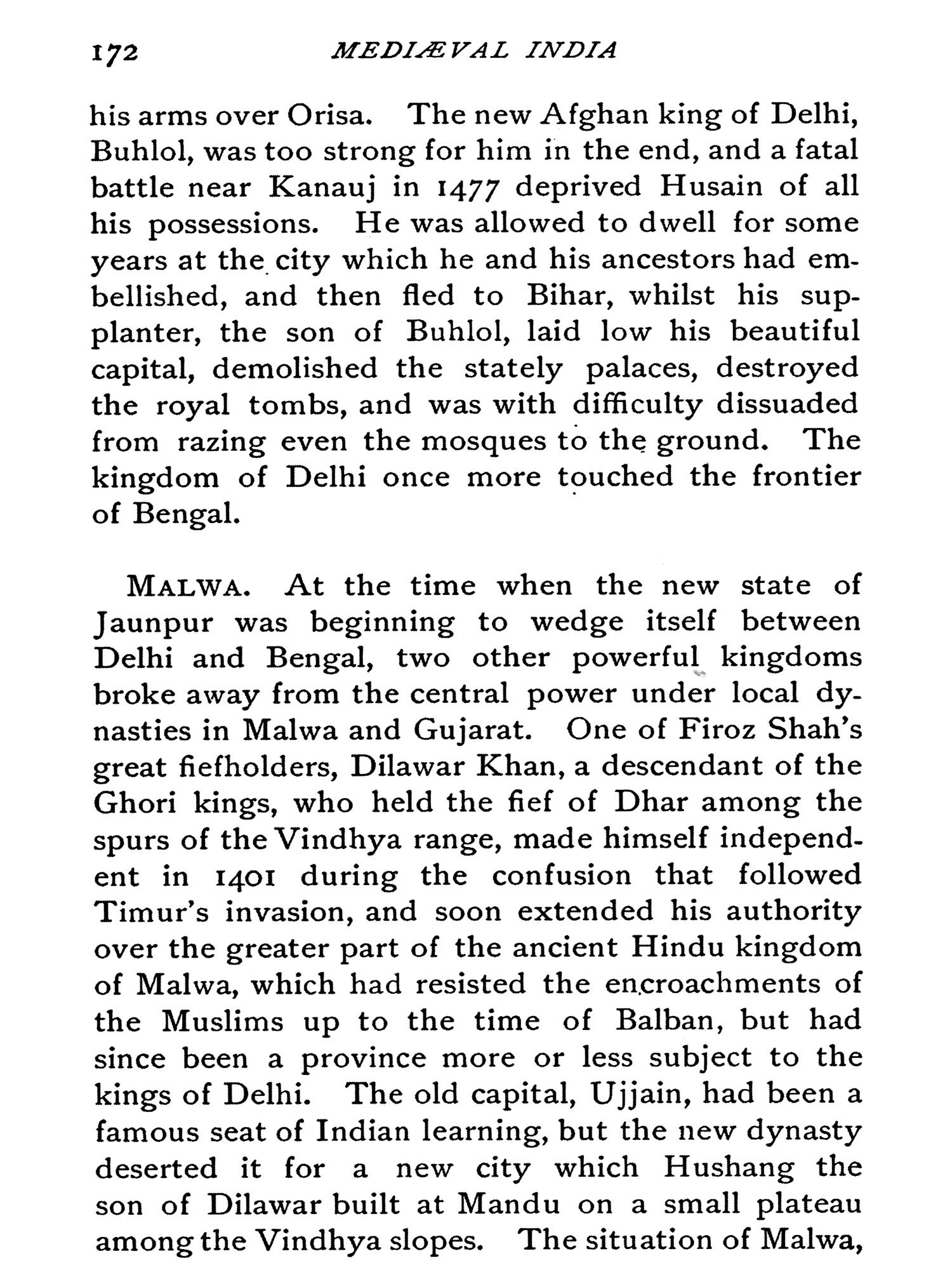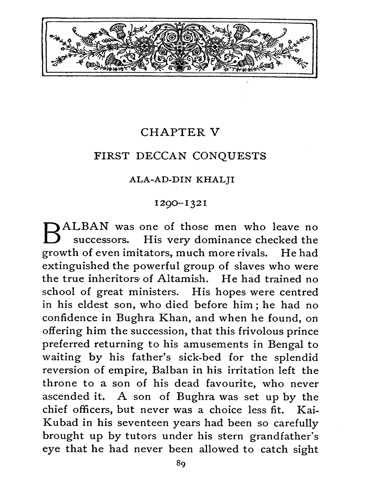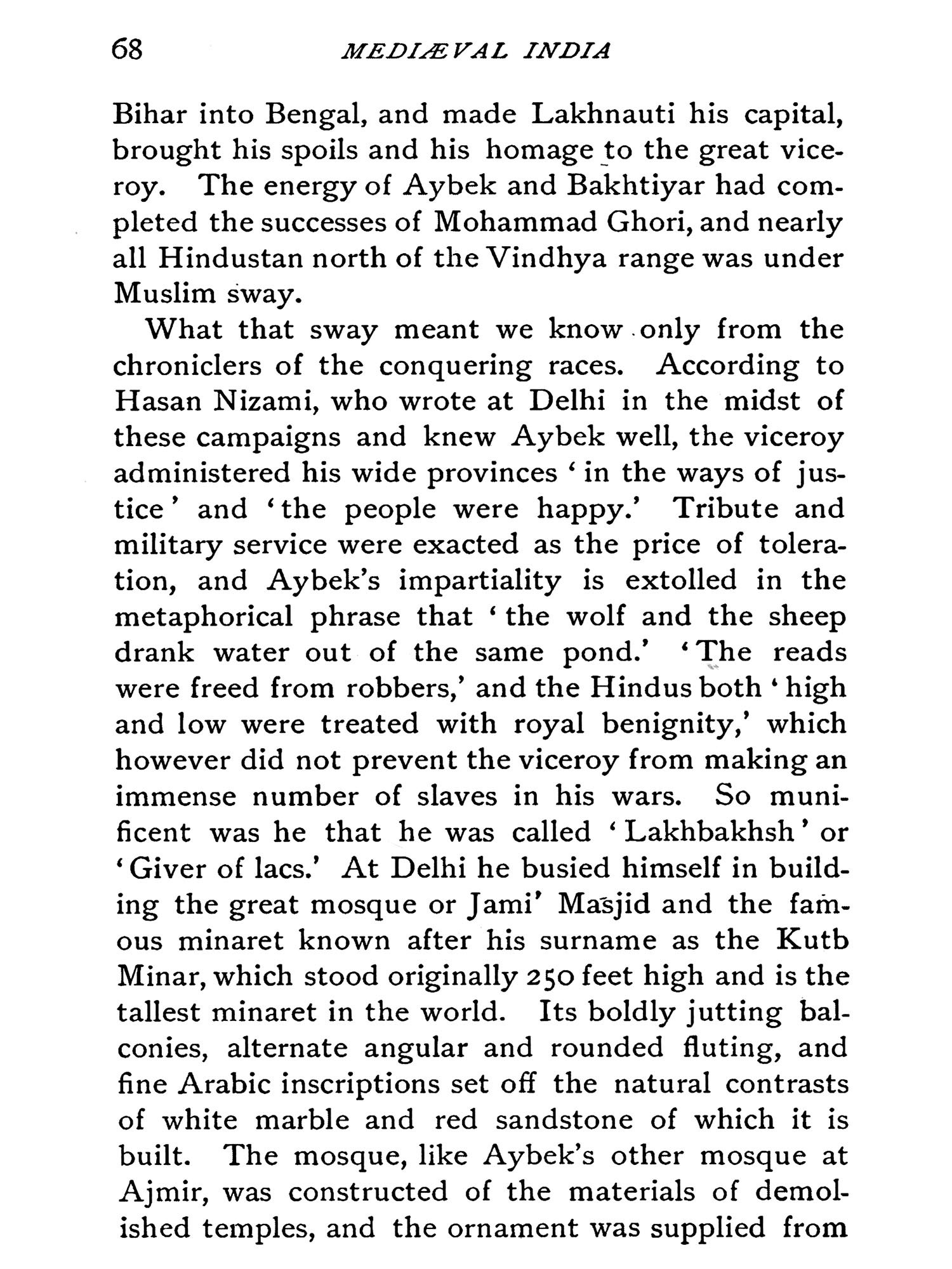 THE Mediaeval Period of Indian history, though it does not exactly correspond with the Middle Age of Europe, is not less clearly defined. It begins when the immemorial systems, rule, and customs of Ancient India were invaded, subdued, and modified by a succession of foreign conquerors who imposed a new rule and introduced an exotic creed, strange languages and a foreign art. These conquerors were Muslims, and with the arrival of the Turks under Mahmud the Iconoclast at the beginning of the eleventh century, India entered upon her Middle Age. From that epoch for nearly eight hundred years her history is grouped round the Mohammedan rulers who gradually brought under their control nearly the whole country from the Himalayas to the Krishna river. The Period ends when one of the last of these rulers, oppressed by the revival of Hindu ascendency, placed himself under English protection, and Modern India came into being. Distinct and clearly marked as the Mediaeval or Mohammedan Period is, the transition implies no violent change. History is always continuous; there can be no 'fresh start'; and each new period carries on much of what preceded it. In India, as ever in the East, change is so gradual as to be almost im-perceptible. Ancient India was too deeply rooted in its traditions to wither even under the storm of Muslim conquest. The old Indian life survived the shock of the new ideas, which it modified at least as much as it was modified; it outlived the Muslim Period, and still endures, but little altered, in the Modern Age of English domination. It never really assimilated the foreigners or their ideas. Despite the efforts of a few wide-seeing men like Akbar, no true or permanent union, except occasionally among the official and ruling classes, ever took place between the Muslims and the Hindus; and the ascendant races, whether Turks, Persians, Afghans, or Moghuls, remained essentially an army of occupation among a hostile or at least repellent population.