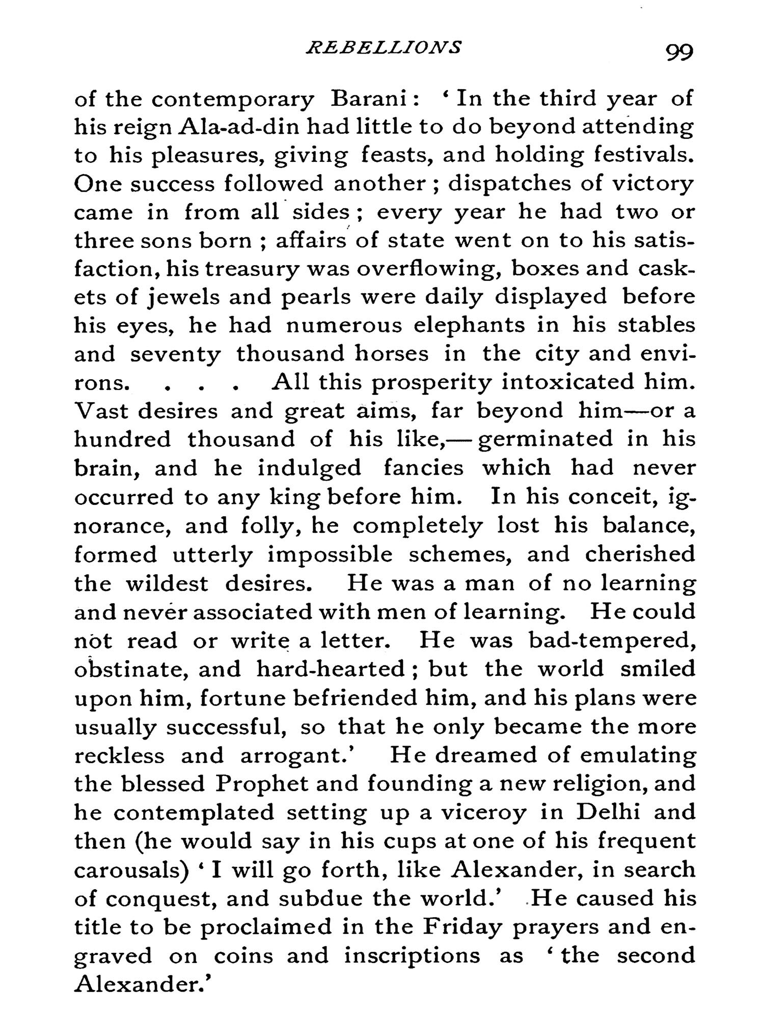 The history of the Mohammedan Period is there-fore necessarily more a chronicle of kings and courts and conquests than of organic or national growth. The vast mass of the people enjoy the doubtful happiness of having no history, since they show no development; apparently they are the same yester-day, to-day, and forever. Nor was there any such marked change even in the principles and methods of government as might be expected from the diversity of successive rulers of various races. English Collector-Magistrates follow much the same system, in essential outline, as that which Akbar adopted from his Hindu Chancellor, and many executive details and most of the principles of local administration have their origin in probably prehistoric custom. But in the character and life of the rulers there is infinite variety, and it is round the lives of great men and a few great women, though such seldom emerge before the public gaze in the East-that the chief interest of the. Mediaeval Period centres. A history of 'the people' is usuany assumed, in the present day, to be more stimulating and instructive than the record of kings and courts; but even if true, this can only be understood of Western peoples, of peoples who strive to go for-ward or at least change. In the East the people does not change, and there, far more than among progressive races, the 'simple annals of the poor,' however moving and pathetic, are indescribably trite and monotonous compared with the lives of those more fortunate to whom much has been given in opportunity, wealth, power, and knowledge. Such contrasted characters as those of Ala-ad-din, Mohammad Taghlak, Babar, Akbar, and Aurangzib-it is a pity their names are so outlandish may rival any portrait gallery that could be collected in Europe in the same four centuries; and in the lives and policies, the wars and studies, the habits and cere-monies of such leaders the imagination finds ample scope for the realization of strangely vivid and dramatic situations.