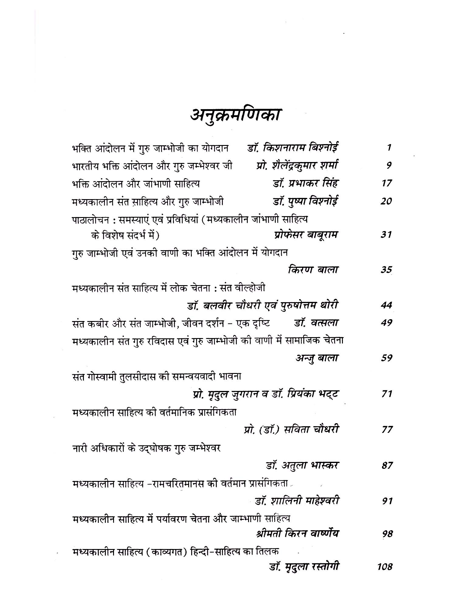 डॉ. करुणाशंकर उपाध्याय (वरिष्ठ प्रोफेसर एवं पूर्व अध्यक्ष, हिन्दी विभाग, मुम्बई विश्वविद्यालय, मुम्बई) हिन्दी साहित्य के यशस्वी नक्षत्र, वर्तमान दौर के बड़े सांस्कृतिक आलोचक डॉ. करुणाशंकर उपाध्याय। 'पाश्चात्य काव्य चिन्तन के विविध आन्दोलन' विषय पर आपने पोस्ट डॉक्टरल किया है। प्रोफेसर उपाध्याय भारतीय और पाश्चात्य कविता व काव्यशास्त्र के अधिकारी विद्वान है। अब तक आपकी बीस मौलिक आलोचनात्मक पुस्तकें तथा एक दर्जन से अधिक सम्पादित पुस्तकें प्रकाशित हो चुकी है। आपके विविध पत्र-पत्रिकाओं में 500 से अधिक शोध लेख भी प्रकाशित हो चुके हैं। अब तक आपको राष्ट्रीय एवं अंतरराष्ट्रीय स्तर पर दो दर्जन से अधिक पुरस्कार/सम्मान प्राप्त हो चुके हैं। आपके मार्गदर्शन में अब तक 35 शोधार्थी पीएच.डी. और 55 शोधार्थी एम.फिल. की उपाधि प्राप्त कर चुके हैं। आपने 'मानव मूल्यपरक शब्दावली का विश्वकोश', 'तुलनात्मक साहित्य का विश्वकोश' का सहलेखन और कई पुस्तकों का सम्पादन किया है। डॉ. पुष्पा विश्नोई (सह-आचार्य, हिन्दी विभाग,राजकीय कन्या स्नातकोत्तर महाविद्यालय, मगरा पूंजला, जोधपुर) विशेषज्ञता : मध्यकालीन हिन्दी संत साहित्य और जम्भवाणी का साहित्यिक एवं समीक्षात्मक अध्ययन अनुशीलन। 'जम्भवाणी में लोक चेतना' विषय पर महाराजा गंगासिंह विश्वविद्यालय, बीकानेर से पीएच.डी. की उपाधि प्राप्त। विभिन राष्ट्रीय एवं अंतरराष्ट्रीय सम्मेलनों में 75 पत्रवाचन और तीन दर्जन से अधिक शोध आलेख विविध पत्र-पत्रिकाओं व पुस्तकों में प्रकाशित। पिछले 22 वर्षों से कॉलेज शिक्षा विभाग में अध्यापन कार्य कराते हुए जांभाणी साहित्य में पर्यावरण दर्शन-2 भाग, संत वील्होजी का साहित्यिक एवं सामाजिक अवदान पुस्तकों का संपादन आपके द्वारा किया जा चुका है। डॉ. रामस्वरूप (स्नातकोत्तर, पीएच.डी., नेट, स्लेट (हिंदी)) 'जांभाणी साहित्य में राम-कृष्ण संबंधी आख्यान काव्य' विषय पर हिंदी विभाग, जयनारायण व्यास विश्वविद्यालय, जोधपुर से पीएच.डी. की उपाधि प्राप्त। सदस्य : जांभाणी साहित्य अकादमी, बीकानेर विशेषज्ञता : जांभाणी साहित्य एवं मध्यकालीन हिंदी संत साहित्य तथा जांभाणी दर्शन में पर्यावरण।