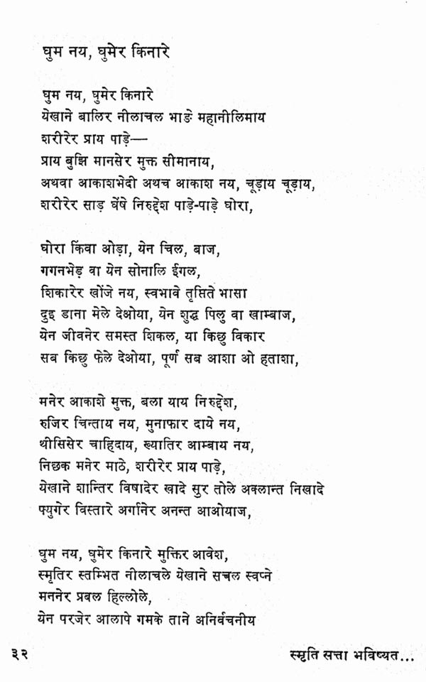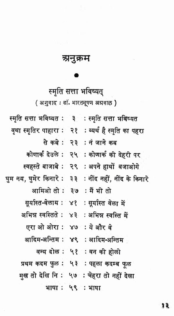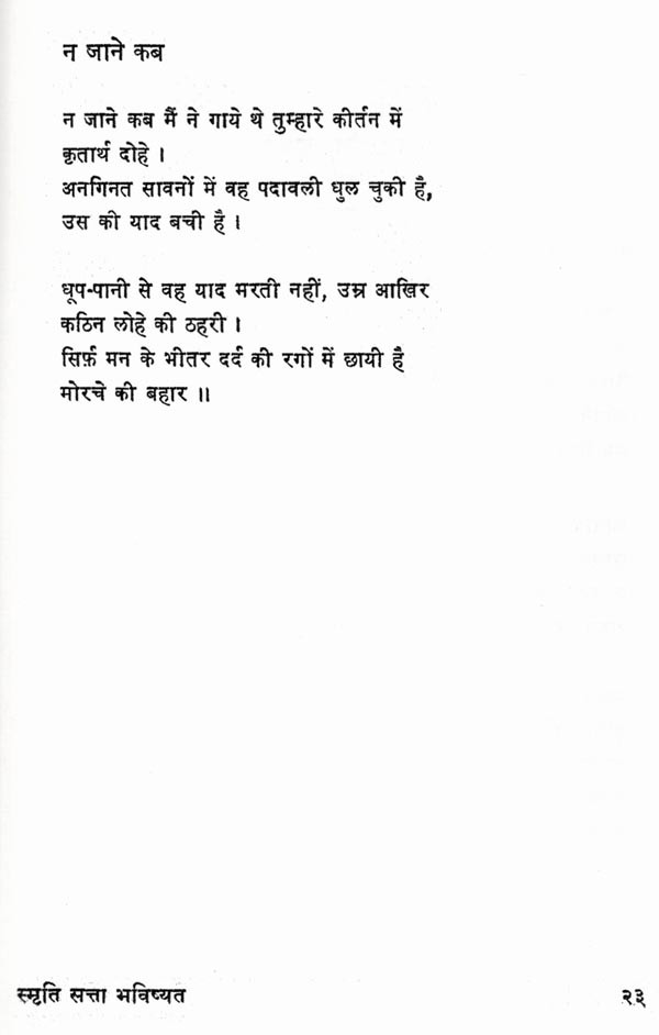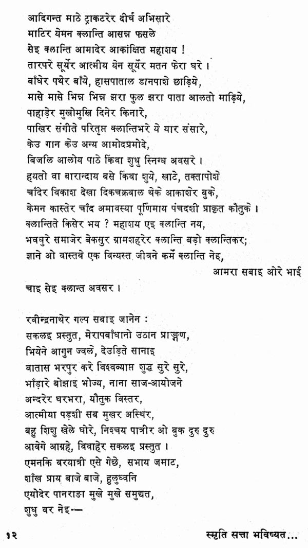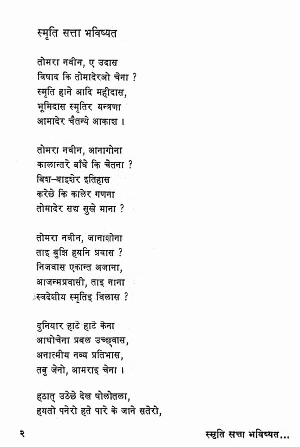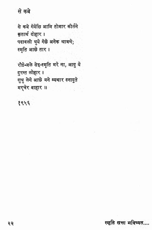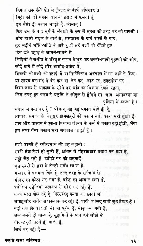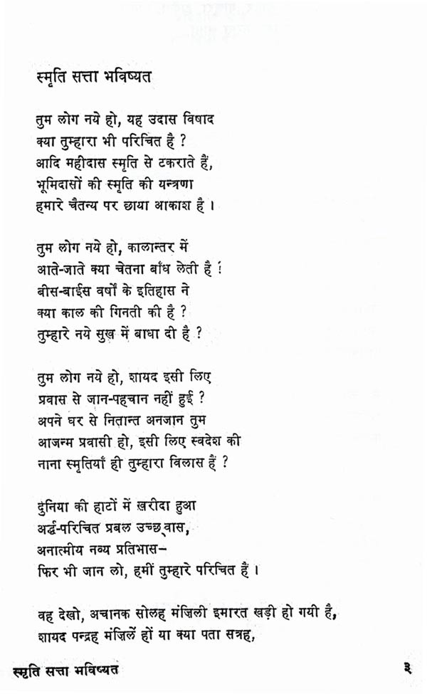कवि के काव्य-विकास के सभी चरणों की परिणति, उनके चिन्तन की सभी धाराओं का संगम, हमारे राष्ट्रीय जीवन के त्रिकाल-गामी आयामों का आकलन, शैली-शिल्प की परिपक्वता और विविधता, सबका स्थायी प्रतिफलन इस कृति में हुआ है। कवि की दृष्टि ने यहाँ मुक्त इतिहास और मानव-भाग्य, व्यक्ति का एकाकीपन और समाज की सामूहिक चेतना, वर्तमान के परिवेश की विच्छिन्नता और अतीत की अनवरतता आदि द्वन्द्वों को भविष्य के उन्नयन की आस्था में समाहृत किया है। जिस शीर्षक पर संग्रह आधारित है, उसके तीन शब्दों की लघुता में व्यक्ति और समष्टि के अतीत (स्मृति), वर्तमान (सत्ता) और भविष्य (भविष्यत्) का चित्रफलक प्रस्तुत किया गया है। कवि की जीवन-दृष्टि को जिस प्रतीक-कथा के माध्यम से यह कविता व्यक्त करती है, वह सन्दर्भरवीन्द्रनाथ की एक रचना से लिया गया है। विवाह के मण्डप में सब तैयारियाँ हो चुकी हैं, अभ्यागत जा गये हैं; पान रचाये.।