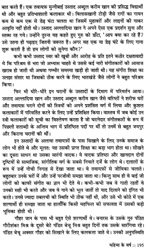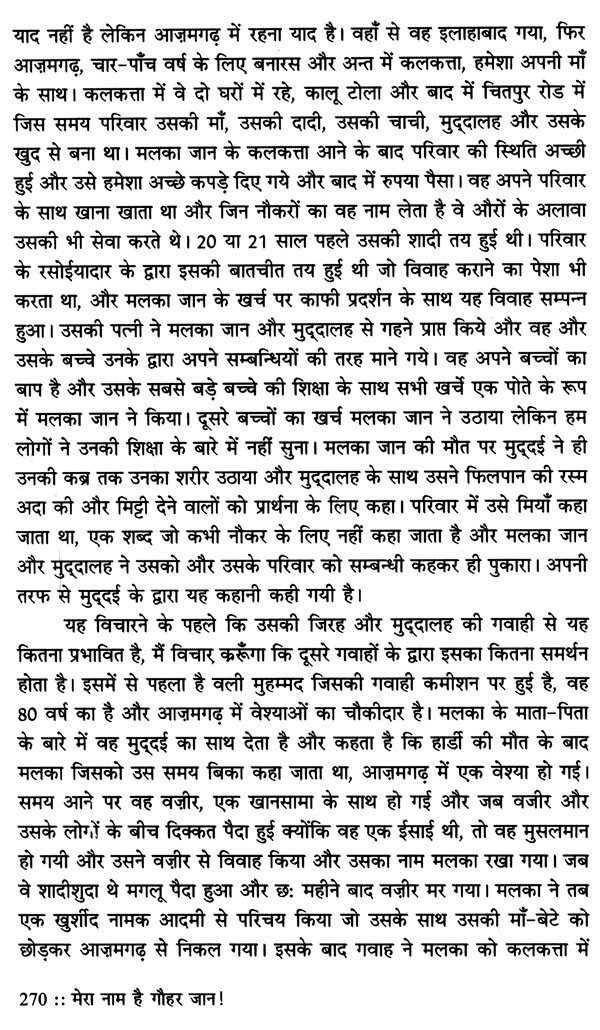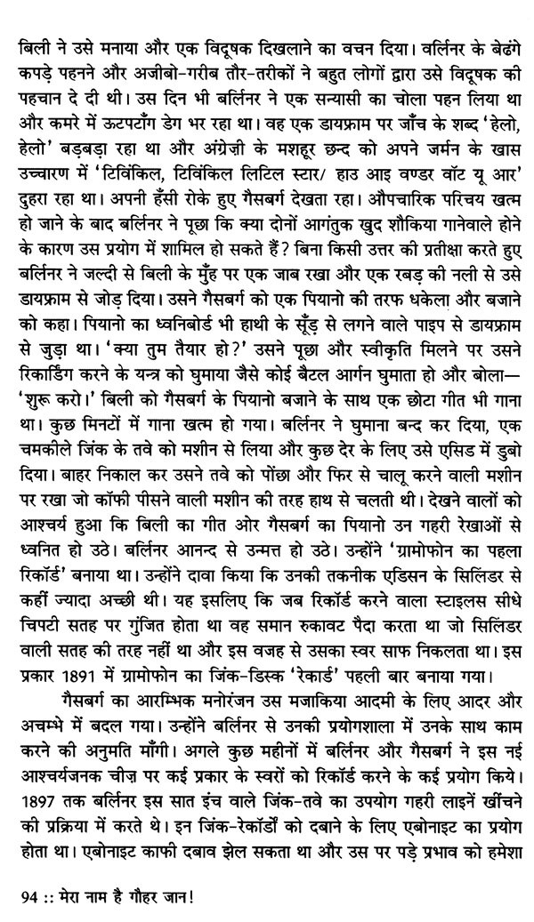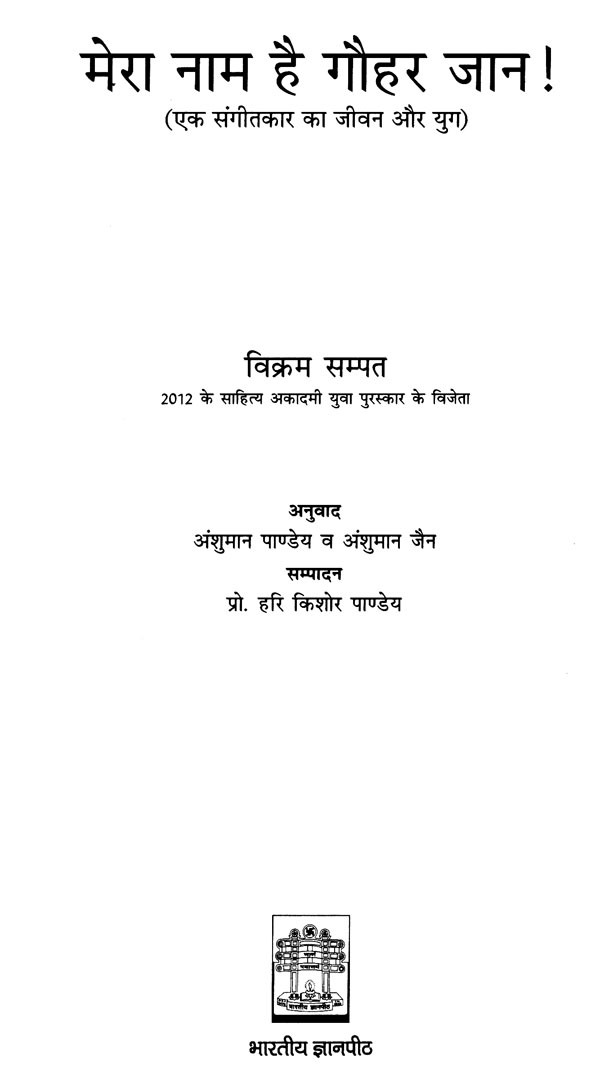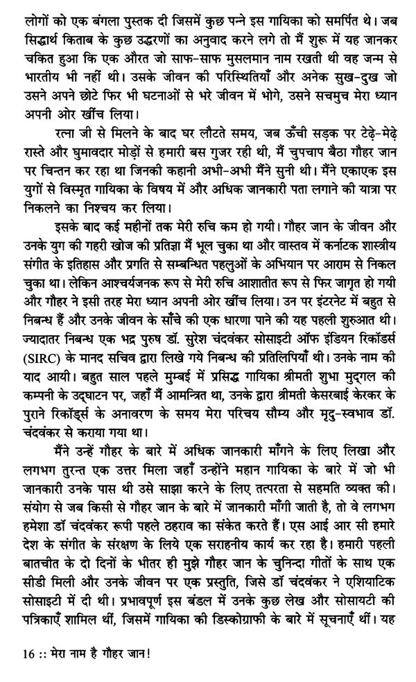 मेरा नाम है गौहर जान... भारतीय संगीत की सबसे पुरानी रिकॉर्डिंग की पहचान इस तीक्ष्ण ध्वनि वाली चुलबुली घोषणा से की जाती है, जिसे गायन के अंत में बोला गया था। गायक की यह घोषणा भारतीय शास्त्रीय संगीत के इतिहास में एक मील का पत्थर साबित हुई जिसने हमारे संगीत की सामग्री, संरचना और प्रस्तुति की शैली को हमेशा के लिए बदल दिया। 20वीं शताब्दी के शुरुआत में भारतीय संगीत क्षेत्र में कोलाहलपूर्ण परिवर्तन देखा गया। कला की पारंपरिक संरक्षिकाएँ, दक्षिण भारत में देवदासियाँ और उत्तर भारत में नाचने वाली लड़कियां और तवायफें, जिन्होंने सदियों से कलाओं का पोषण किया था, वे अंग्रेज़ी सरकार के सदाचार के कानूनों तथा प्रबुद्ध और शिक्षित भारतीय अभिजात वर्ग की कुरीतियों का शिकार हो गईं। इस पुस्तक में एलीन एंजेलिना योवार्ड की कहानी का उल्लेख किया गया है, जो जन्म से अर्मेनियाई क्रिश्चियन थीं और बाद में इस्लाम धर्म अपना लिया। इसके बाद वे गौहर जान के नाम से प्रसिद्ध हुईं। उनका जीवन मिथकों, किंवदंतियों और लोक कथाओं से भरपूर था, जिनमें से कुछ बातें अभिलिखित हैं, कुछ शंकायुक्त हैं। यह पुस्तक उस समय पर भी नजर डालती है, जिस दौरान गौहर जीवित थीं और उत्कृष्ट संगीत का सृजन कर रही थीं। गौहर जान स्वाभाविक रूप से एक प्रतिभाशाली संगीतकार थीं, जिनके पास प्रदर्शनों का विस्तृत भंडार था। भारत में रिकॉर्डिंग तकनीक के आगमन पर मिले अवसरों को अभिग्रहण करने वाली शुरुआती महिला कलाकारों में से वह एक थीं। 1902 में रिकॉर्ड की जाने वाली सबसे पहली भारतीय आवाज उन्हीं की थी और अपने जीवनकाल में उन्होंने लगभग 600 रिकॉर्ड्स बनाए। उनके संगीत के माध्यम से यहाँ हिंदुस्तानी संगीत की विभिन्न शैलियों का विश्लेषण करने का प्रयास भी किया गया है, जिन्हें गौहर और उन जैसी गायिकाओं ने लोकप्रिय बनाया, जैसे ठुमरी, दादरा और ग़ज्जल। पुस्तक में भारत में रिकॉर्डिंग उद्योग के विकास और भारतीय संगीत, रंगमंच और सामाजिक जीवन पर इसके प्रभाव का भी संक्षिप्त वर्णन किया गया है।