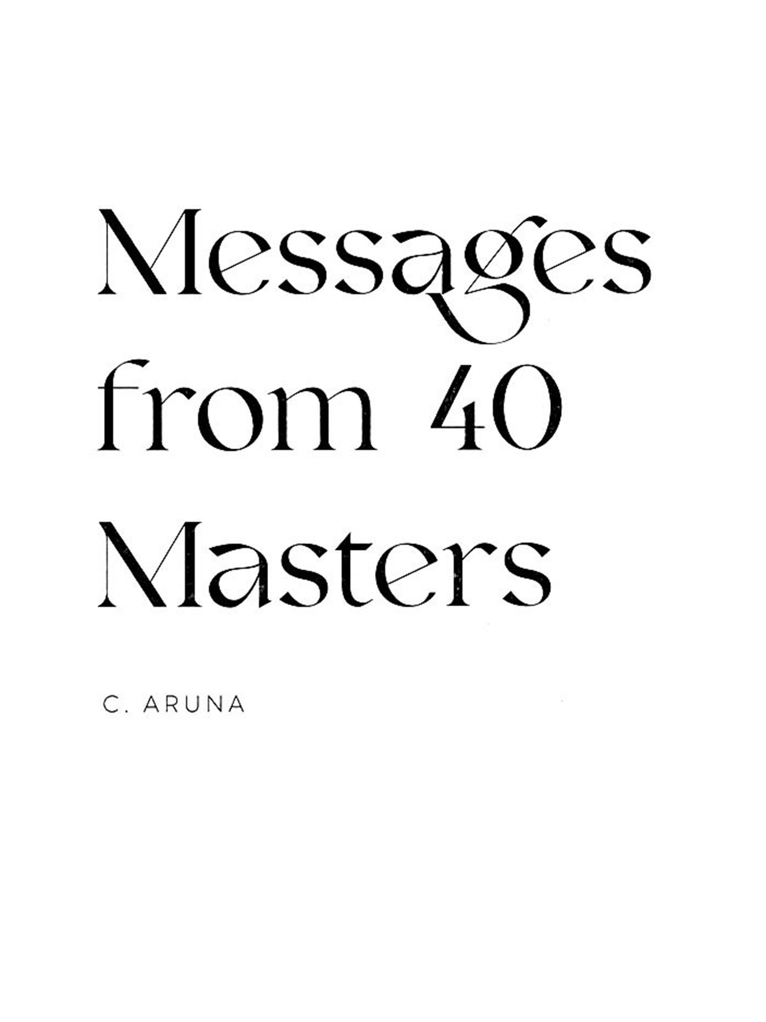 Messages from 40 Masters"" is channelled material by C. Aruna. She received these messages from 40 remarkable personages through auto-writing during the years 1993-1995. This book is original research in Spirituality to bring light to the general public and inspire your calling for spiritual urgency. Every message from these enlightened beings will take you through a new wave of transformation, which you may have been seeking for a long time. Make this book your guiding energy in the path of your soul journey.