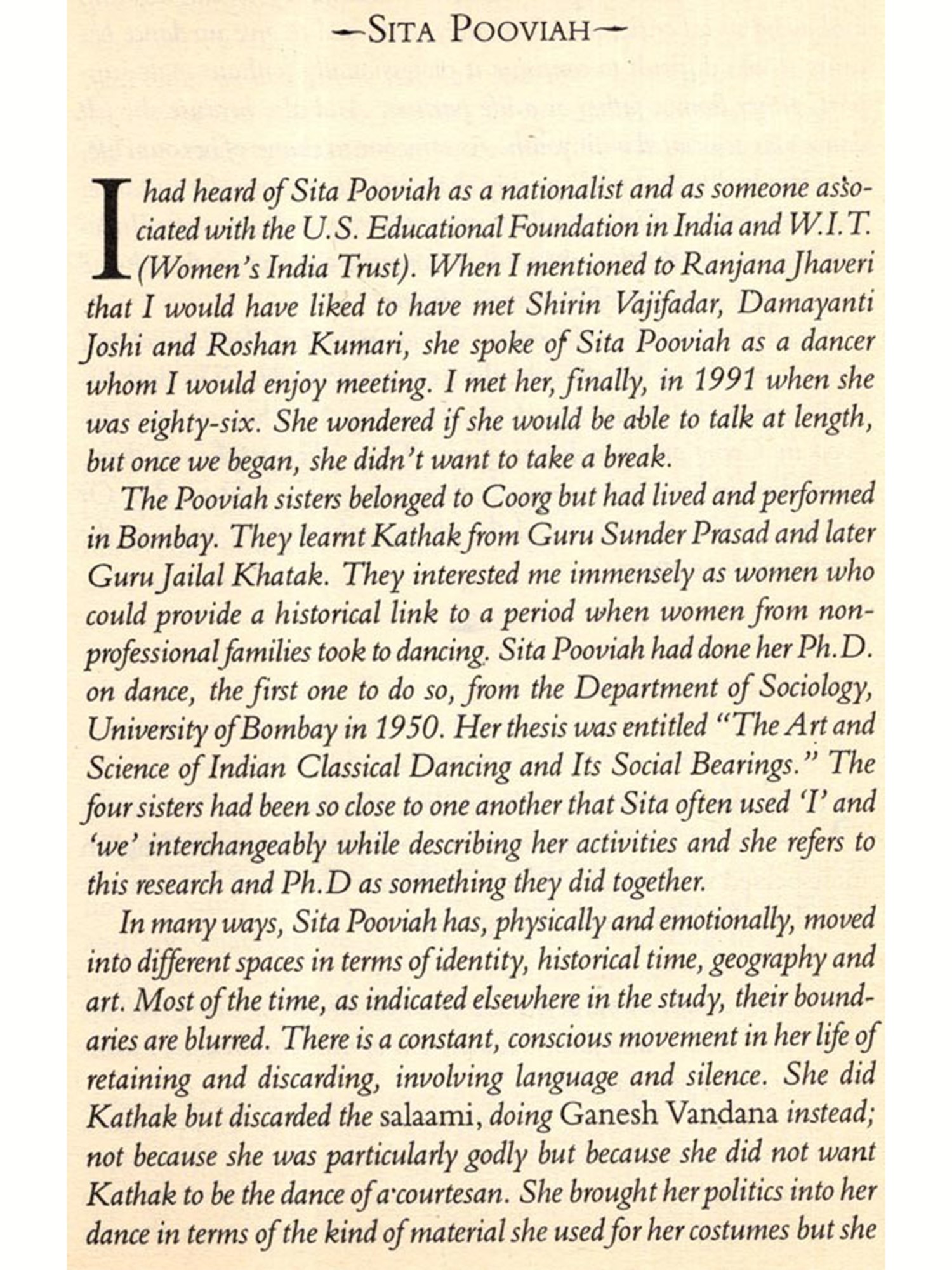 The choice of oral history as a methodology for this study was born of several of my own needs as a researcher, looking at women's lives. The word "look" is important because I did not want to see them with blinkers on. My purpose was not to essentialise either their gender or their art; rather it was to understand their lives and art without the bindings of specificities in terms of gender and art. The reason for looking at women who pursue different interests in dance, music and painting was not to "uproot" them from their artistic context and group them together as women in some kind of a "ghetto of the feminine," and so trace a commonality in their lives and in their art; nor was it to see them as creating a kind of counter-culture of matriarchal aesthetics, which I thought would freeze them in my study even before I met them. What I really wanted was to try and understand them as women sharing a historical context, living and functioning as women and as artists, in a patriarchal society that fixed them in particular ways. Their varied lives and expression would thus form a collage which would contain a thousand different answers spoken in a thousand different voices. But the questions posed had to be different. As Christa Wolf says, it should "no longer be the murderous who did what to whom" with the "if this /then that; because/therefore; not only/but also kind of logic" (Wolf 1985: 107). I had to choose a method that would afford non-specificity. I decided on oral history and pictures as devices that would grant me, and the women I was planning to speak to, the freedom to "be".