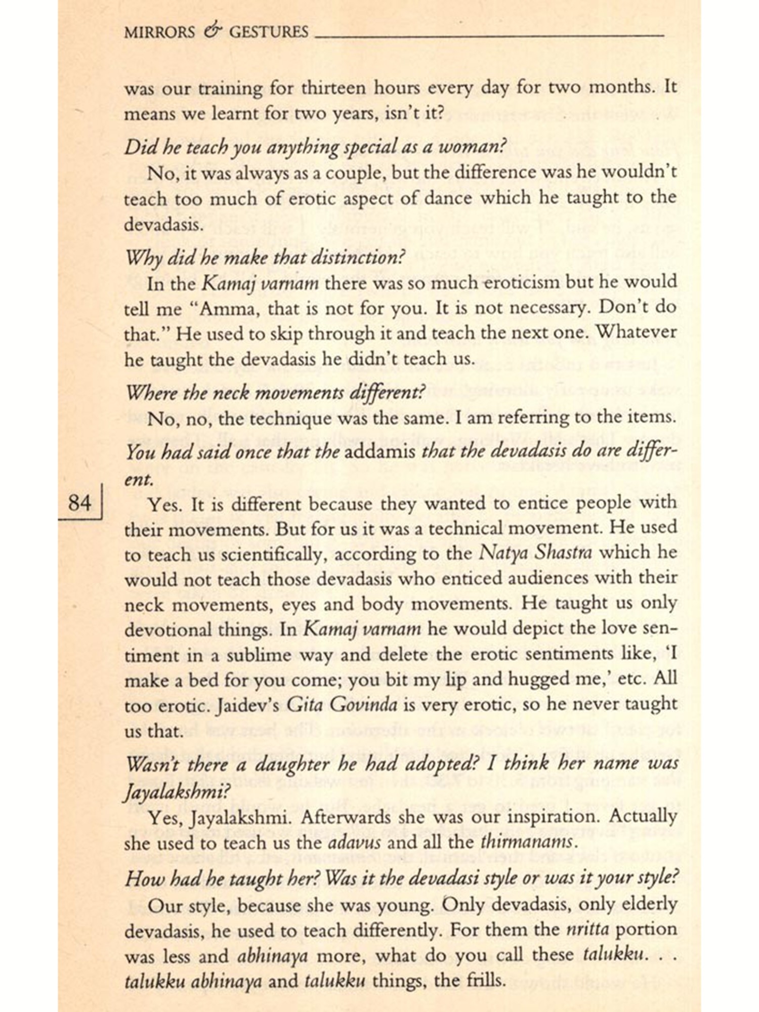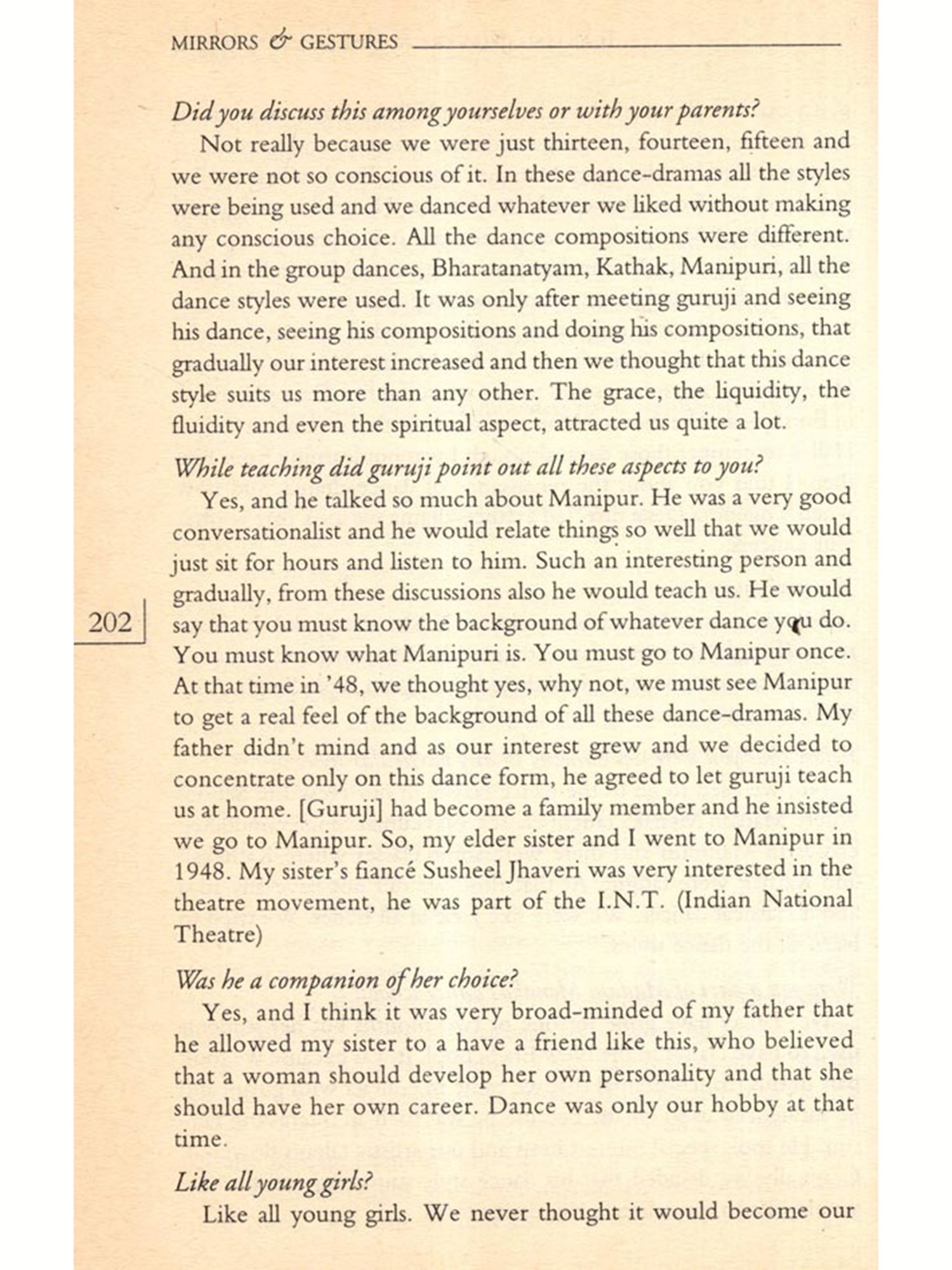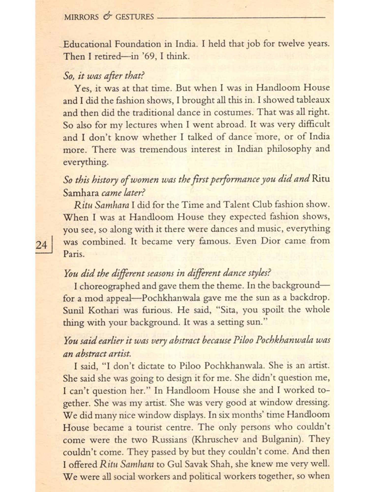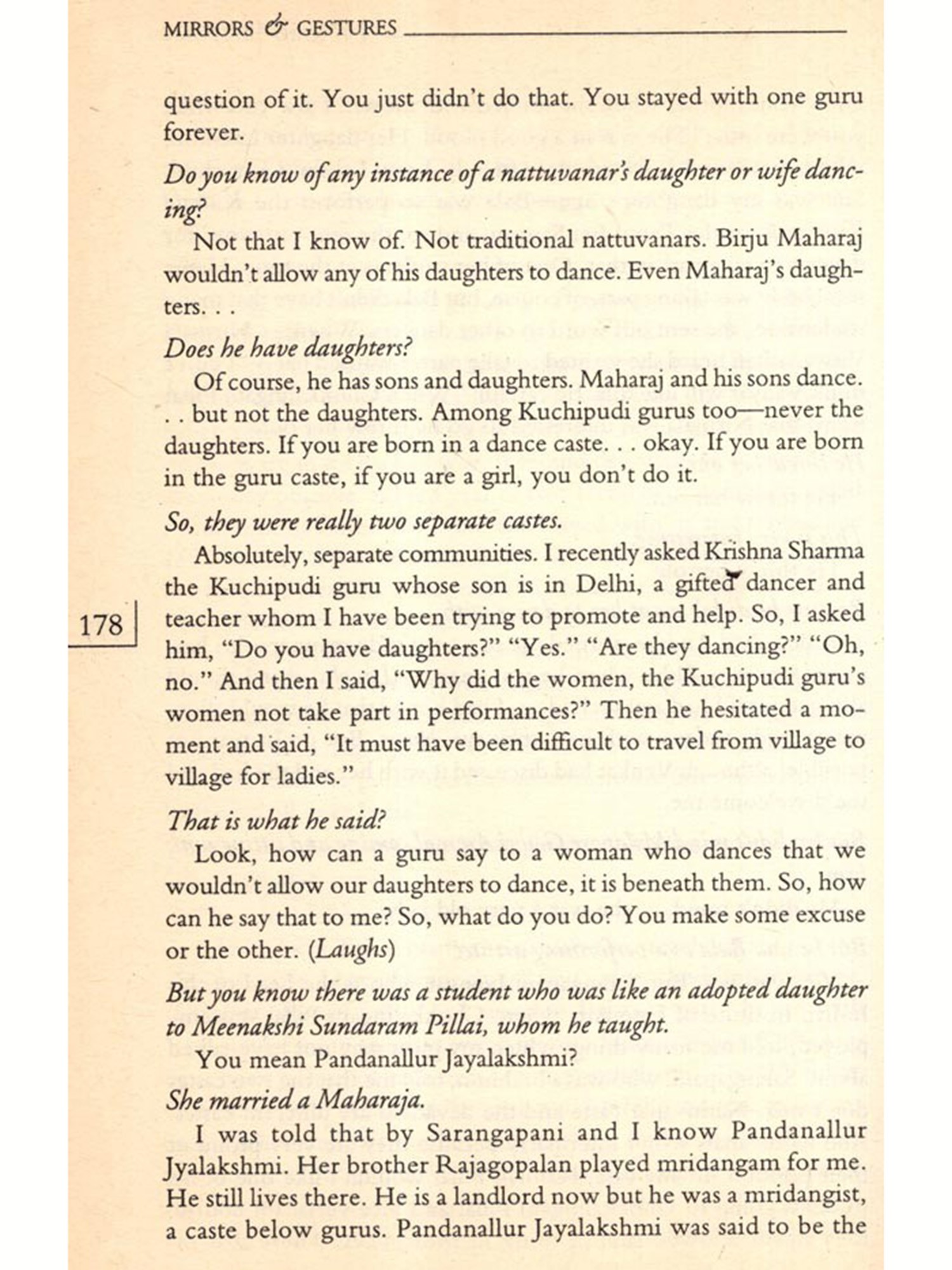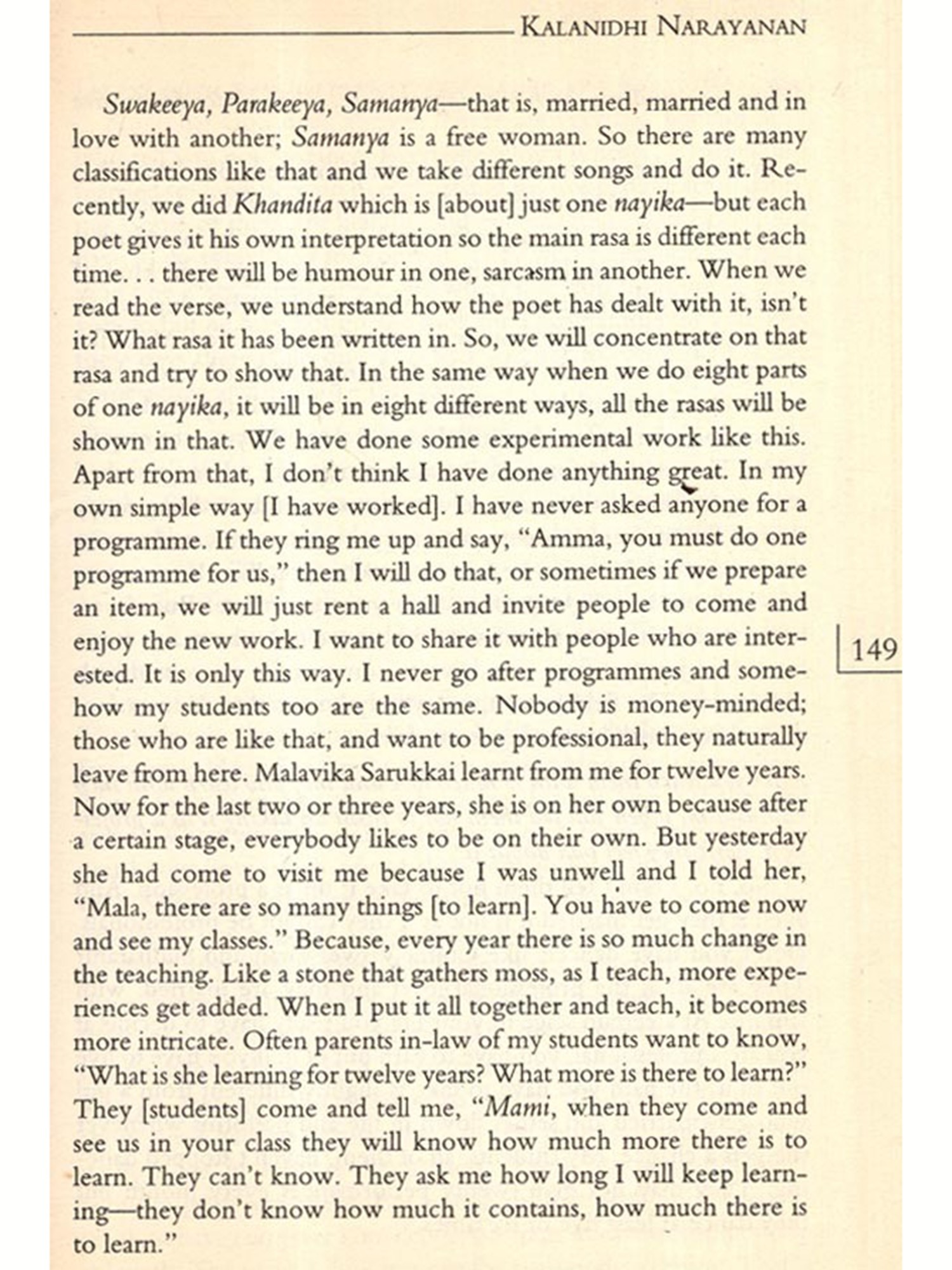 Many of them had been interviewed before on several occasions either by the press or others who wanted to write about them. Some excellent pieces had been published on specific artistes; their voices had been heard before. But I wanted them to talk about their lives in general, to learn about how art was to be taken into account as a factor in their everyday lives; how they sustained their art over the years, how it influenced their decisions in life; why they continued to pursue it; did they have choices; what their family life was like; and how they looked upon life as a whole. I wanted this because I felt that from their narrated life stories would emerge portraits of women artistes, bearing the marks of everyday life; containing the silent elements and silencing processes of their lives and art. These portraits would present a history of their own. Not a linear history nor one that looked at their lives in terms of "rupture points", but a history covering a broad spectrum of their lives as children; as young or old persons; as travellers, as daughters, spinsters, wives, mothers and as artistes; and all these not as separate categories but as interlinked components; a history touched by the flow of their lives.