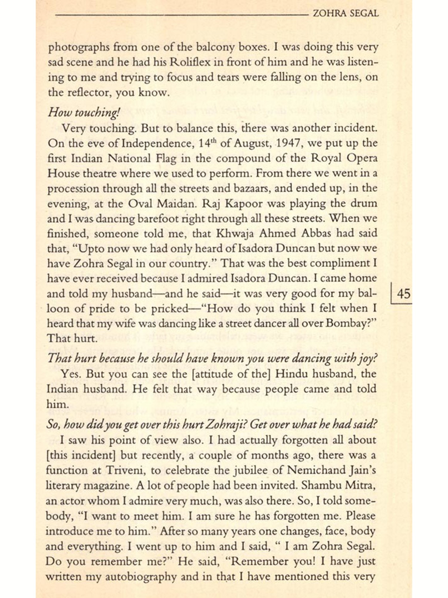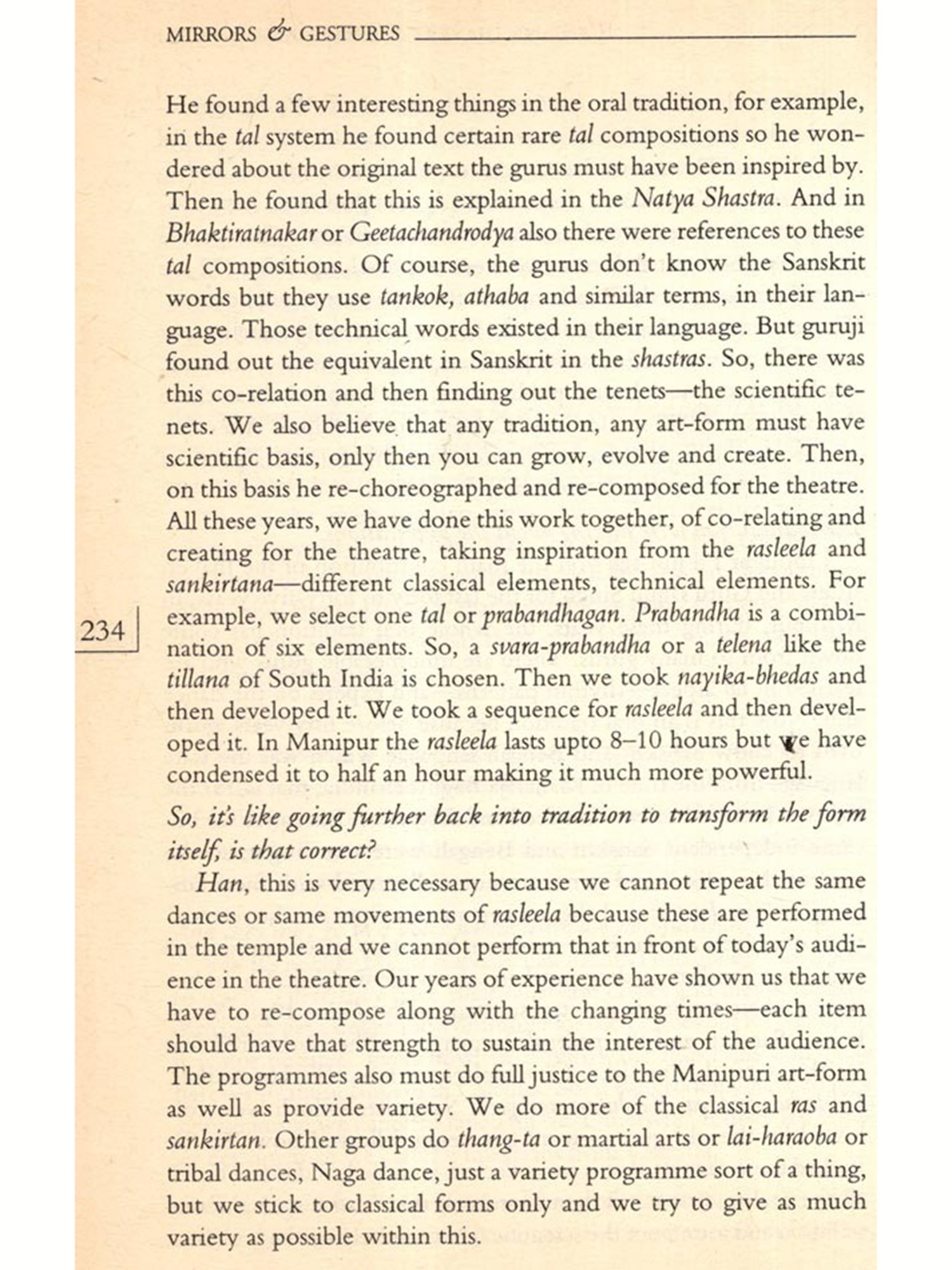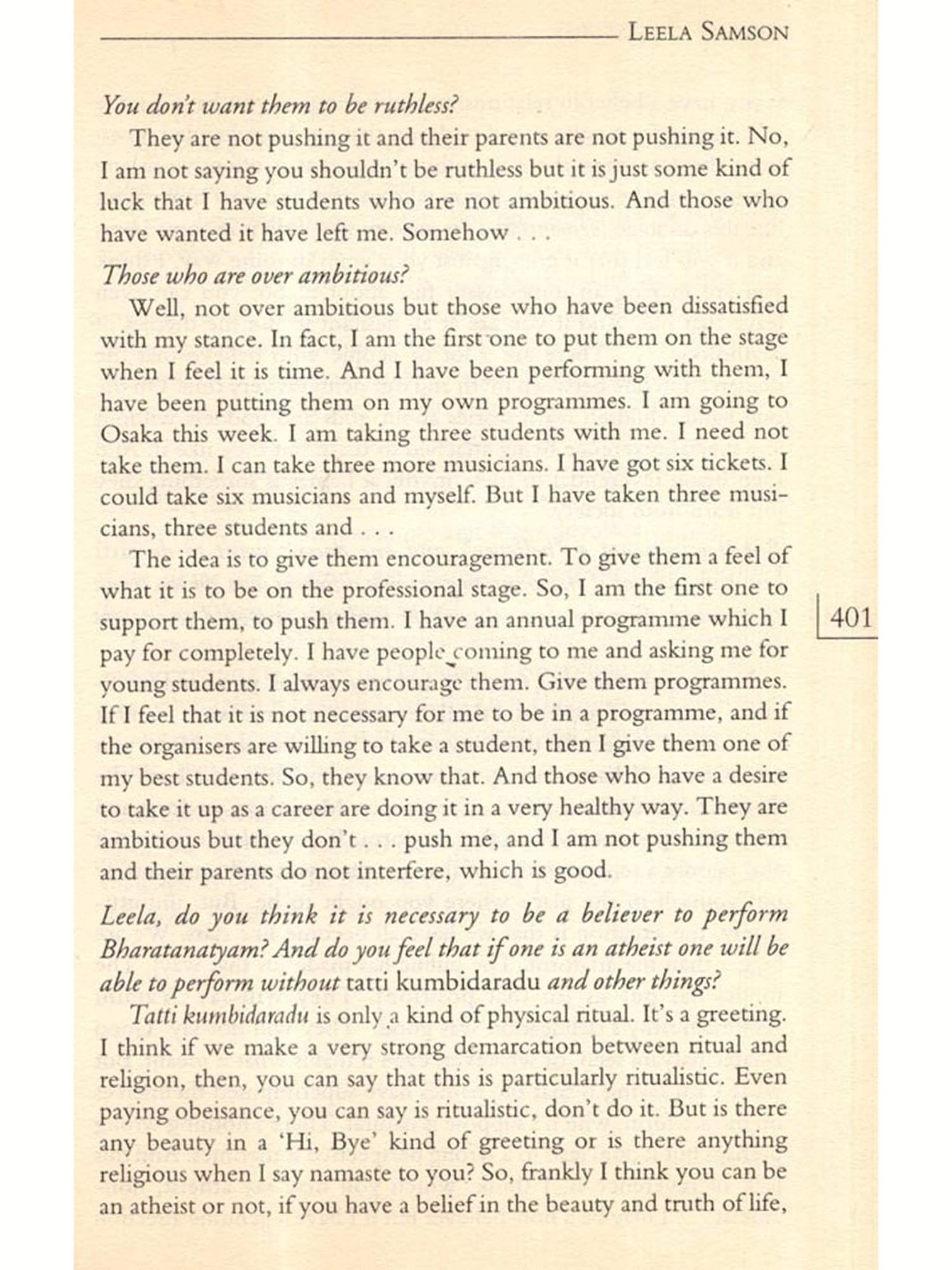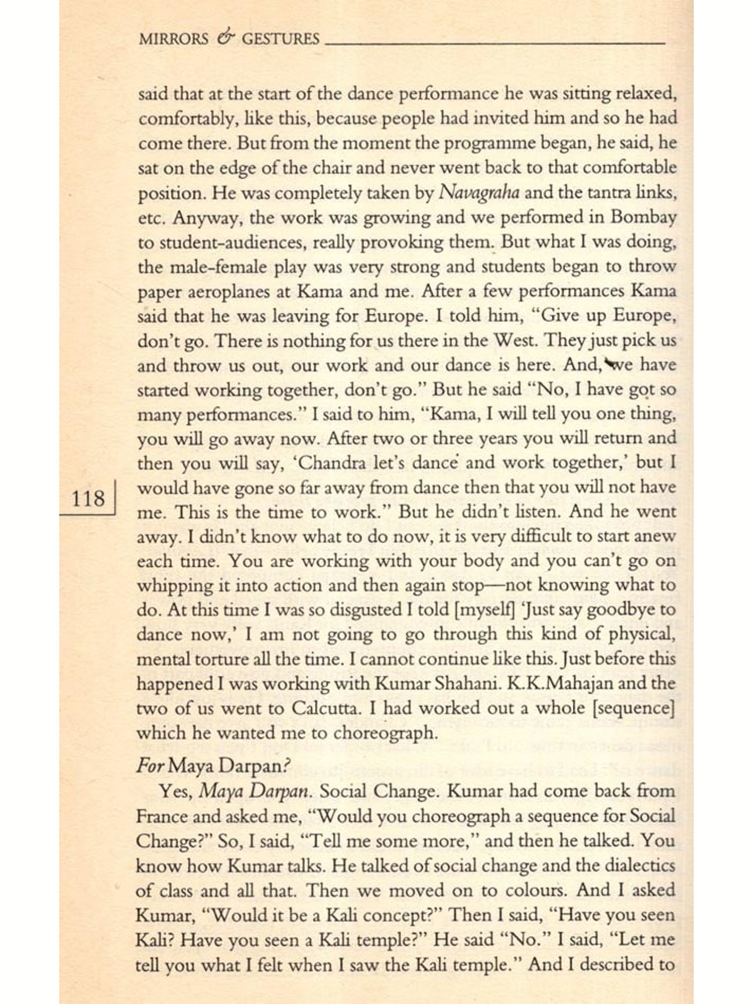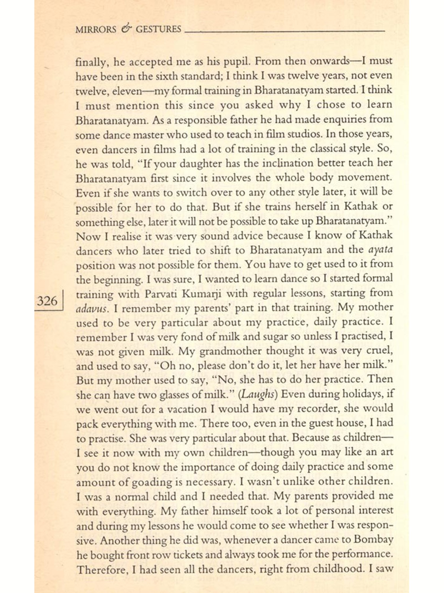 Many of them had been interviewed before on several occasions either by the press or others who wanted to write about them. Some excellent pieces had been published on specific artistes; their voices had been heard before. But I wanted them to talk about their lives in general, to learn about how art was to be taken into account as a factor in their everyday lives; how they sustained their art over the years, how it influenced their decisions in life; why they continued to pursue it; did they have choices; what their family life was like; and how they looked upon life as a whole. I wanted this because I felt that from their narrated life stories would emerge portraits of women artistes, bearing the marks of everyday life; containing the silent elements and silencing processes of their lives and art. These portraits would present a history of their own. Not a linear history nor one that looked at their lives in terms of "rupture points", but a history covering a broad spectrum of their lives as children; as young or old persons; as travellers, as daughters, spinsters, wives, mothers and as artistes; and all these not as separate categories but as interlinked components; a history touched by the flow of their lives.