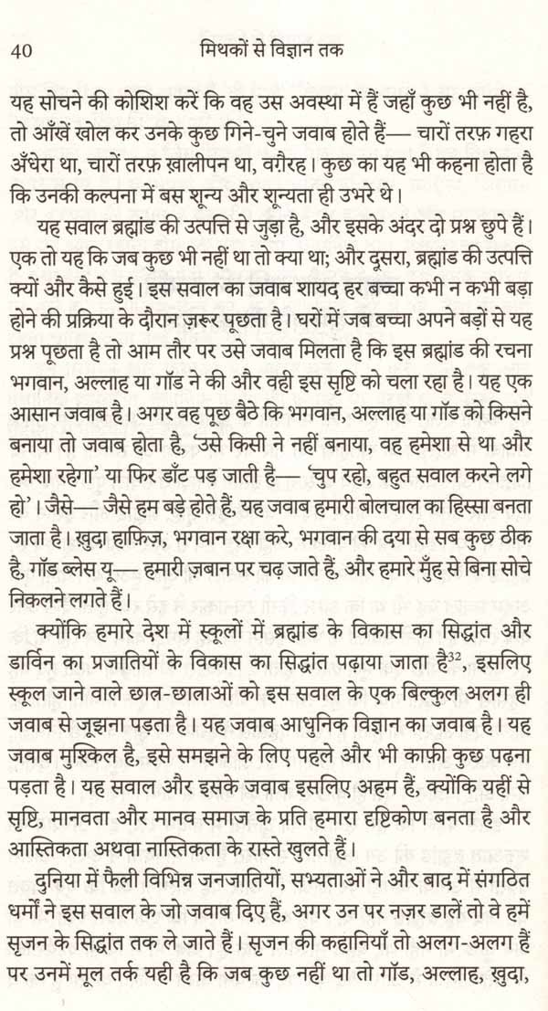 ये सवाल उठने ज़रूरी थे कि क्या सारे धर्म एक जैसे हैं, क्या इनका तर्कसंगत और वैज्ञानिक सोच से कोई लेना देना नहीं है? क्या धर्म, आस्था, परंपरा, अंधविश्वास और मान्यता अलग-अलग हैं और इनका विज्ञान से रिश्ता एक जैसा नहीं, अलग-अलग है? विज्ञान और धर्म एक-दूसरे के विरोधी हैं या पूरक? क्या एक बेहद धार्मिक शख्स अच्छा वैज्ञानिक हो सकता है? क्या विज्ञान लोगों को अधर्मी बनाता है? क्या एक अत्यधिक धार्मिक समाज में वैज्ञानिक दृष्टि पनप सकती है? ये सारे मुद्दे मुझे लंबे अरसे से परेशान करते रहे हैं और इस किताव के लिखने के पीछे मुख्य रूप से यही सरोकार रहे हैं।