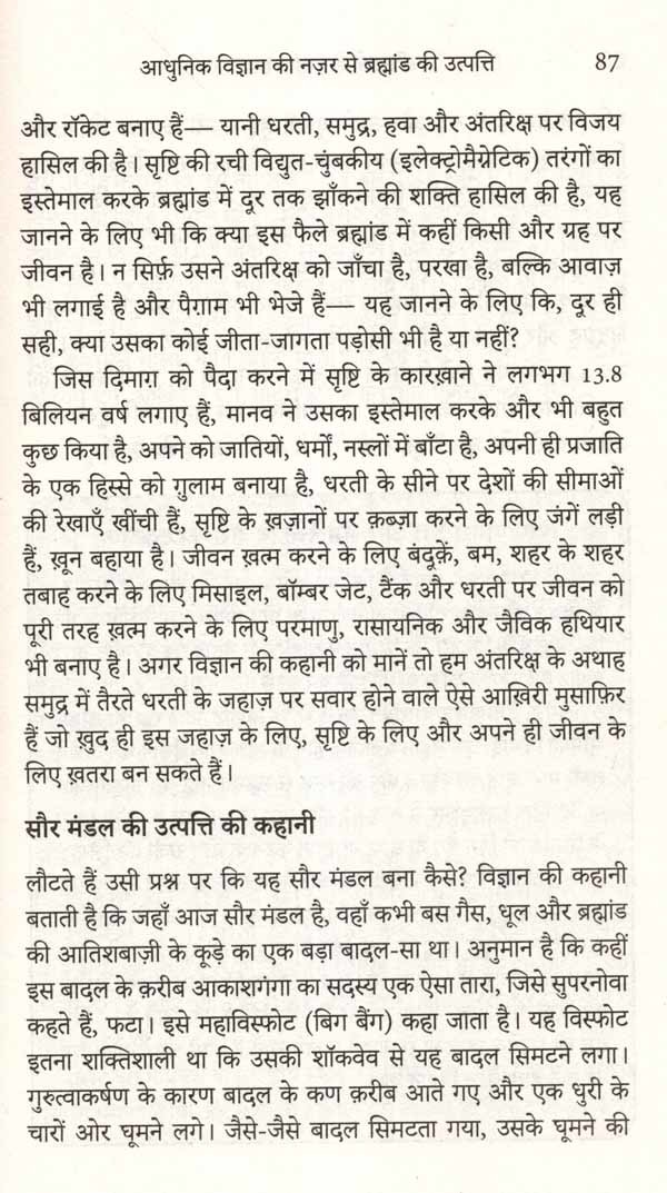 इस किताब को लिखने के लिए किसी ने न मुझ से कहा, न ज़ोर डाला। इस किताब को लिखना मेरा फ़ैसला था। इसके लिखने की कई वजहें हैं। पहली तो यह कि विज्ञान और धर्म या मज़हब के रिश्तों की उलझनों ने स्कूल के ज़माने में ही मुझे घेर लिया था। घर में विज्ञान और वैज्ञानिक सोच का राज था तथा स्कूल और समाज में धर्म का। जैसे-जैसे शिक्षा और अध्ययन बढ़ता गया, दोस्तों और कभी-कभी शिक्षकों और परिवार के उन बुजुर्गों से, जो बेहद धार्मिक थे, वहस की गहराई भी बढ़ती गई। अकसर ऐसा भी होता कि बहस इस पर ख़त्म होती कि तुम 'काफ़िर हो', 'नास्तिक हो, 'मुलहिद (विधर्मी)' हो, 'दहरिये यानी भौतिकतावादी' हो। तुमसे कौन बहस करे।