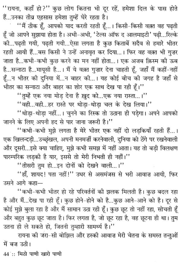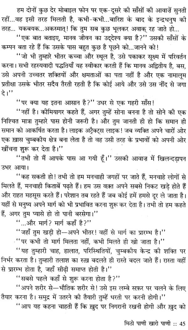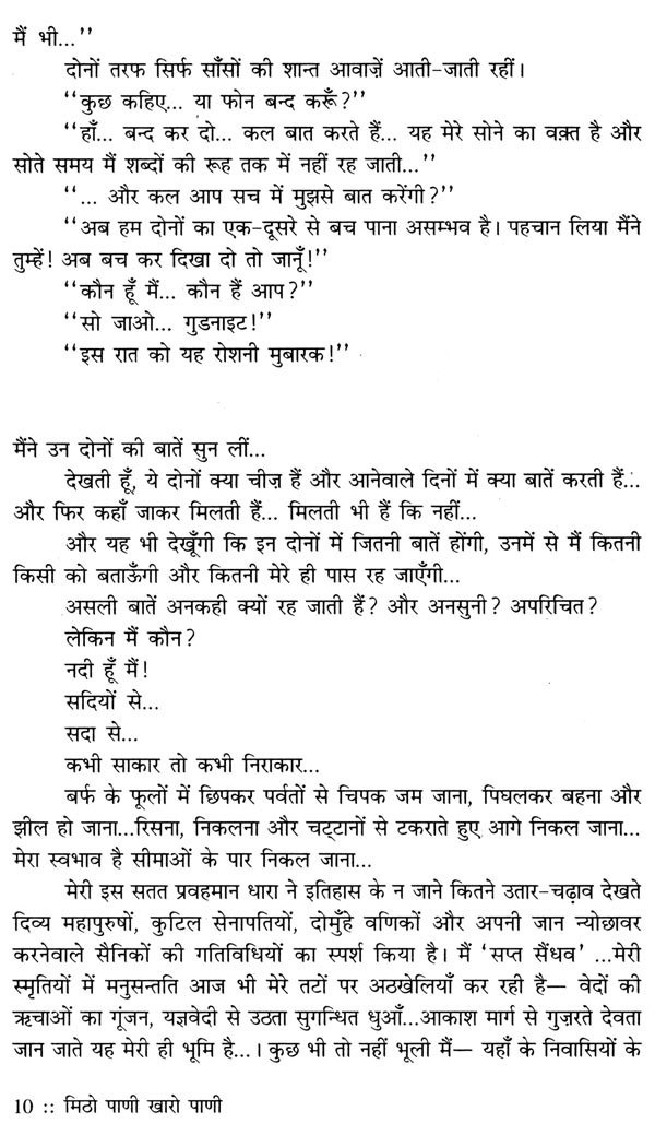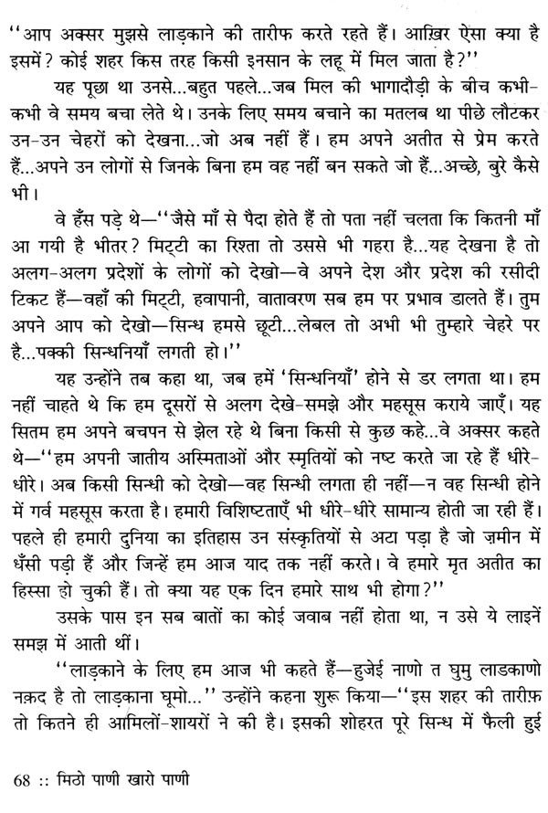 मिठो पानी 'सिन्धु नदी' से खारो पानी 'अरब सागर' तक की यह यात्रा एक दिलचस्प भौगोलिक यात्रा तो है ही, एक पूरी संस्कृति और सभ्यता को दर्शाने वाली आन्तरिक यात्रा भी है। यह कृति इस पूरी सभ्यता की कई सहस्राब्दियों के जन-इतिहास एवं लोक-चेतना को रेखांकित करती हुई एक अविरल हिन्दुस्तानी सभ्यता एवं संस्कृति की समीक्षा के साथ-साथ इसे एक नया अर्थ एवं आयाम देती है।