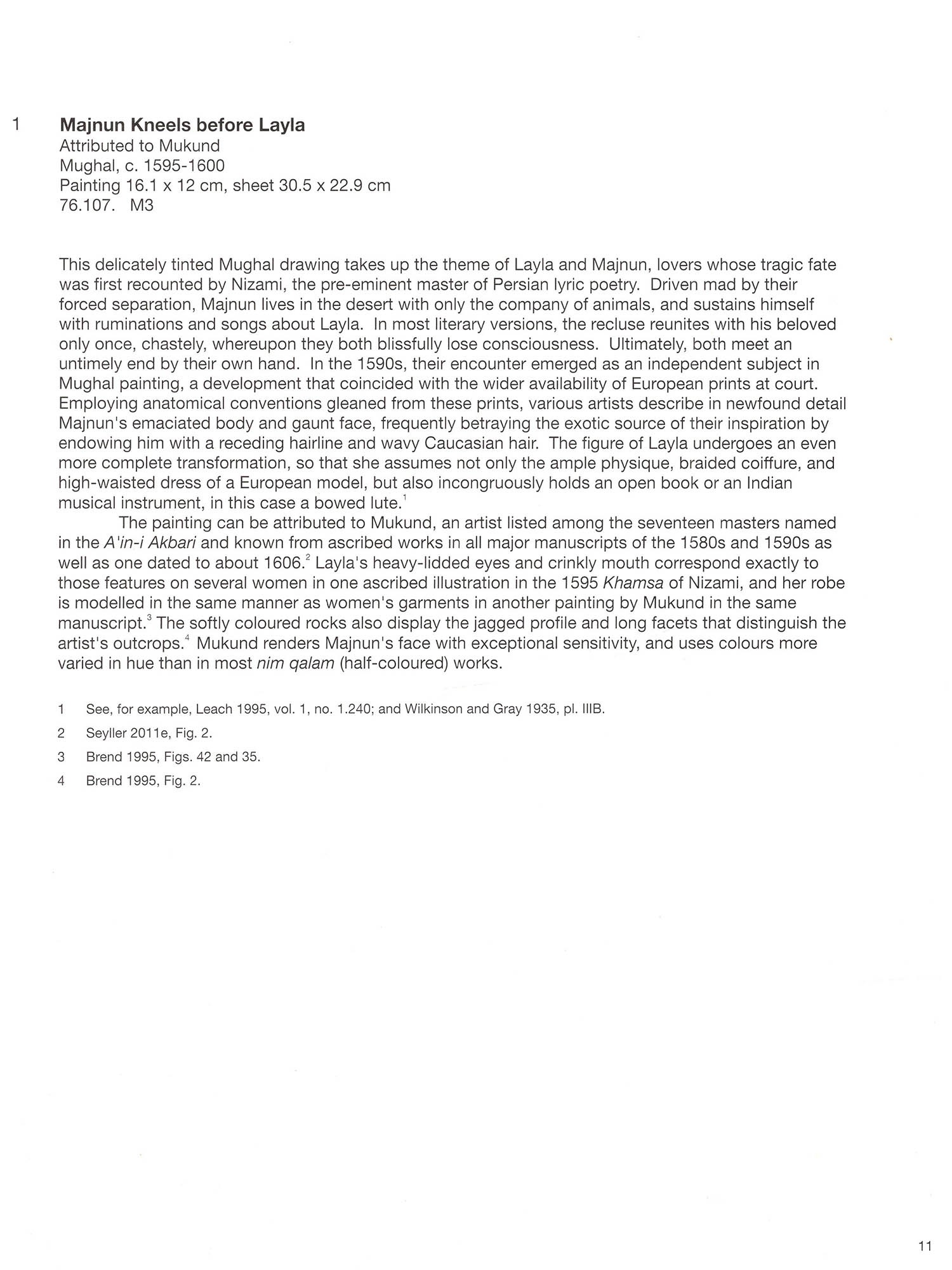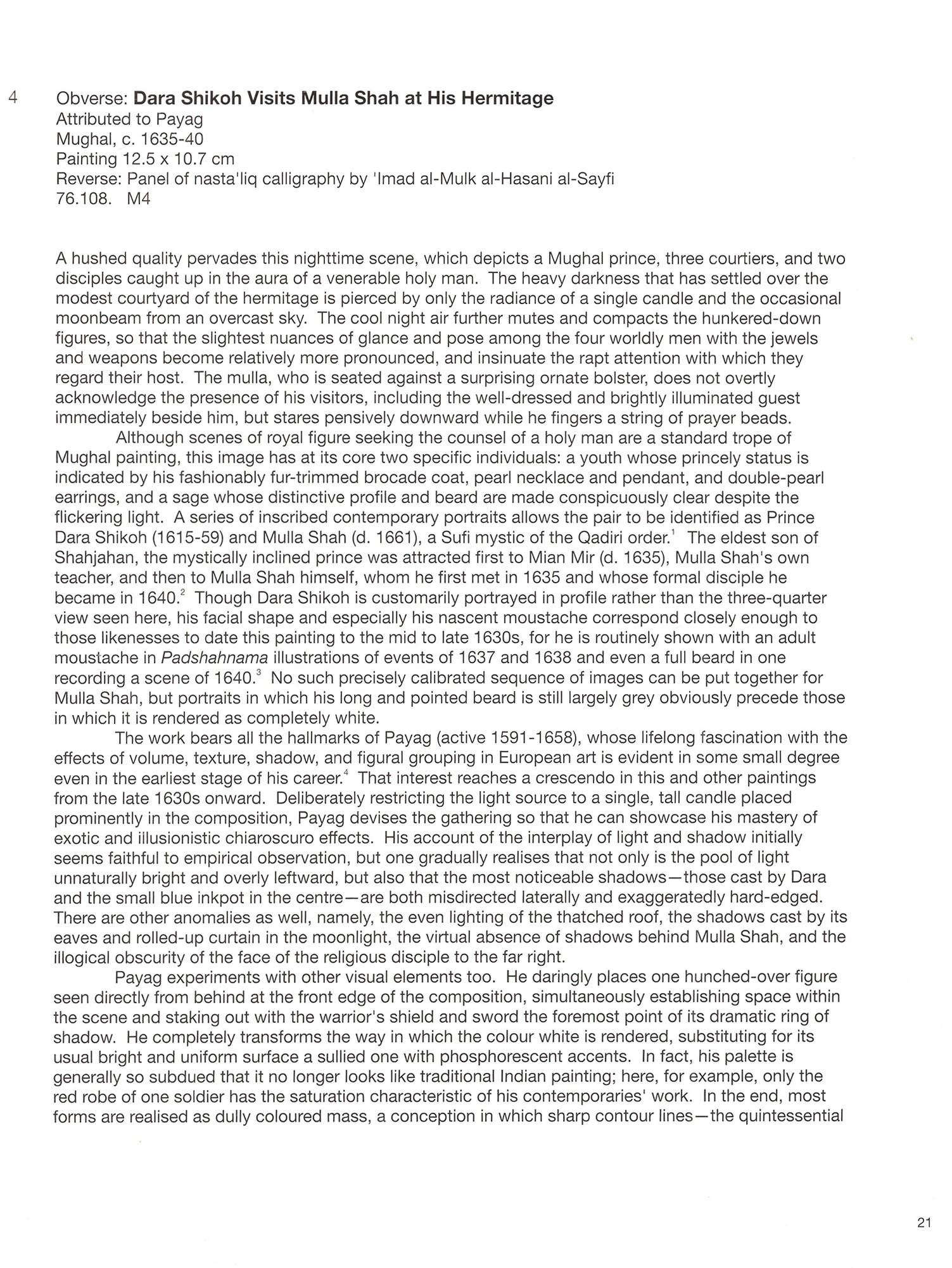 No other dynasty has dominated the Indian stage as the Mughal dynasty (1526-1857). The Mughals-whose name is an Arabicised form of the Persian name for Mongols-were a Central Asian people who traced both halves of their lineage to two celebrated conquerors, Genghis Khan (c. 1162-1227) and Timur (1336-1405). At the end of the 15" century, they were still a minor power contending for rule in present-day Afghanistan and Transoxiana (the lands on both sides of the Oxus River). After assaults on Kabul and Samarqand, which the Mughals regarded as their ancestral homeland, Babur (1483-1530) made an initial venture into the northwestern part of present-day -day Pakistan Pak in 1505. In 1519, he followed this up with the first of four ever more determined campaigns, even bestowing on his newborn son the Turkish name Hindal ("Take Indial") to rally his troops. The decisive moment in the last of these came on 21 April 1526, when Babur defeated the vastly larger army of Sultan Ibrahim Lodi on the plains at Panipat north of Delhi. A new empire emerged with its capital at Delhi. After the death of Babur (r. 1526-30) and the succession of his son, the hapless Emperor Humayun (r. 1530-40, 1555-56), the initial Mughal territorial gains in northern India were soon reversed, and Humayun suffered the ignominy of being driven into exile into Iran for about a decade beginning in 1544. But Humayun eventually won back Kabul and Delhi, only to die accidentally in January 1556. His premature demise led to the accession of his thirteen-year-old but extremely capable son, Akbar (r.1556-1605), whose political acumen led him to grasp the advantages of a more inclusive attitude toward his new Indian subjects. The emperor forged alliances with powerful Rajput clans through royal marriages, abolished the poll tax on non-Muslims, and personally adopted many Indian customs, including vegetarianism on certain days of the week. Together with a series of successful military campaigns in Rajasthan, Bengal, Central India, the northern Deccan, and the northwest, this approach facilitated a rapid territorial expansion and consolidation of power, Akbar quickly established a painting atelier, dominated at first by six or seven émigré Iranian artists, but soon enlarged to fifty artists, nearly all of them native-born Hindus. Most recruits to the increasingly cosmopolitan atelier adopted Persian compositional and figure types and strove to approximate the palette and technical finish of Safavid painting, but inevitably brought with them some of the aesthetic sensibilities and formal elements of the indigenous Indian tradition. The growth in the size of the painting workshop fostered the development of bureaucratic mechanisms that ensured a relatively homogeneous workshop style for each project. It also produced an elaborate system of record keeping, whose primary feature was ascriptions written by clerks on the borders of manuscript illustrations. These document the work of as many as 130 artists, often specifying the role that each played in the collaborative effort of a team of two or three artists, and sometimes even prescribing the amount of time the artist was to spend on the painting. These records have allowed scholars to identify and track to a remarkable degree the incremental changes in the work of individual artists. The consistent naming of painters surely reflects the increased status of the artist, a trend also seen in late 16-century Safavid painting. The ranks of the imperial Mughal atelier contracted tremendously about 1600, apparently even before Prince Salim rebelled and set up a satellite court at Allahabad at that time. Many of the best artists followed the heir-apparent to Allahabad, and returned with him to the Mughal court proper upon his accession in 1605, when he took the name Jahangir ("World-Seizer"). Under Jahangir, a connoisseur who boasted of his ability to distinguish one artist from another even in details as small as an eyebrow, the emphasis in painting shifted from copiously illustrated manuscripts to fewer and more refined individual paintings that were gathered into albums. Many artists such as Bichitr (cat. no. 5) brought their works to an unprecedented level of technical brilliance, and complemented album pages filled with exquisite calligraphic specimens and illuminations with figural and floral borders so astonishing that they rival independent paintings. Although biographical information about artists is rare-and was usually limited to their patrimony-their individual styles truly did become ever more distinctive, partly because it became standard practice to work alone (e.g., cat. no. 5). Together with issues of patronage and chronology, the meticulous identification of the personal styles of scores of imperial Mughal artists has been a large part of the extensive scholarship of Mughal painting, and is a prominent feature of this catalogue. By contrast, former artists who were compelled to find employment with lesser patrons at the court (e.g., cat. no. 14), at provincial centres (cat. no. 16), or even in a commercial environment (cat nos. 7-10) mostly languished in anonymity. Away from the high demands and remuneration of the court, technical standards slackened and more indigenous elements were assimilated and generally came to the fore One crucial aspect of 16 and 17"-century Mughal painting is its fascination with European models, both for the power of its sacred imagery-especially of the Madonna (cat. nos. 11-12)-and as a source of many fresh visual ideas and techniques. Among these are a tempering of the traditionally brilliant palette of Persian and Indian painting, the limited use of crosshatching and contour shading to enhance figural volume, the complex layering of figures within architectural spaces, and the systematic diminution of forms and application of atmospheric perspective in a receding landscape. While Mughal artists employed these various devices to carve out discrete