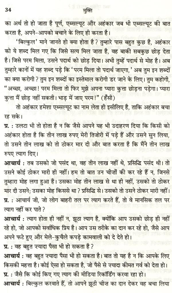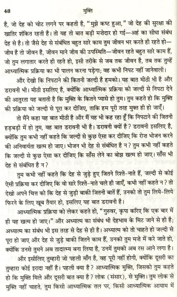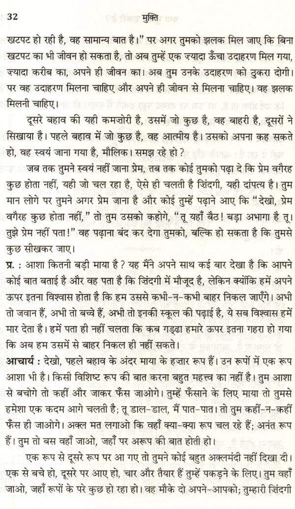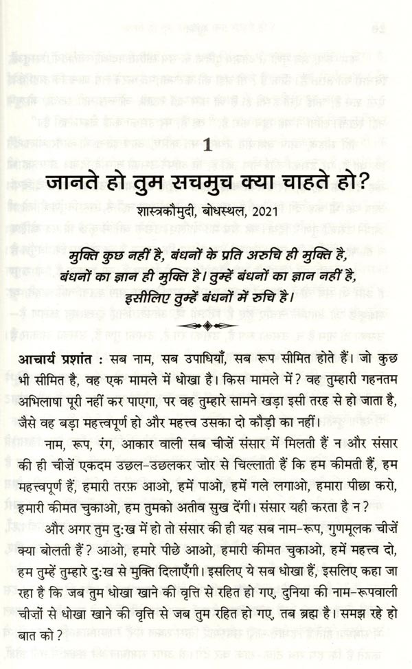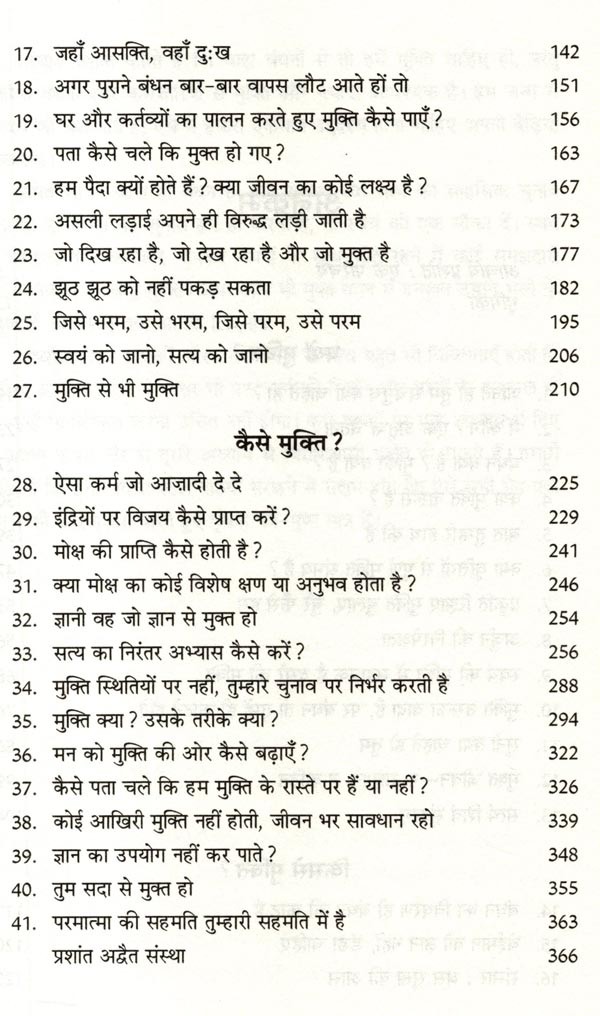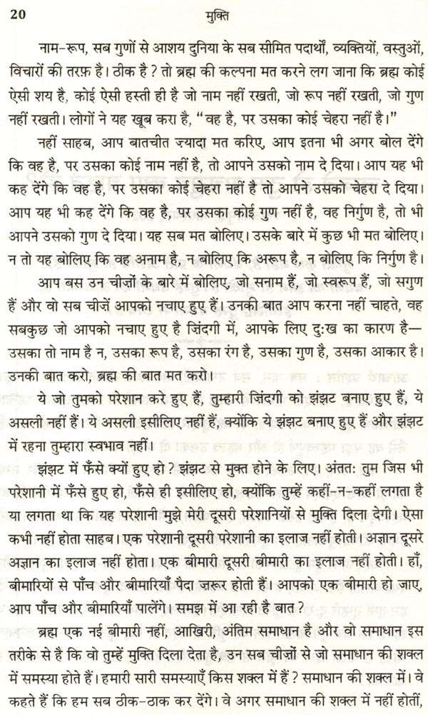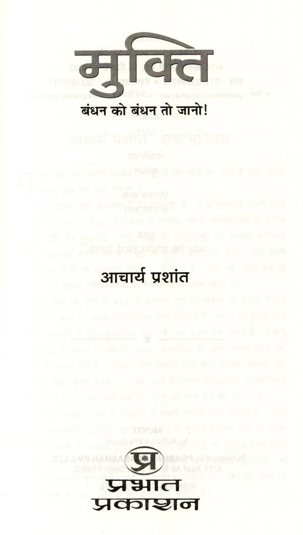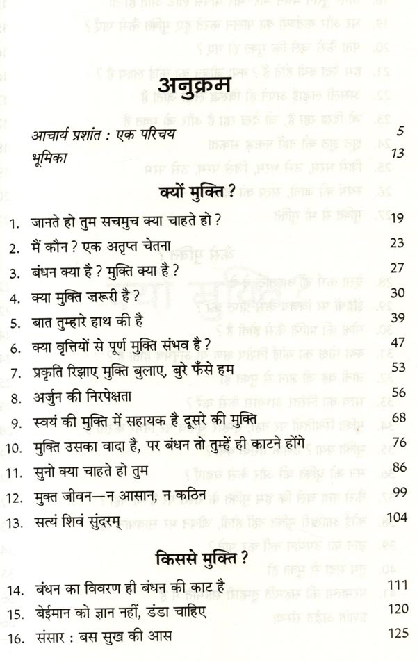 यह किताब पहले बोली और फिर लिखी गई है। वेदांत दार्शनिक और शिक्षक के रूप में आचार्य प्रशांत डेढ़ डेढ़ दशक से अधिक समय से विविध श्रोताओं के साथ संवाद करते रहे हैं। प्रत्येक संवाद आमतौर पर प्रश्नोत्तर के रूप में होता है। प्रश्नकर्ता विविध पृष्ठभूमियों से आते हैं और आचार्य प्रशांत उनकी विस्तृत जिज्ञासाओं का समाधान देते हैं। इस तरह की प्रत्येक बातचीत की लंबाई दस मिनट से एक घंटे तक होती है। इस पुस्तक का प्रत्येक अध्याय ऐसे ही बातचीत प्रसंगों पर आधारित है। प्रत्येक अध्याय यद्यपि एक ही केंद्र से आ रहा है, तथापि वक्ता की प्रतिक्रिया प्रस्तुत प्रश्नकर्ता और उनके विशिष्ट जीवन-प्रश्नों पर है। प्रश्नकर्ताओं में वे सभी भिन्नताएँ मौजूद हैं, जो एक व्यक्ति को दूसरे से अलग बनाती हैं, जैसे कि उम्र, लिंग, आयु, विचारधारा इत्यादि। परिणामस्वरूप जैसे-जैसे पाठक आंतरिक स्पष्टता की चाह से मानवीय परिस्थितियों की सीमा, उलझनों और प्रश्नों की ओर बढ़ते हैं, उनको एक समृद्ध बहुरूपदर्शक परिप्रेक्ष्य मिलता है। और इसी आंतरिक स्पष्टता की चाह में पाठक का सामना होता है अपने बंधनों से तथा संभावित समाधानों से। मानव मन में अगर कोई सबसे आकर्षक शब्द रहा है तो वह है मुक्ति। प्रतिपल हम स्वयं को किसी-न-किसी बंधन में पाते हैं, और वहीं हमारी मुक्ति की तलाश शुरू होती है। अकसर हम अपने बंधनों को खोजने पर पाते हैं कि वे बाहरी हैं, इसलिए हमारी मुक्ति की तलाश भी बाहरी ही होती है। यह तलाश, कहने की आवश्यकता नहीं, अपूर्ण ही रह जाती है। आज के जटिल जीवन में मुक्ति भी हमें जटिल लगने लगी है-इस जटिलता को आसान बनाने का प्रयास इस पुस्तक में किया गया है। यह पुस्तक में किया गया है। यह पुस्तक हमें हमारे मूल बंधनों को देखने की दृष्टि प्रदान करेगी। आचार्य प्रशांत कहते हैं कि बाह्य बंधनों से तो हमें मुक्ति चाहिए ही, परंतु आंतरिक बंधनों और कमजोरियों से मुक्ति और ज्यादा आवश्यक है। हम जन्म से ही स्वयं को बद्ध पाते हैं। ऐसे में हमारा एकमात्र उद्देश्य होना चाहिए अपनी बेड़ियों को काटना। भ्रमित जीवन जीना ही बंधन है और विवेकपूर्वक सत्य का साहसिक चुनाव करना ही मुक्ति है। यह चुनाव हमें ही करना है, तो स्वयं को एक मौका दें। स्वयं को असहाय और कमजोर मानकर बंधनों के साथ जीते रहने में कोई समझदारी नहीं। आपका स्वभाव है मुक्ति। अगर आप भी मुक्त गगन में उन्मुक्त उड़ान भरने के इच्छुक हैं, तो यह पुस्तक आपके लिए है। अस्वीकरण : साधकों और उनके प्रश्नों के बीच बहुत सी विविधताएँ होती हैं, इसीलिए आचार्य प्रशांत के उत्तर भी प्रश्नकर्ता की स्थिति और प्रश्नों के अनुकूल ही होंगे। इन्हें मानकीकृत करना उचित नहीं होगा। कुछ जगहों पर एक अध्याय में दिए गए जवाब ऊपरी तौर से दूसर