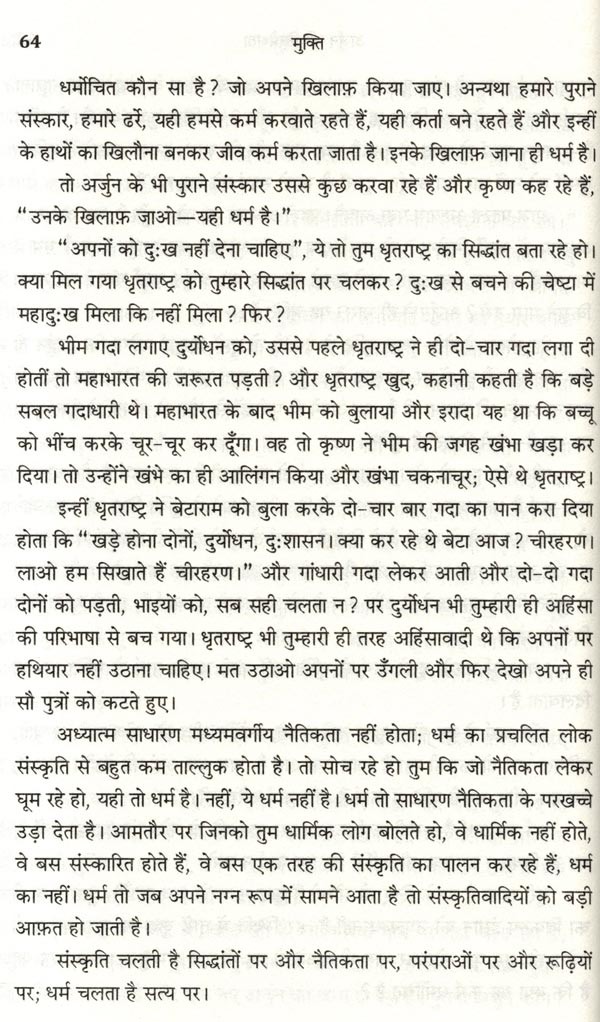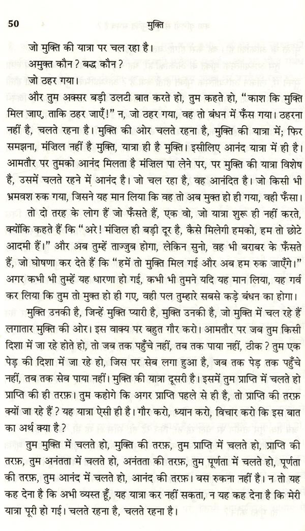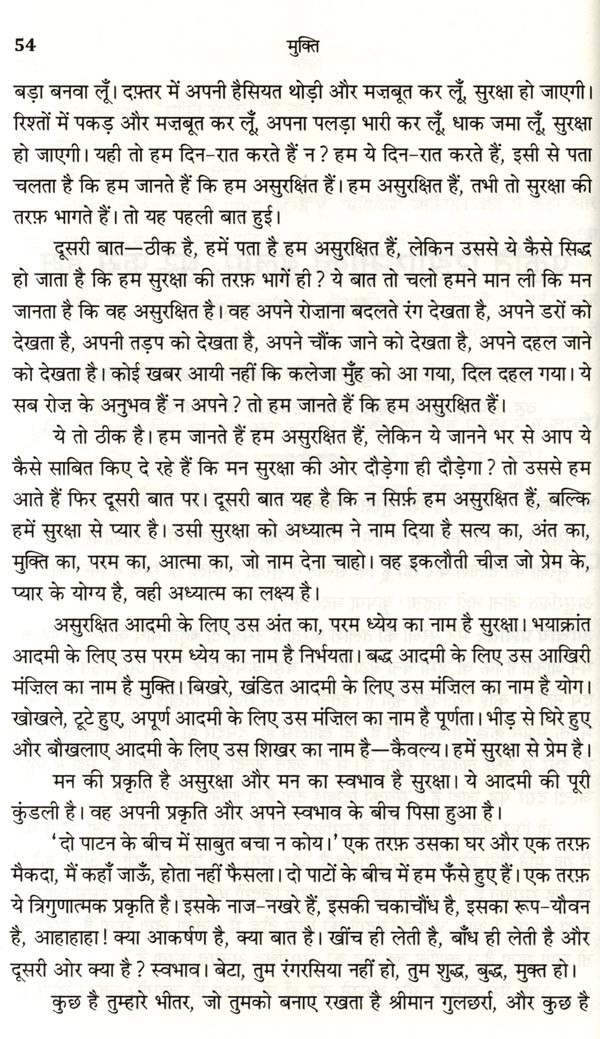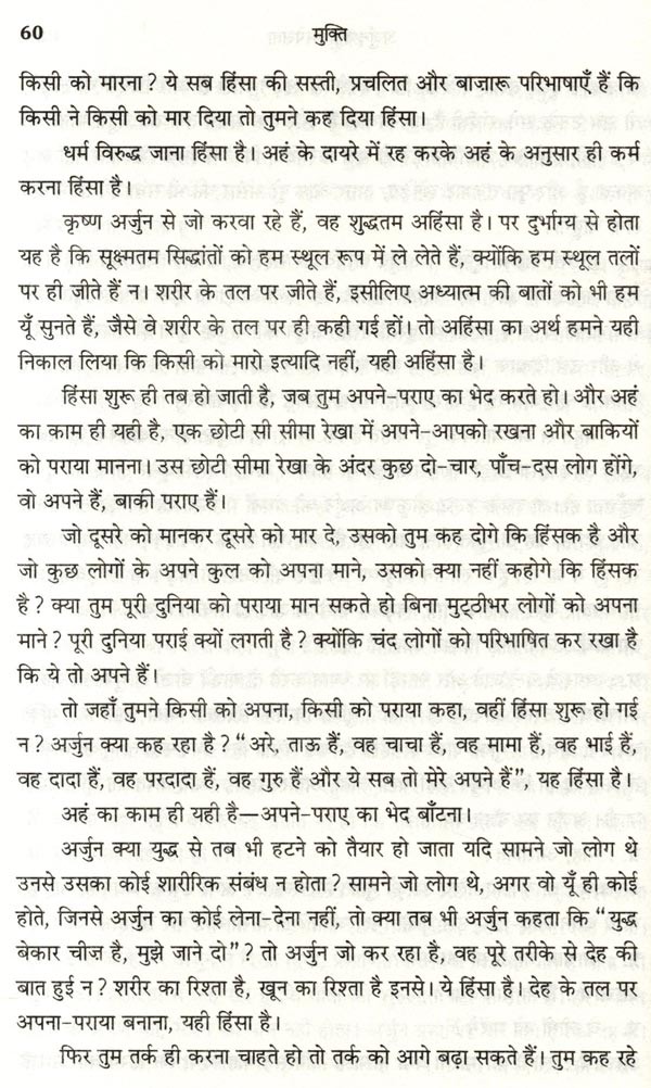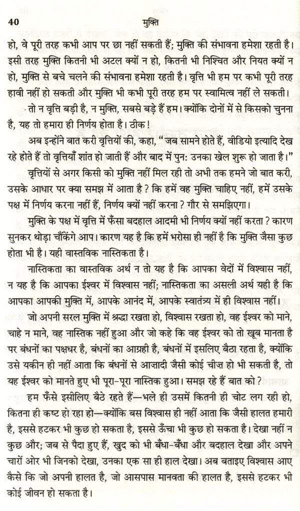 मानव नव मन में अगर कोई सबसे आकर्षक शब्द रहा है तो वह है 'मुक्ति' प्रतिपल हम स्वयं को किसी--किसी बंधन में पाते हैं, और वहीं से हमारी मुक्ति की तलाश शुरू होती है। कुछ अनसुनी फौजी कहानियाँ अकसर अपने बंधनों को खोजने पर हम पाते हैं कि वे बाहरी हैं, इसलिए हमारी मुक्ति की तलाश भी बाहरी ही होती है। यह तलाश, कहने की आवश्यकता नहीं, अपूर्ण ही रह जाती है। आचार्य प्रशांत कहते हैं कि बाह्य बंधनों से तो हमें मुक्ति चाहिए ही, परंतु आंतरिक बंधनों एवं कमज़ोरियों से मुक्ति और ज़्यादा आवश्यक है। हम जन्म से ही स्वयं को बद्ध पाते हैं; ऐसे मात्र उद्देश्य होना इंड़ियों को काटना। में चाहि जीवन जीना ही बंधन है और विवेकपूर्वक सत्य का साहसिक चुनाव करना ही मुक्ति है। यह चुनाव हमें ही करना है तो स्वयं को एक मौका दें। स्वयं को असहाय और कमज़ोर मानकर बंधनों के साथ जीते रहने में कोई समझदारी नहीं। आपका स्वभाव है मुक्ति। अगर आप भी मुक्त गगन में उन्मुक्त उड़ान भरने के इच्छुक हैं, तो यह पुस्तक आपके लिए है।