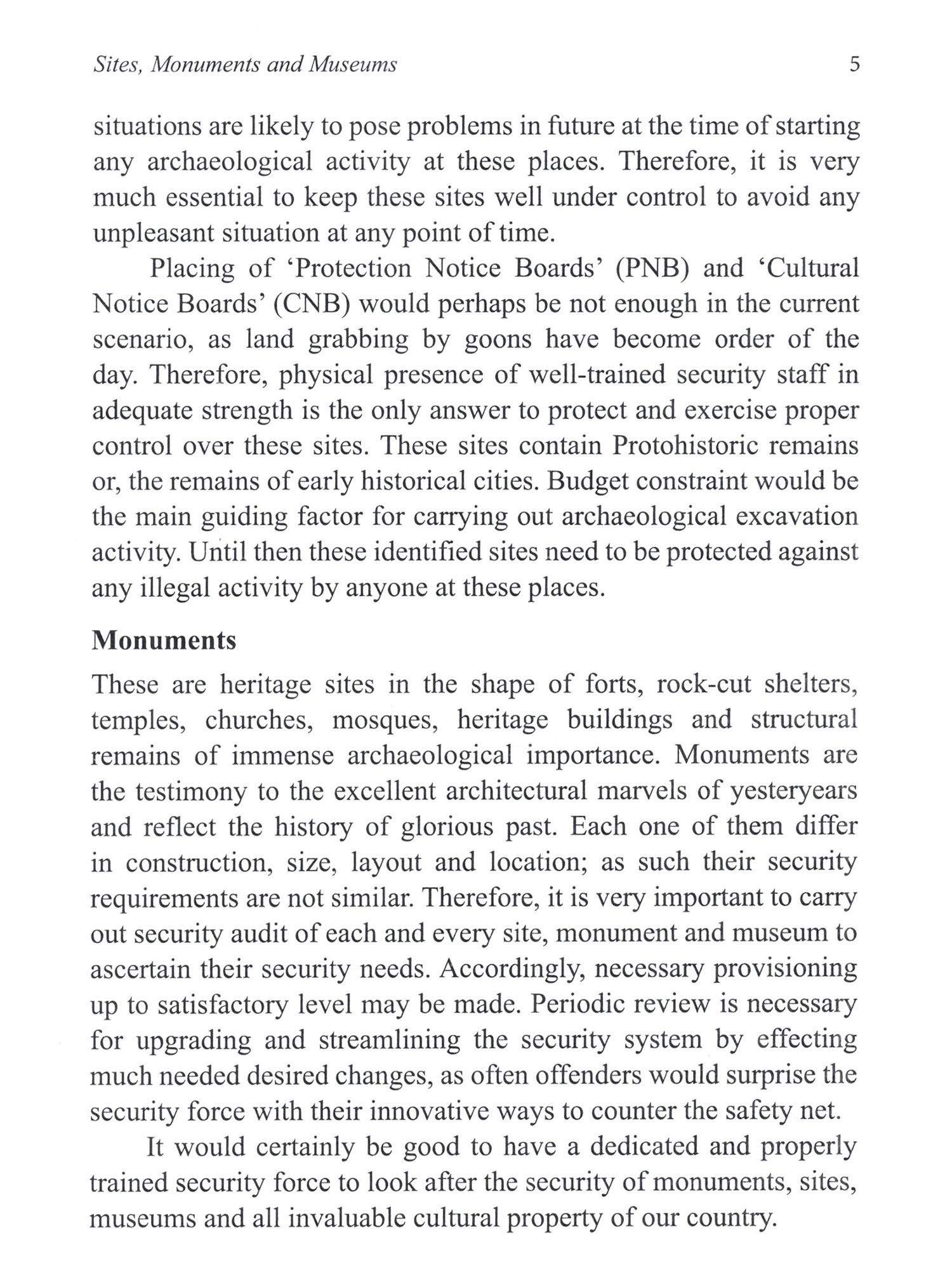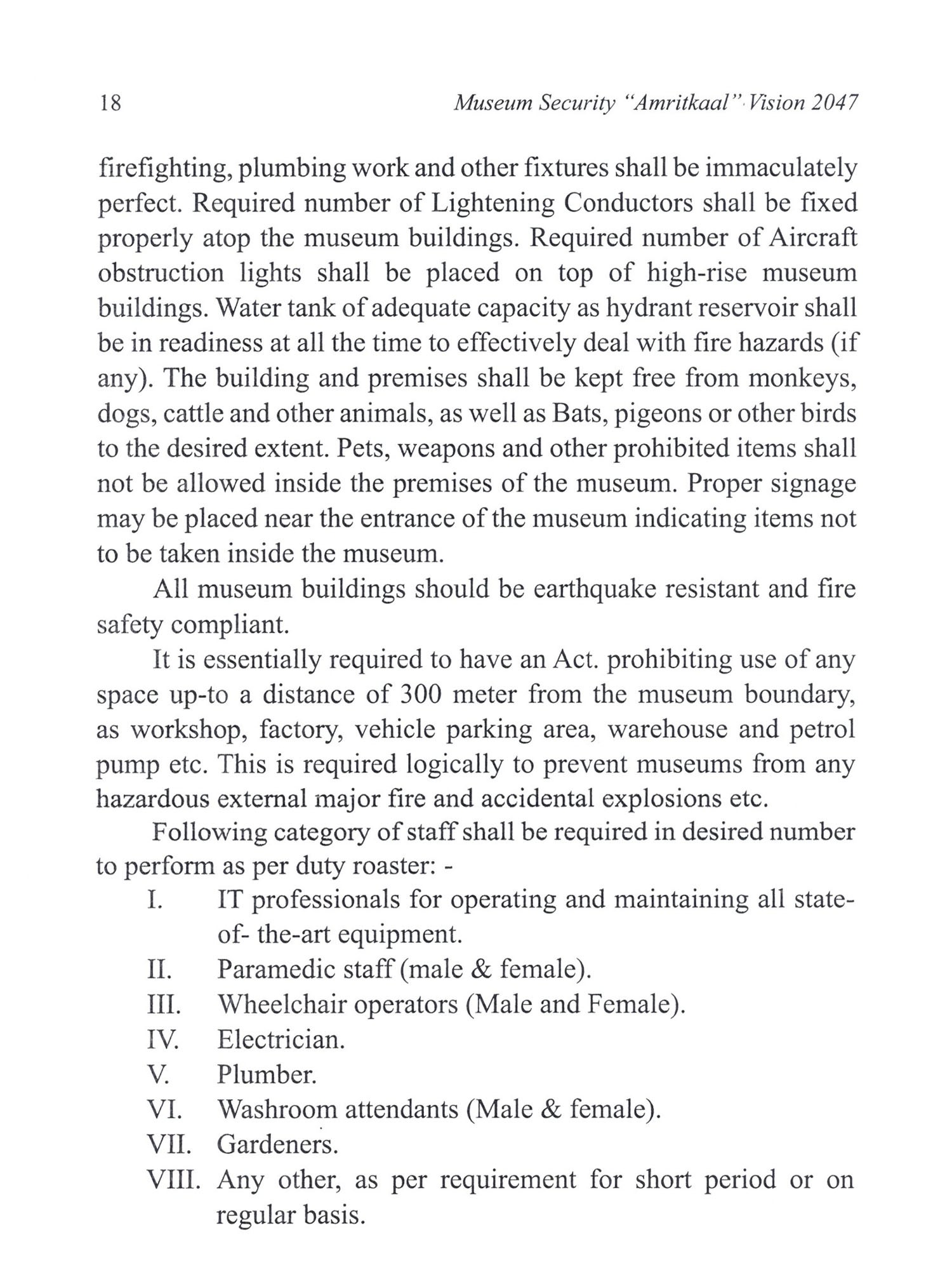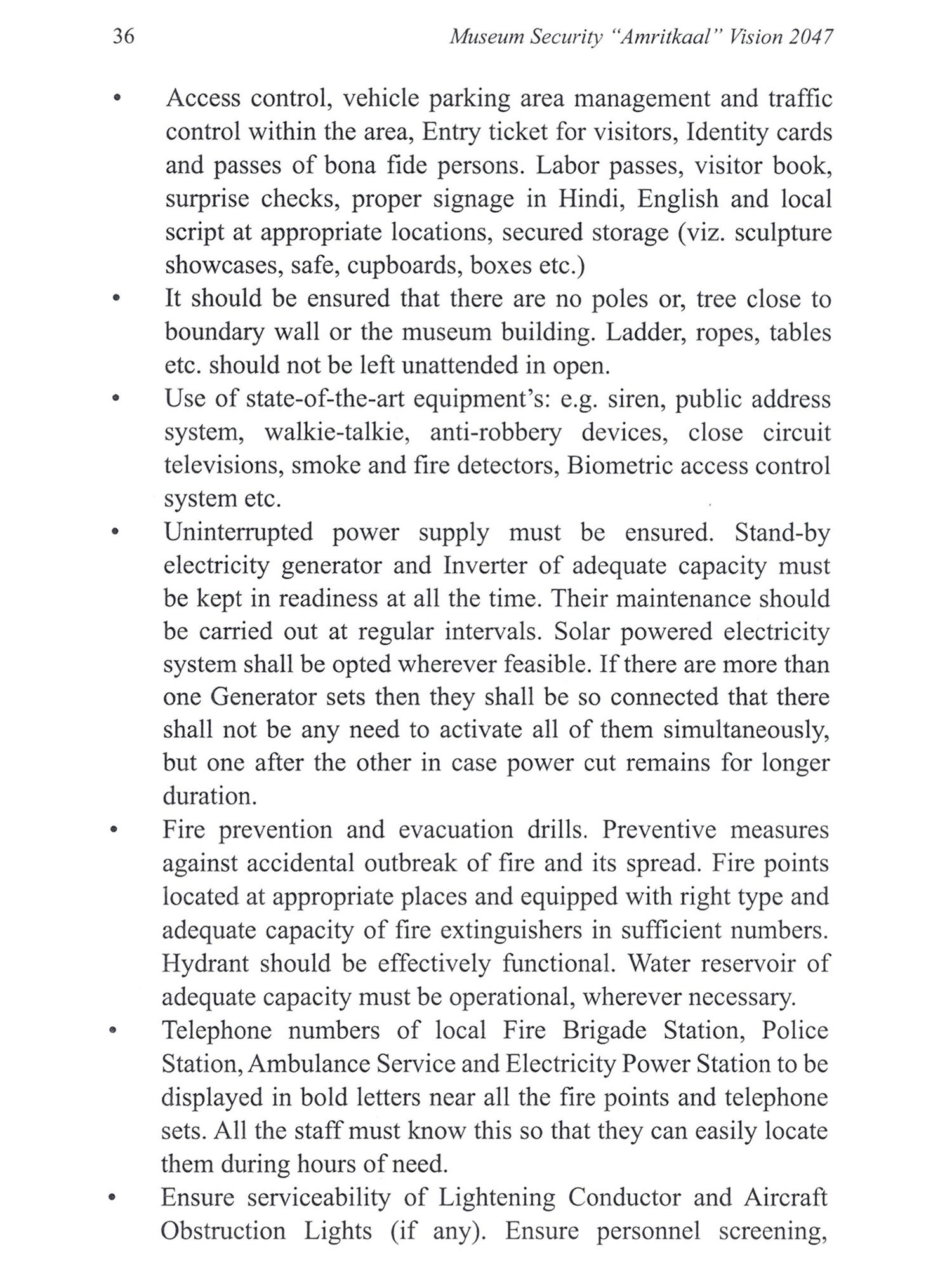 Ancient heritage remains and invaluable cultural property attract visitors and art connoisseurs from across the world to different destinations. India being one of the richest depository of ancient cultural remains happens to be the most popular destination for global visitors. More so, very many ancient heritage sites in India are unguarded, and so are very many strewn statues and ancient iconic cultural property at a number of places which happen to be happy grazing ground for the antisocial elements of the society involved in illicit trafficking of invaluable ancient treasure. Thereby, country does not only loose them but, history gets lost as each of the antiquity and cultural property represent the socio economic strata of the place and era they belong to. Thus the importance of museums may well be understood in taking care of their collections safe and secure for future generations to view, study and learn about glorious past. There is mutual understanding between several countries for repatriation of stolen antiquities to their original country. In recent past, there have been instances when India has received such icons 2 Museum Security "Amritkaal" Vision 2047 from Canada, Australia, U. S. and some other countries. But, this would be possible only when their whereabouts are traced and ownership proved. Every country has own policy with regards to ancient monuments and cultural property. There are internationally recognized auction houses in some countries who auction the acquired antique items on a regular basis. India has been successful in retrieving some priceless collections from them even by paying their cost. Jewelry of Nizam of Hyderabad is one such example. Even, our honorable prime minister took personal interest in retrieving iconic antique pieces from several affluent countries, in recent past. Obviously, there is a need to enforce some stricter ways to protect our heritage remains from being smuggled out of the country. Besides, there are a number of security related matters for the archaeological wealth to be taken care-of. Sustainability should be the key factor in ensuring continuity of any security related system. This calls for raising a dedicated security task force to cover all the museums, monuments and tourist sites as they are the revenue earners for our country. Presently, there is no single organized taskforce to take care of above places. Personnel from different security agencies viz, departmental watch and ward staff, private security agencies, state police, Home Guard and CISF personnel are posted at different locations and are functioning independently. None of them have special training for providing proper and desired security cover to the museums, monuments and sites. Security has a very big canopy to perform with diligence and perseverance. "Be polite but firm" should be the key-word for the security personnel while dealing with the visitors in impressing them with "Do's and Don'ts" at museums and monuments. This calls for imparting very good training on behavioral attitude to all the security personnel.
