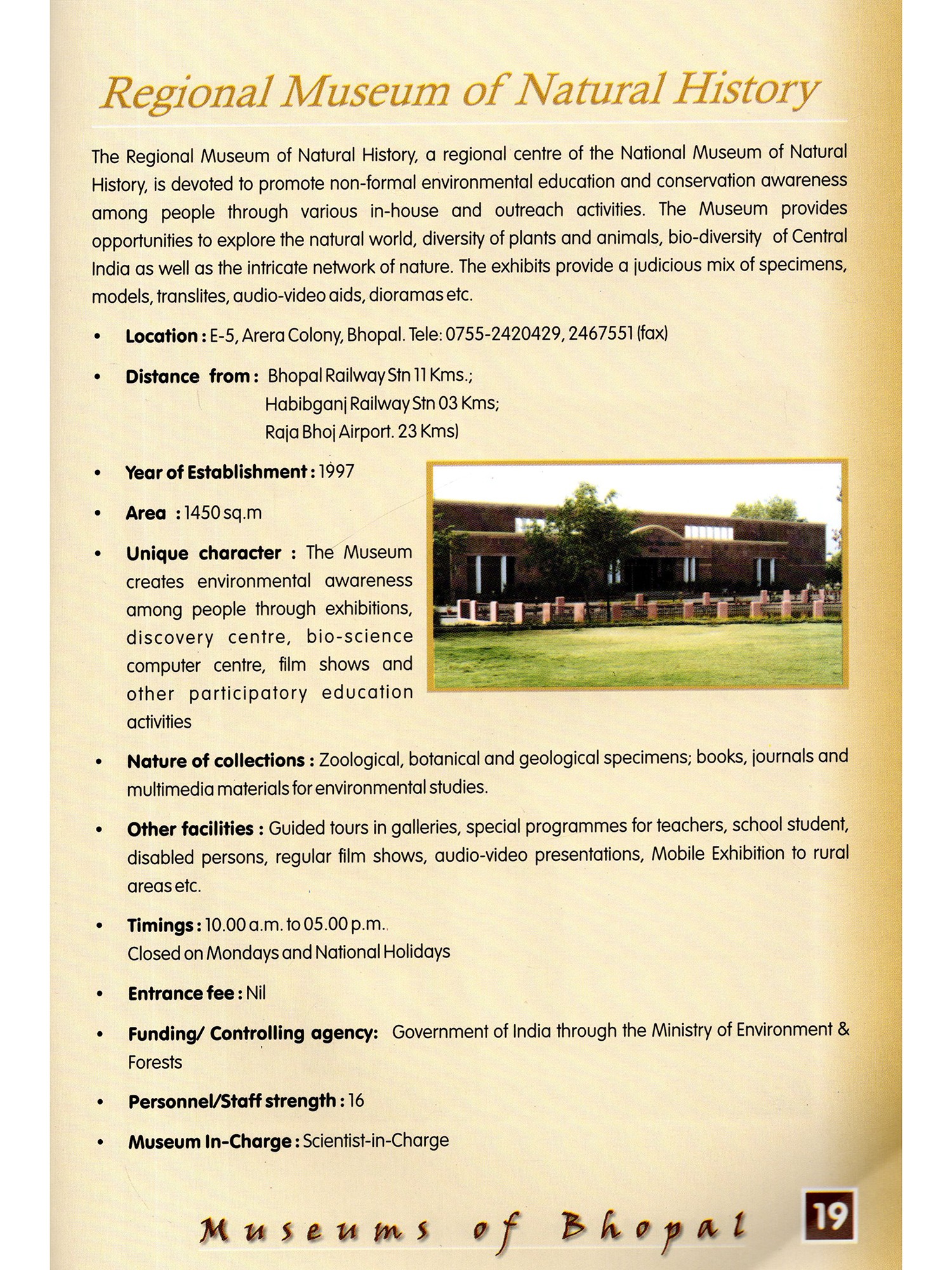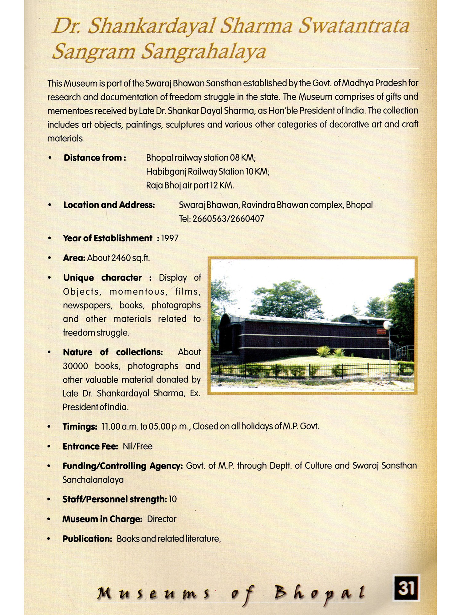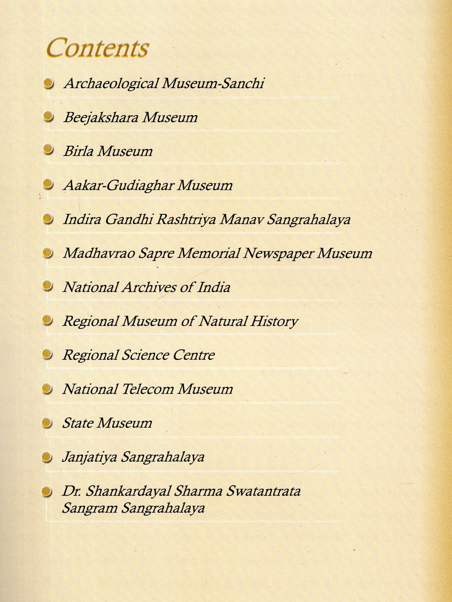Museums provide creative aspirations and focus attention on human cultures and natural heritage Greater integration between museums would help in making it more successful across the Country The present publication by Indira Gandhi Rashtriya Manav Sangrahalaya is the outcome of this collective effort of the museums at Bhopal to promote the roles of the respective museums I am grateful to the heads of all the museums who have supplied necessary information about their museums within a very short notice. Without their cooperation this would not have been possible Compilation of this book let is a joint effort of my colleagues in the IGRMS, especially Shri A.K. Tiwari Shri G Jayaprakasan, Shri K. Seshadri, Shri Tapas Biswas, Shri Manoj Jain and others, on the occasion of the Museum Day Celebrations 2004 I am thankful to all of them for their efforts and timely publication of this.