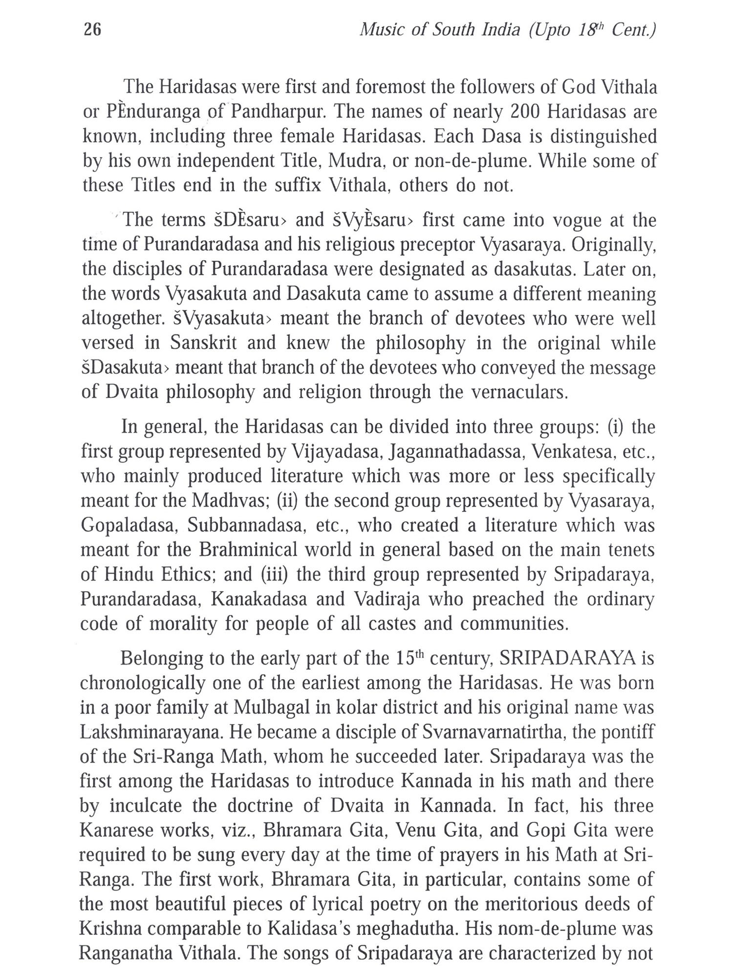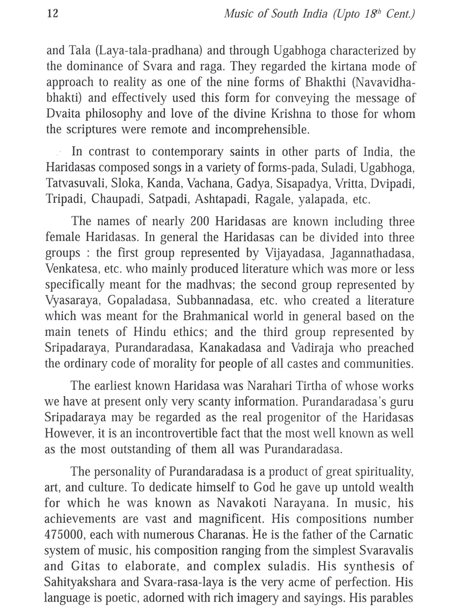 This volume is a brief but descriptive journey to understand the development of South Indian music between 13th cent. to 18th century period, the latter period being categorized as the Golden Period of Carnatic music. The complete growth of Indian music in general and Carnatic (South Indian) music is particular can be visualized during this period. Through their extensive research, the Authors have included in this volume the varied aspects of musical development into Pre-Trinity and Trinity period. In the Pre-Trinity period the contributions of Jayadeva, the author of Ashtapadi, Puradandara Dasa, the father of Carnatic music, Haridasa composers from Karnataka, the contribution of King Shahaji who had established his musical genius in the Cauvery delta, the seat of the Golden Period of Music who was also the precursor of the Musical Trinity. The chapter on the Margadarsi Seshayyangar, the lesser known Musical guru for the Golden Age of carnatic music is very informative and connects the Pre-Trinity and Trinity period. In the Trinity period the musical contribution of Muthuswami Dikshitar, Swati Tirunal Maharaja and Tyagaraja are dealt in different sets of articles. Muthuswami Dikshitar's musical touch relating to Navagrahas. inclusion of Hindustani style of Music into his compositions, his wide travelogue to most of the South Indian Temples (Kshetras) and the remarkable compositions of the 16 (Shodasa) form of Ganesha are dealt in this section. The section of Swati Tirunal Maharaja deals with two aspects of the composer²(i) The Rare ragas dealt by the Royal Composer and (ii) the scholarly Pardavarnas. The next section is devoted to the Contribution of Tyagaraja: The section deals with 2 His devotion to music, handling of Rare Ragas, study of his three Musical operas, Group Kritis or pancharatna form of compositions, exclusive Rhythmic patterns in his songs and finally the philosophical content in Tyagaraja's compositions. We are sure the lovers of Indian Music in India and abroad would find the materials presented in this volume very useful, informative, and resourceful and benefit expansion of their knowledge. We are extremely thankful to Mr. Praveen Mittal, the CEO of the Publishing Company, B.R. Rhythms and Mr. Neeraj Mittal, Director of B.R. Publishers, New Delhi for readily accepting to publish this volume. Their suggestions in the preparation of the Manuscript were very useful and fruitful.