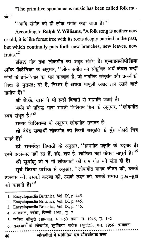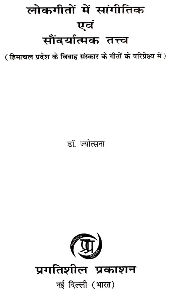 सीमाएँ माएँ किसी भी प्रदेश के संगीत को अपनी परिधि में बाँध नहीं सकी हैं। संगीत ने सबसे ऊपर समस्त चराचर को अपने नादात्मक पंखों के आवरण में इस प्रकार ढक रखा है कि सभी जीव-जंतु एवं मनुष्य संगीत के जादुई प्रभाव से मोहित रहते हैं। यह उक्ति उस समय और भी सार्थक हो जाती है जब संगीत के स्वर में प्रकृति का नैसर्गिक संगीत घुला हो। डॉ. ज्योत्सना द्वारा लिखित पुस्तक 'लोकगीतों में सांगीतिक एवं सौंदर्यात्मक तत्त्व' इस दिशा में सार्थक प्रयास है। इस पुस्तक में लेखिका ने लोकगीतों के विशिष्ट गुणों एवं विशेषताओं का सुंदर वर्णन किया है। श्रुति-स्वर संबंध, स्वरों के लगाव, ताल-लय तथा स्वर-रसोत्त्पत्ति का लोकगीतों के संर्दर्भ में सुंदर विवेचन प्रस्तुत किया है। लोकगीतों के संगीतिक एवं सौंदर्यात्मक तत्त्वों का हिमाचल प्रदेश के विवाह संस्कार लोकगीतों के संदर्भ में सारगर्भित आंकलन सराहनीय है। लेखिका ने लोकगीतों में प्रयुक्त श्रुति-स्वर समन्वय को सुंदर एवं सरल ढंग से प्रस्तुत किया है। हिमाचल प्रदेश के लोकगीतों में प्रस्तुत गमक तथा मींड से उत्त्पन्न विशेष प्रकार की खनक एवं माधुर्य गुणों से पाठकों को अवगत कराने का प्रयास किया गया है।