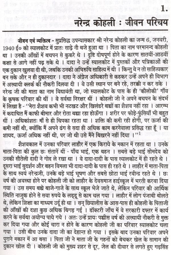 प्रथम अध्याय में नरेन्द्र कोहली के जन्म और जीवन सम्बन्धी तथ्यों का संक्षिप्त परिचय देने का प्रयास किया गया है। नरेन्द्र कोहली की बहुमुखी प्रतिभा एवं प्रखर व्यक्तित्व सम्बन्धी उपलब्ध तथ्यों को संक्षेप में प्रस्तुत किया गया है। इसी अध्याय में कोहली जी के प्रकाशित साहित्य का विवरण भी प्रस्तुत किया गया है। साथ ही कोहली जी के पौराणिक उपनयासों का वस्तुगत परिचय प्रस्तुत किया गया है।