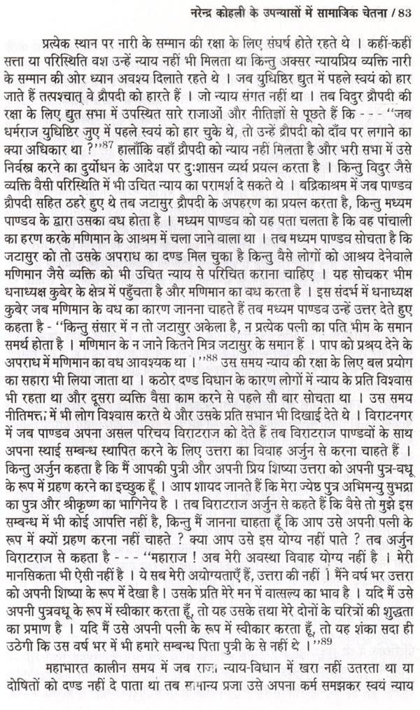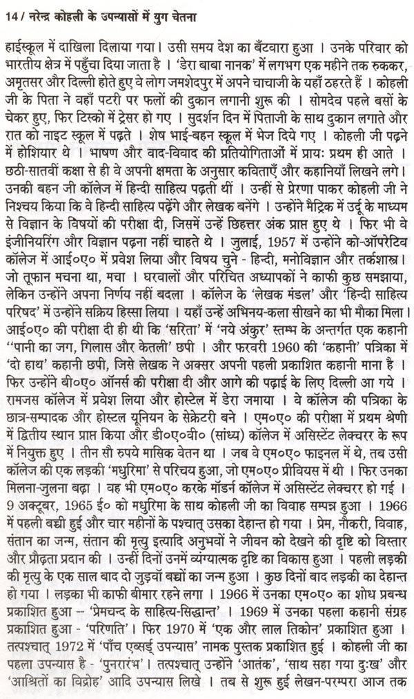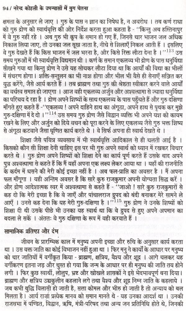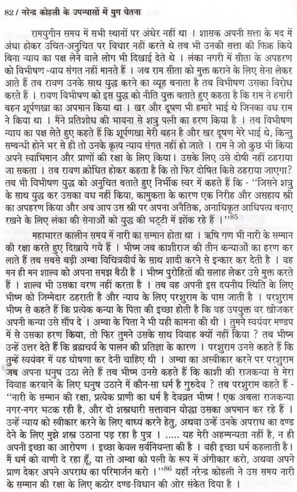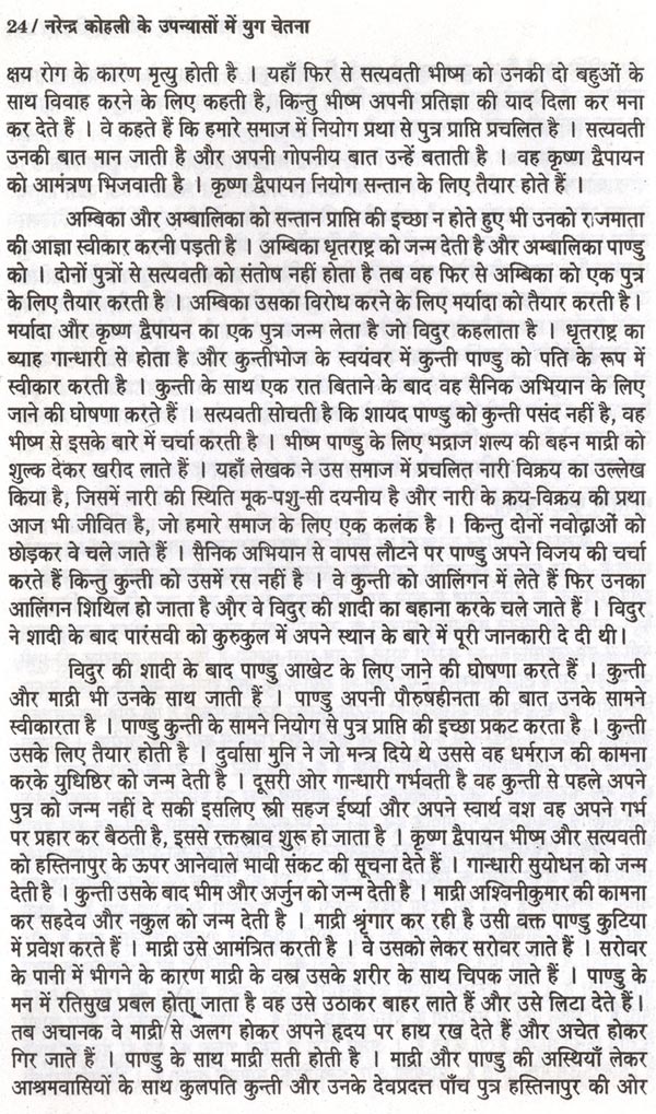 प्रस्तुत शोध-प्रबन्ध का प्रतिपाद्य "नरेन्द्र कोहली के उपन्यासों में युग-चेतना" है। मैंने अपना अध्ययन पौराणिक उपन्यासों तक सीमित रखा है, जिससे विषय की गहराई से छान-बीन की जा सके। नरेन्द्र कोहली भारतीय अस्मिता और भारतीय संस्कृति से गहरा लगाव रखने वाले आधुनिक रचनाकार हैं। एक रचनाकार के रूप में उनका उद्देश्य है - पाठकों को अपनी सांस्कृतिक धरोहर से परिचित कराना तथा संस्कारों के धरातल पर जीवन के विवेक और कर्तव्यबोध से संपृक्त कराना। रामकथा और महाभारत-कथा की घटनाओं का तर्क संगत, बुद्धिवादी, समाजशास्त्रीय, राजनीतिक और ऐतिहासिक विश्लेषण कर उन्हें युगीन संदर्भों से जोड़ने में कोहली जी सफल सिद्ध हुए हैं। कोहली जी ने अपने युग की सामाजिक, राजनीतिक, धार्मिक, सांस्कृतिक समस्याओं की गुत्थियों को पौराणिक घटनाओं एवं चरित्रों के माध्यम से उद्घाटित करने और सुलझाने का सार्थक प्रयास किया है।