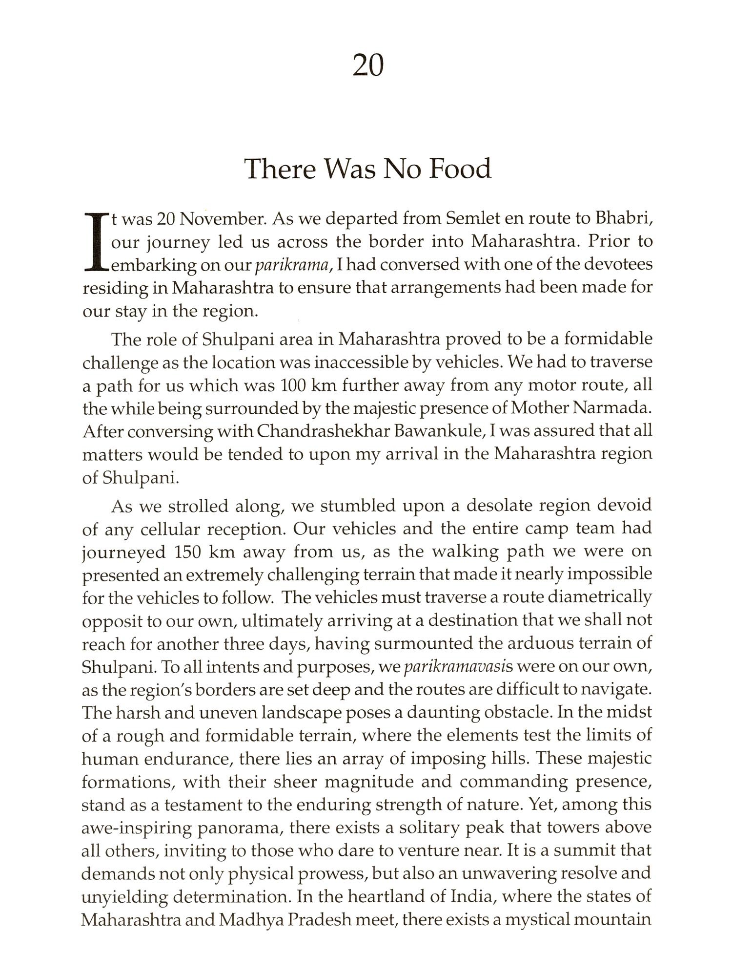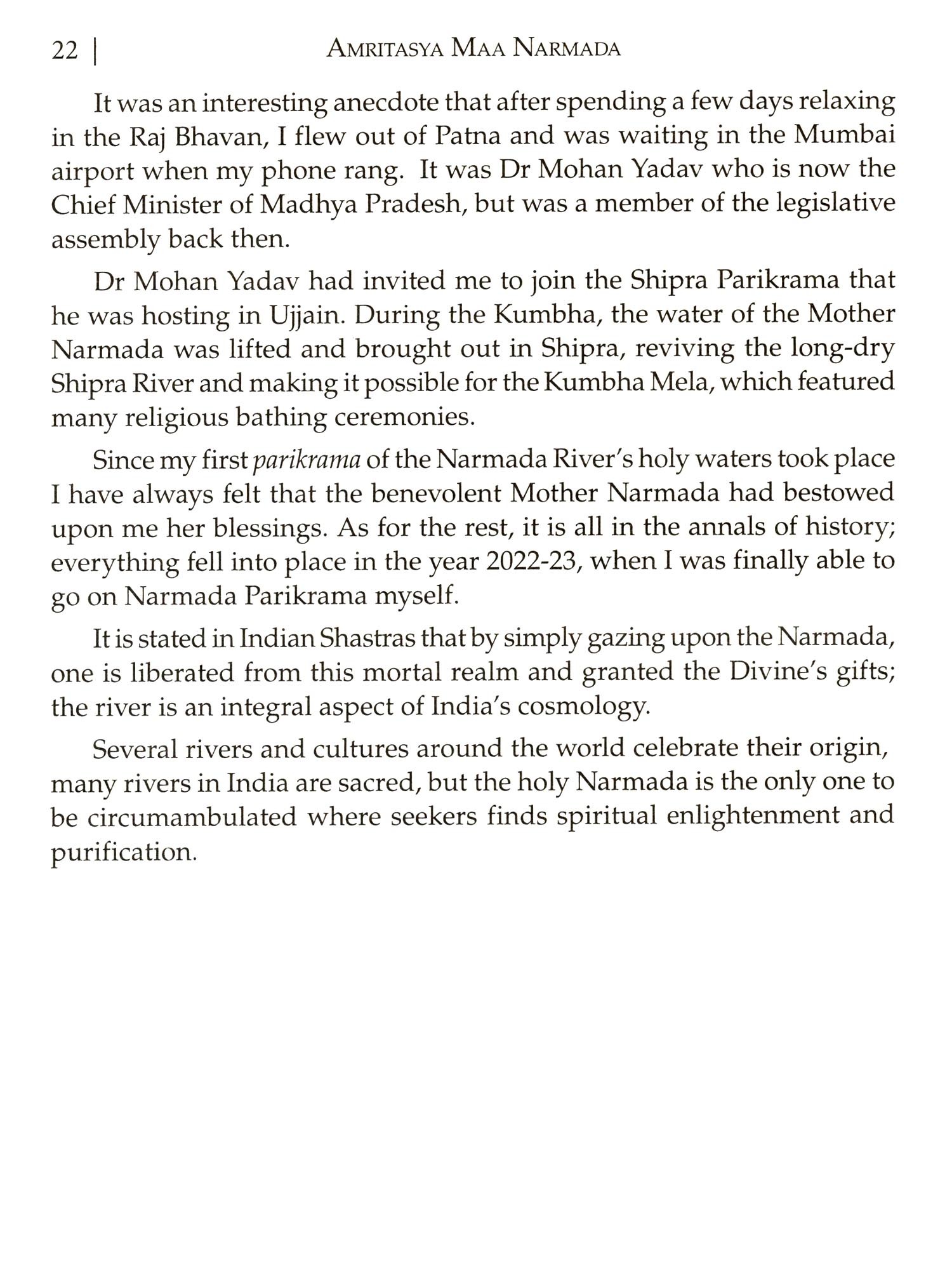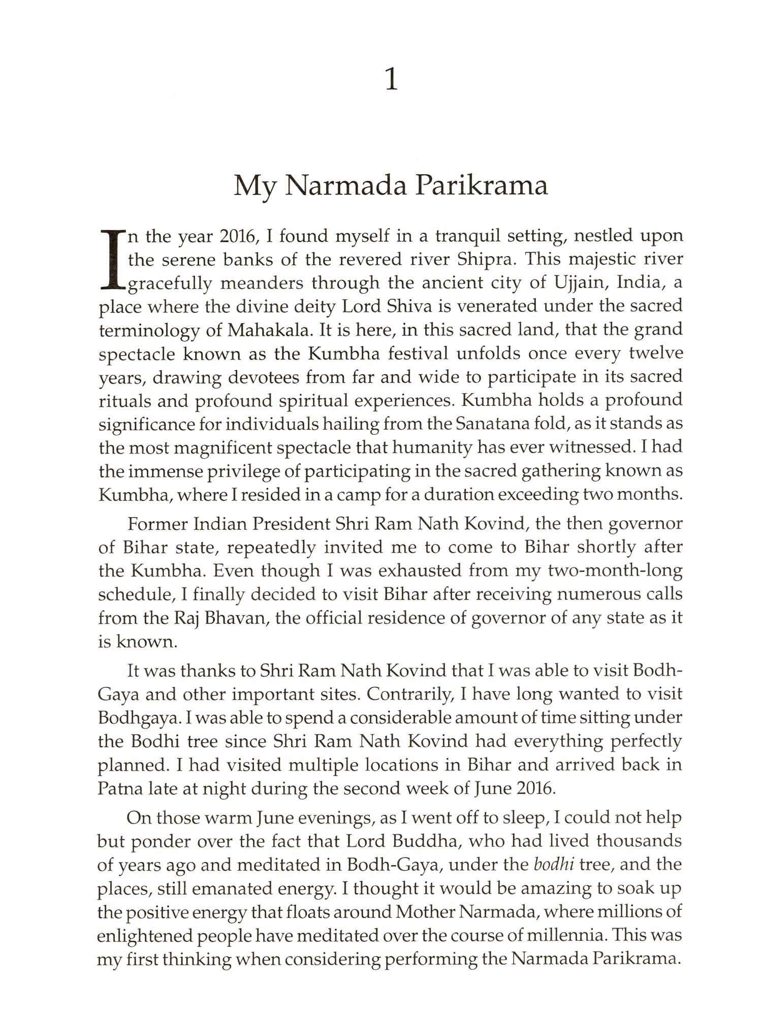 In the year 2022-23, I embarked on a remarkable journey known by the name "Amritasya Ma Narmada Pada-Parikrama". Accompanied by a group of seventeen individuals and a dedicated team of over fifty supporting staff, we set out to traverse the majestic banks of the Narmada River, spanning an impressive distance of over 3,000 km. It has long been customary to walk along the banks of the holy River Narmada and complete its circumambulation. In the pages that follow, I shall recount the profound journey that unfolded before me during the sacred ritual known as the parikrama. Within the hallowed realms of this book, I shall endeavour to capture the essence of my extraordinary experience, as I embarked upon a spiritual odyssey like no other. With each step taken, I traversed the path of devotion, immersing myself in the timeless traditions and sacred practices. In the depths of my literary collection, there lies another book that delves into the sacred realm of knowledge, focusing solely on the hallowed tirtha-sthala that I, with great fervour, had the privilege of rediscovering during my profound parikrama. In the pages that follow, (I invite you, the reader, to embark on a remarkable journey alongside me.) Within the confines of this book, I shall recount the tale of one of the most arduous walks I have ever undertaken. It is a narrative that seeks to illuminate the depths of my experience, shedding light on the encounters I had with fellow travellers and the heartfelt conversations I shared with the innocent souls of children. In the pages of this book, you will find a captivating narrative that delves into the depths of my personal experiences, intricately woven with the rich tapestry of firthas' history. (However, should one's sole interest lie in the exploration of tirthas, there exists another literary work dedicated solely to providing comprehensive details about the sacred tirthas situated along the revered banks of the holy Narmada).