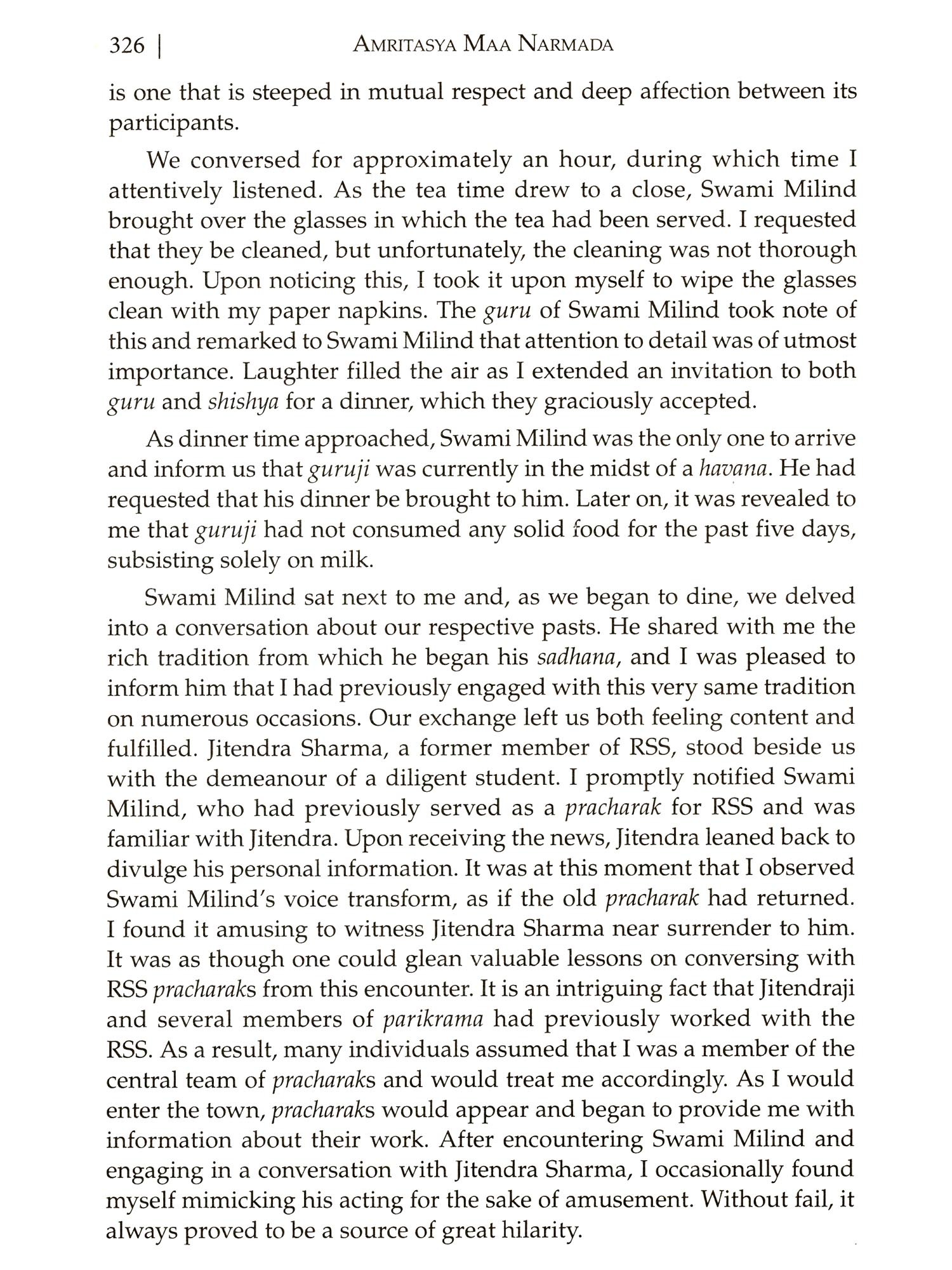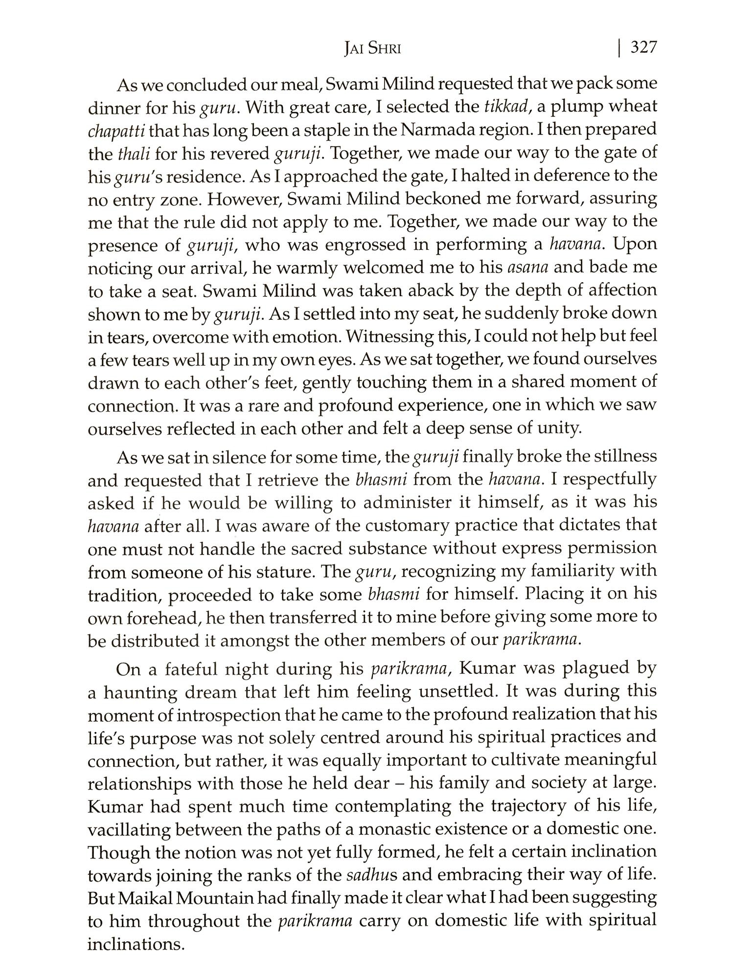 Since the dawn of human civilization and historical literacy, the sacred River Narmada has been honoured with rituals of adoration and circumambulation in India. The River Narmada holds great spiritual significance for millions of people, who believe that bathing in her holy waters can cleanse their sins and bring them closer to salvation. Her revered status is further reinforced by the numerous temples and shrines that have been built along its banks, attracting pilgrims even from far and wide. According to the ancient Indian Shastras, there exists a profound act that is considered among the holiest endeavours one can undertake the circumambulation of the revered Narmada River. The circumambulation, also known as parikrama, involves walking the entire length of the Narmada River on both banks, which spans over 3,000 km. This sacred journey is believed to purify the soul and grant blessings to those who undertake it. It has been my experience that completing the parikrama can bring immense spiritual growth and deepen one's connection with the divine. This profound practice not only serves as a vital component of sadhana, but also entails the Hindu Sanatana history, accords these tirthas (pilgrimage sites) a great deal of significance and credits various deities with blessing them. These sacred pilgrimage sites, established through countless religious endeavours and spiritual practices by a multitude of revered individuals, span across numerous epochs. The act of visiting those sacred tirthas during the parikrama is the very essence that gave birth to this ancient tradition of parikrama. I was following the footsteps of countless saints and other holy individuals when I started my walk of the parikrama. But I was also careful to adhere to the customs established by the Great Saint Shri Gaurishankar Maharaj, so I walked every day, made sure the pilgrims ate together and offered communal food (saha-bhojana) as it is known in India, wherever we spent the night