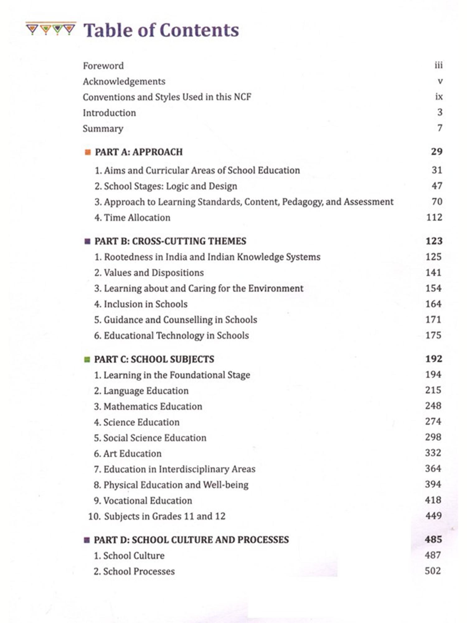 The National Education Policy 2020 (NEP 2020) called for a complete transformation of India's schooling system to make it of the highest quality for all students equitably, and to serve the needs and aspirations of the country and its people, today and for the future. The purpose of this National Curriculum Framework for School Education (NCF-SE, in short NCF) is to help in bringing about such changes by effecting corresponding positive transformations in India's school curricula.