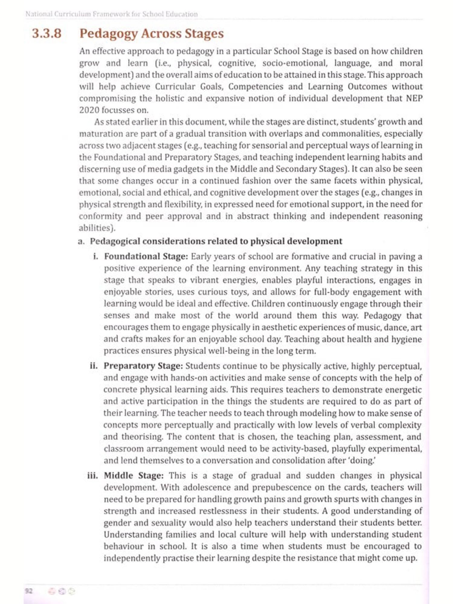 This is the first ever integrated Curriculum Framework for children between ages 3-18 in India. It is a direct outcome of the 5+3+3+4 'curricular and pedagogical structure that NEP 2020 has come out with for School Education. To ensure appropriate focus and fillip to the Foundational Stage (ages 3-8), the detailed National Curriculum Framework for Foundational Stage (NCF-FS) was released on 20 October 2022, by the Hon'ble Minister of Education, which is integrated within the NCF-SE. The National Curriculum Frameworks for Teacher Education, and for Adult Education, will follow shortly.