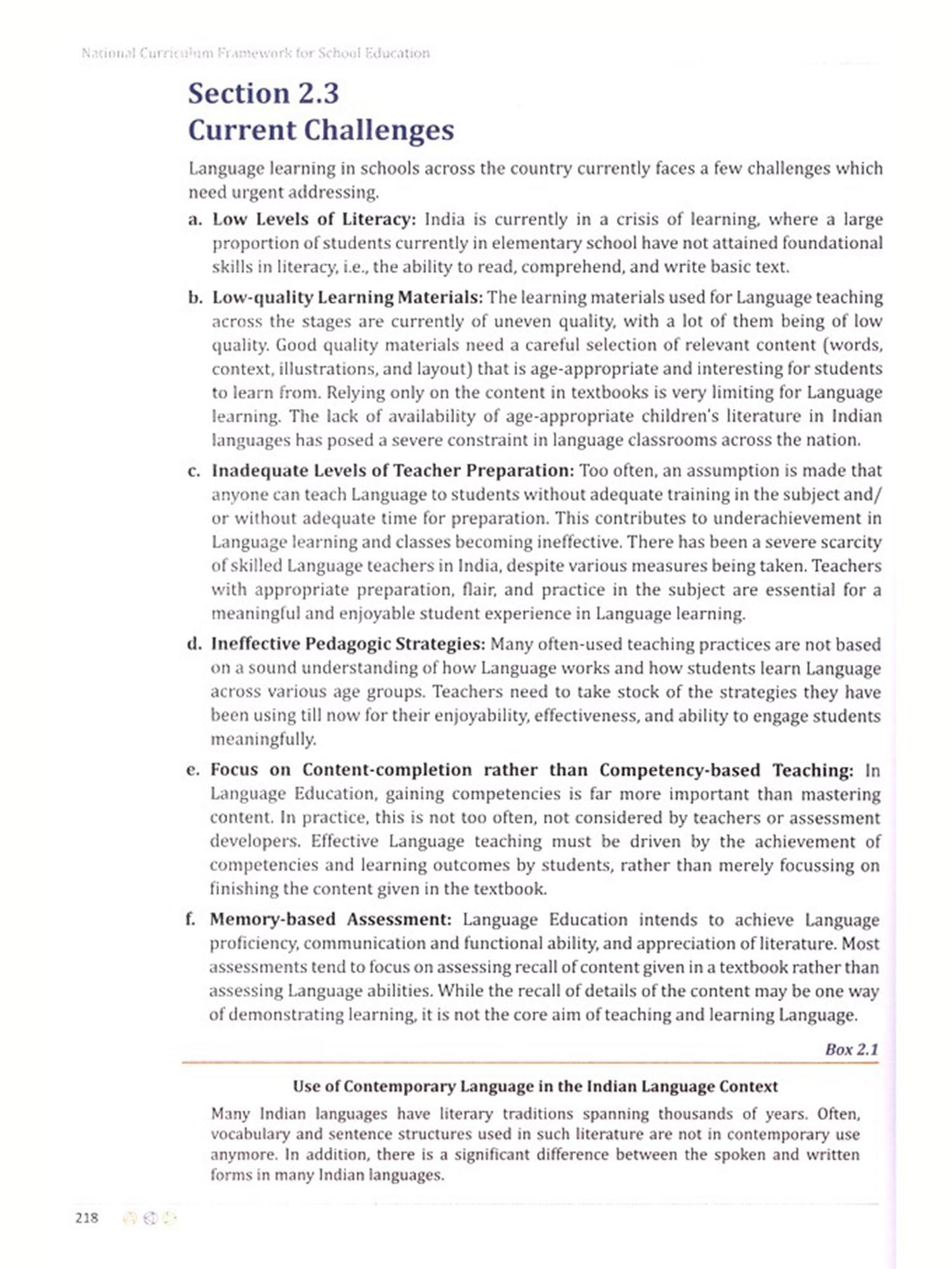While the NCF-SE is informed by this collective knowledge and wisdom, the real challenge has been to analyse these inputs and develop a cogent, pragmatic, and effective synthesis that will enable changes in practices on the ground. This, in turn, has called for the NCF-SE to be presented in a language, structure, and with a variety of illustrations, such that practitioners, including most importantly Curriculum and Syllabus Developers, Teaching-Learning-Material Developers, and Teachers, should be able to relate it to their current realities. I emphasise this aspect of the work of this Committee, primarily, to highlight the several challenges arising from the needs of developing innovative methods and approaches.